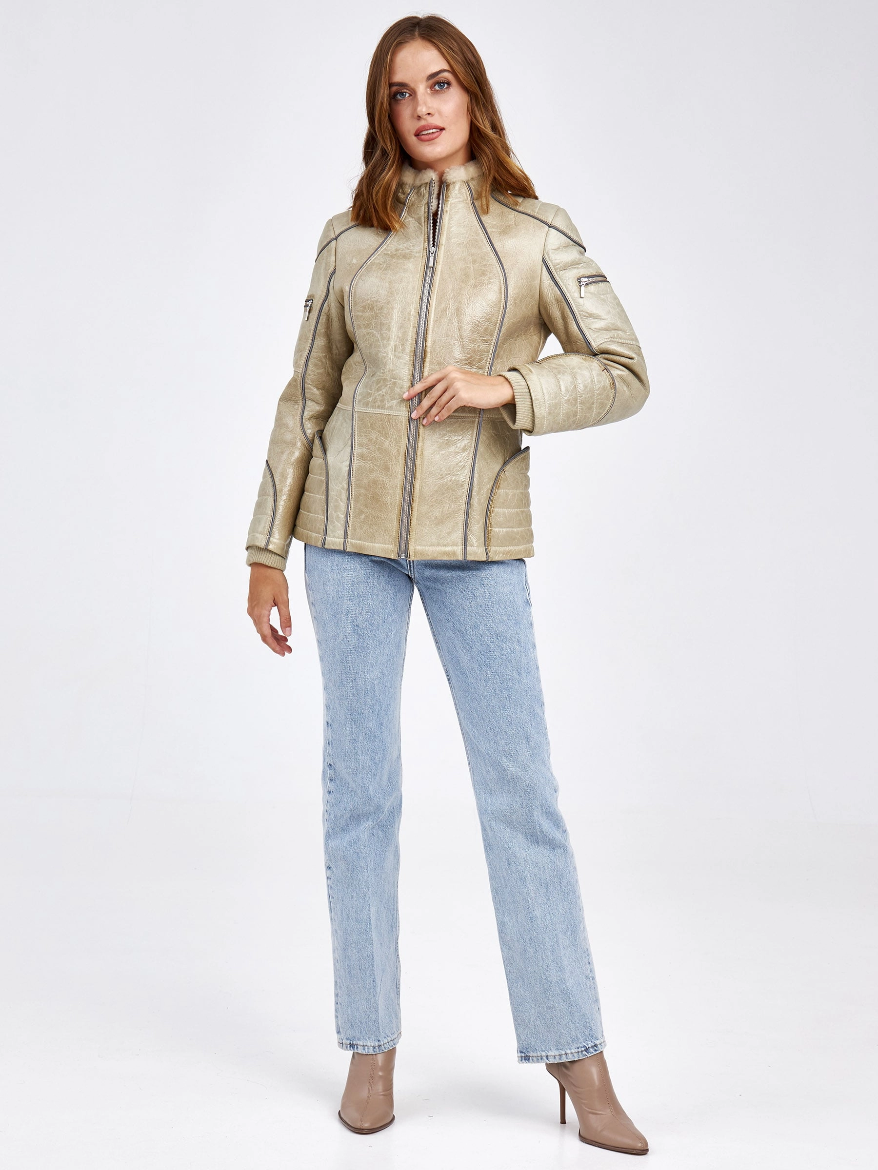 Товар спортивная комбинированная женская дубленка см-4, бежевая, размер 42, артикул 62540 выполнен из овчина "мерино" с застежкой молния. Рассчитан на сезон: осень-зима. Длина изделия 51-74 см, силуэт полуприлегающий.