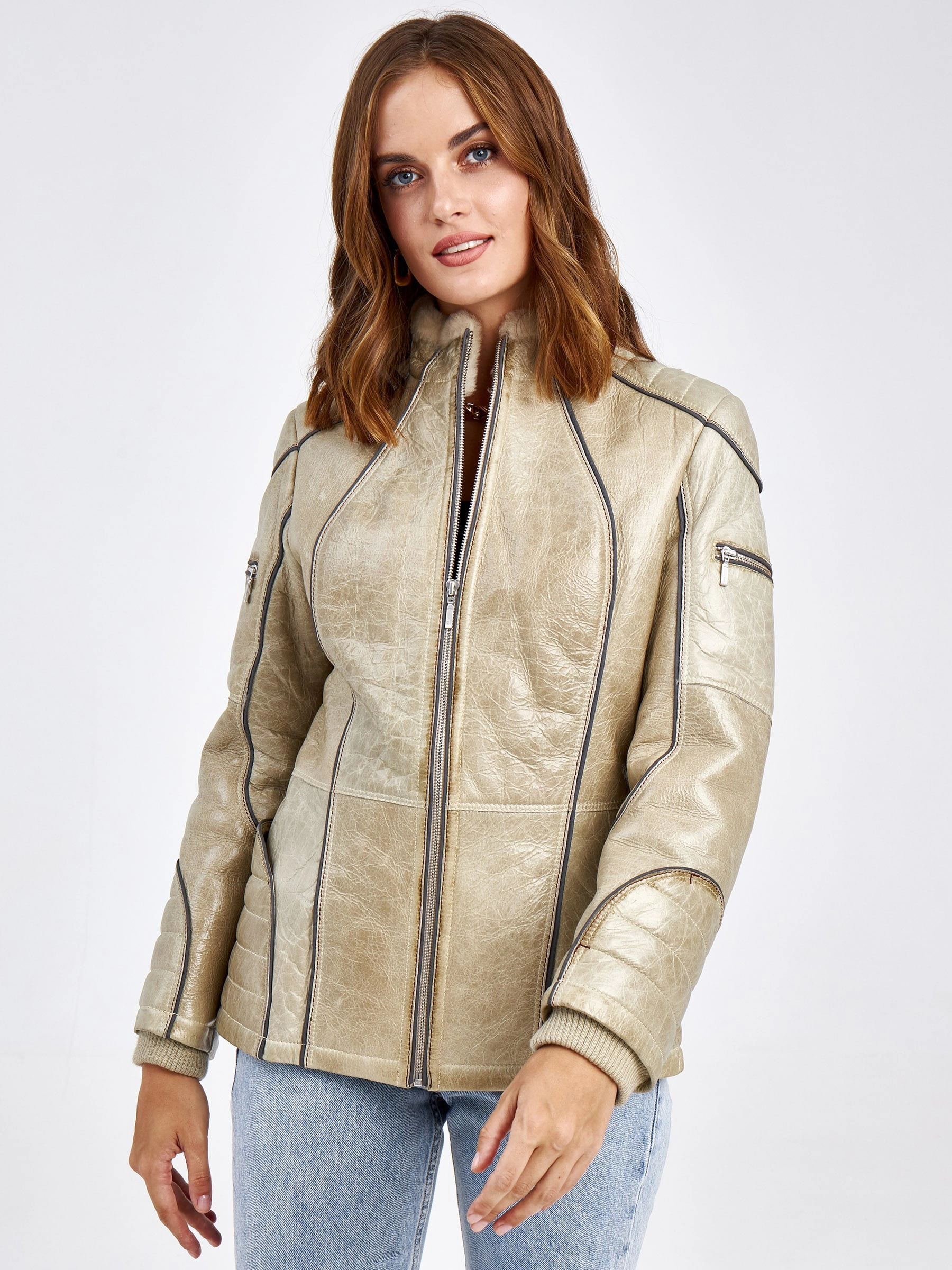 Спортивная комбинированная женская дубленка СМ-4, бежевая, размер 42, артикул 62540