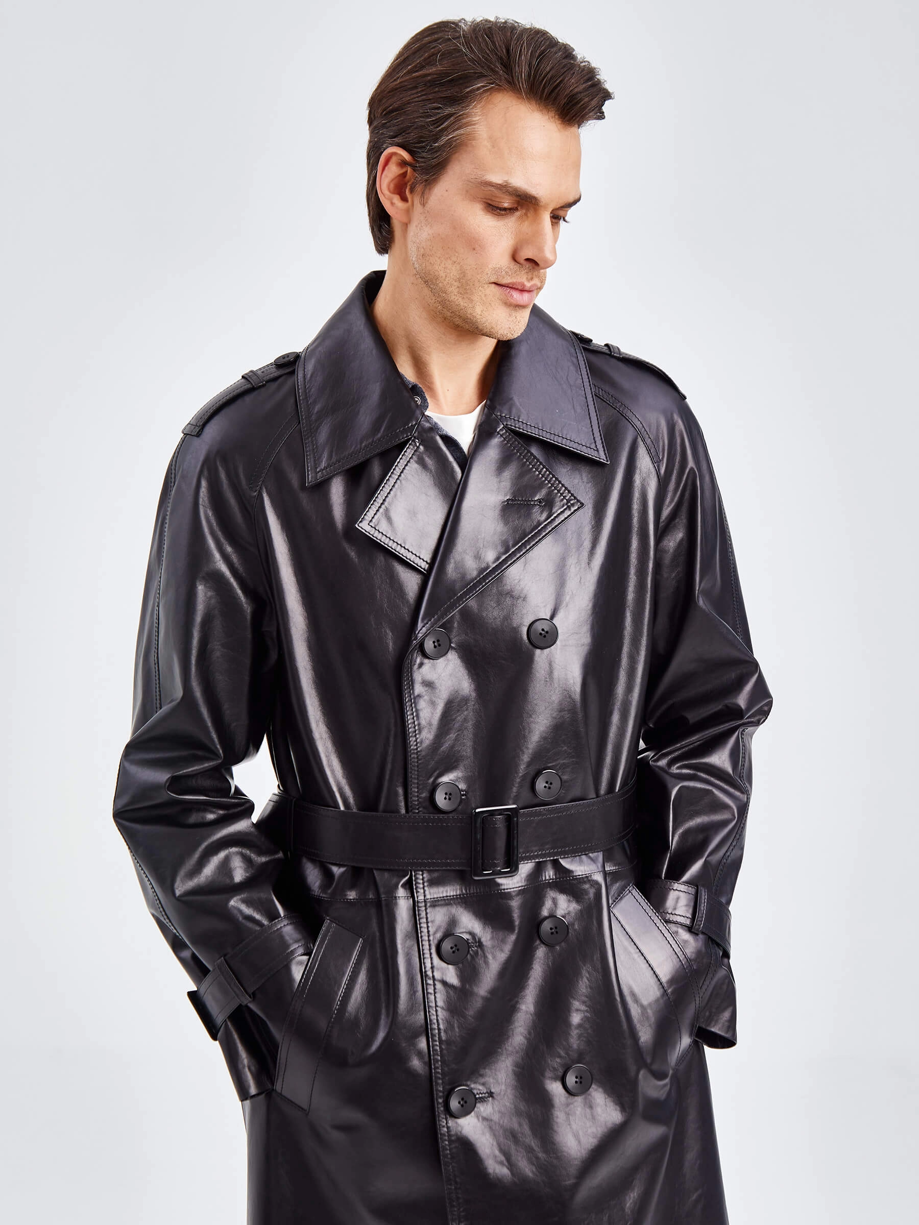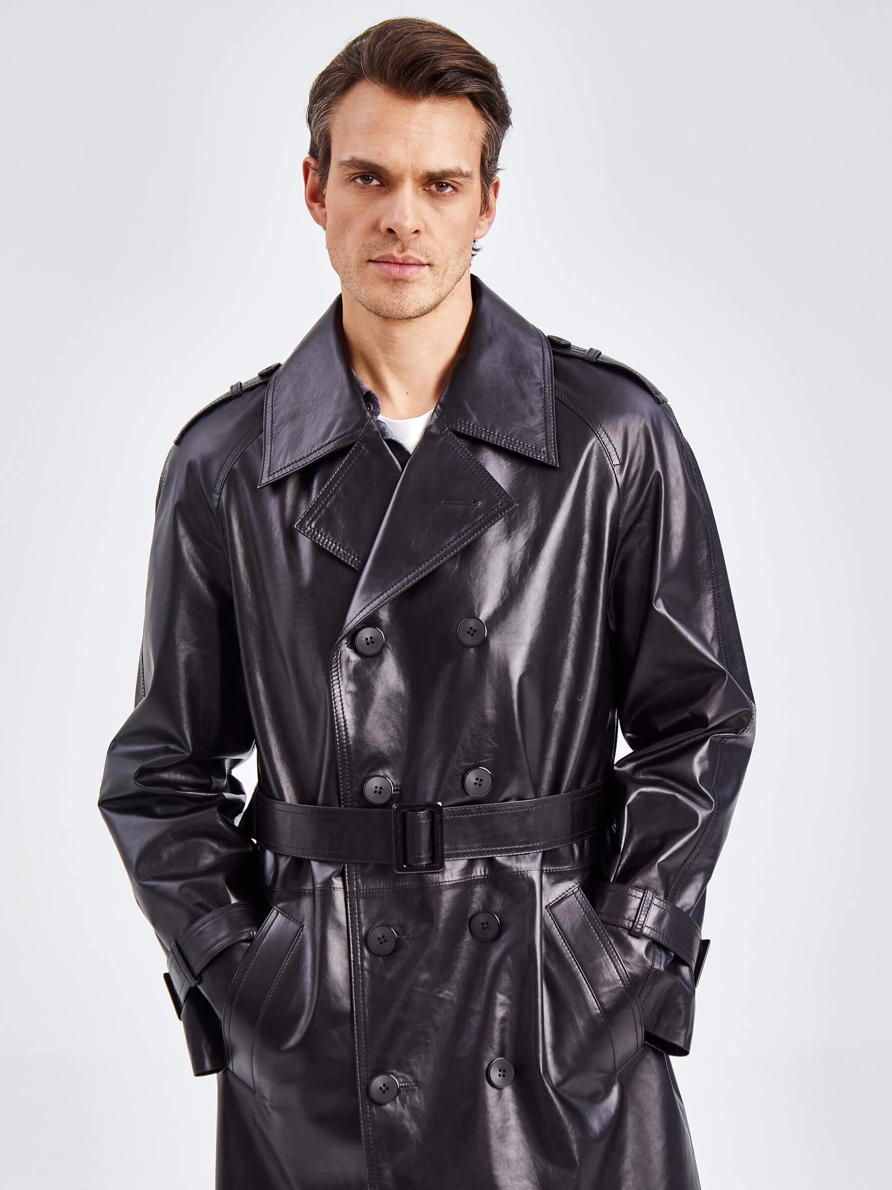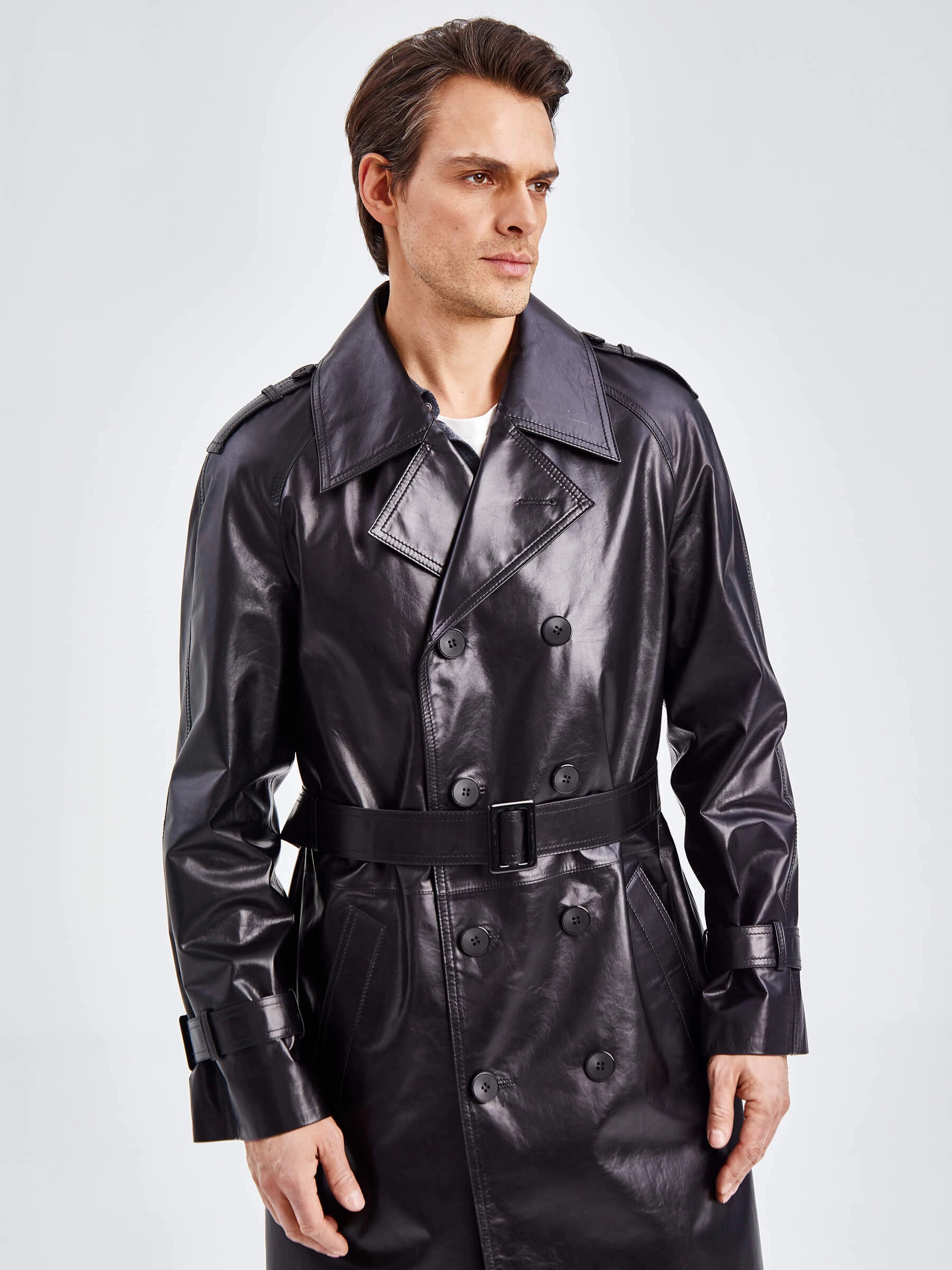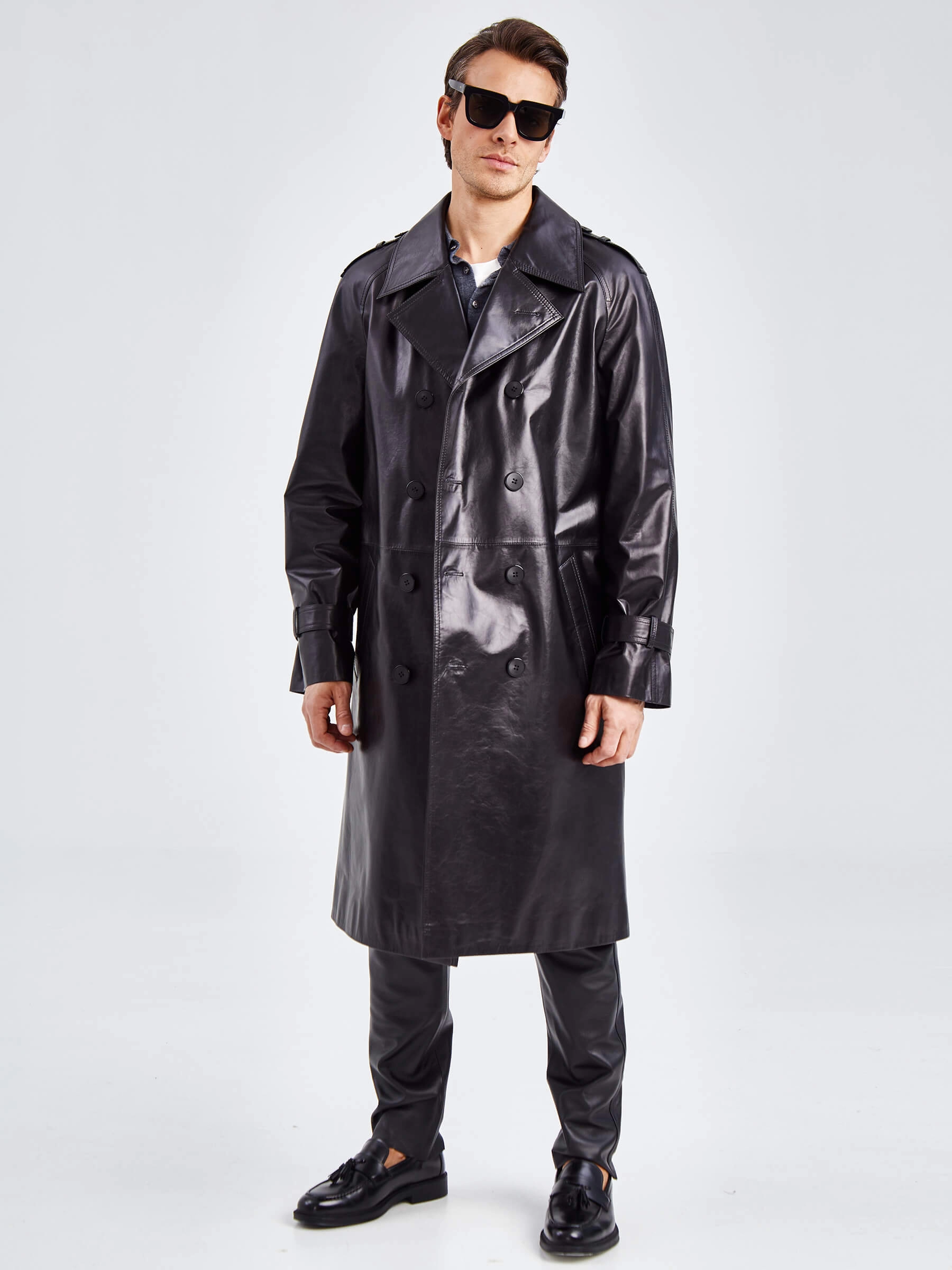 Двубортное кожаное пальто для уверенных в себе мужчин. Классический стиль. Рукав-реглан, обеспечивает комфорт в движении. Прекрасно сочетается по стилю как со свободной одеждой, так и со строгим деловым костюмом. Особенно рекомендуется мужчинам, для которых важен дресс-код.
