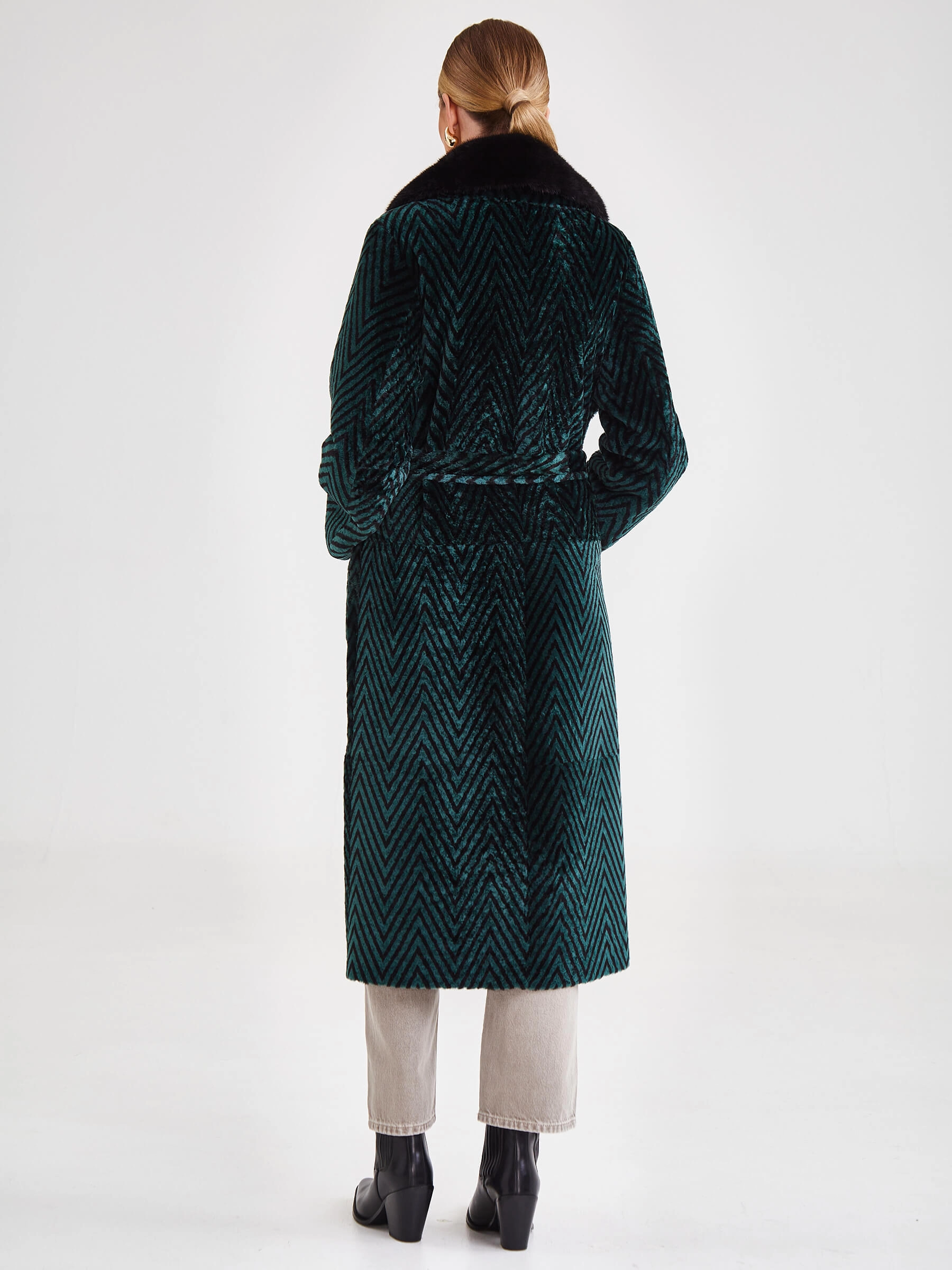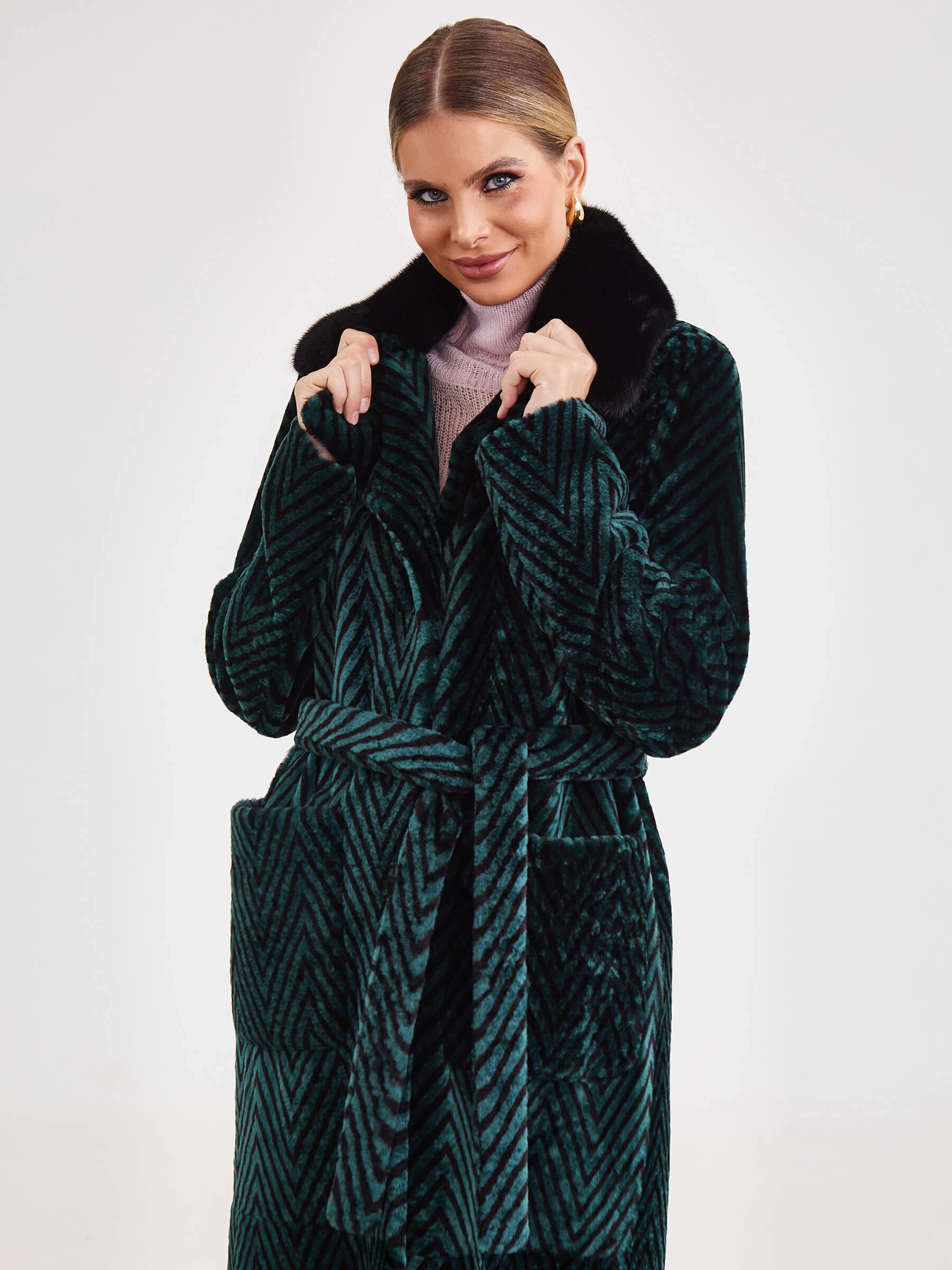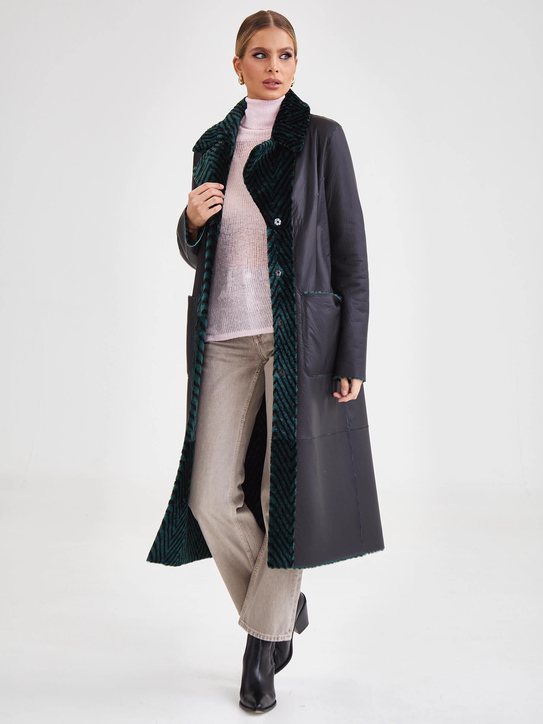 Лимитированная серия: роскошное двустороннее женское пальто премиум-класса длиной 119 см сочетает принтованный мех ягнёнка, известный как астраган, с одной стороны и благородное бронзовое металлизированное покрытие — с другой. Свободный силуэт со съёмным английским воротником из густого чёрного меха норки и застёжкой на кнопках создаёт изысканный образ. Дополнено накладными карманами и длинным поясом, завязываемым на талии. Нежнейший шелковистый материал гарантирует премиальное качество. Совет стилиста: наденьте со стороной из ягнёнка и меховым воротником с платьем-миди для вечера или со стороной-металлик без воротника с водолазкой и кожаными брюками для дерзкого повседневного стиля — одна вещь, два безупречных образа.