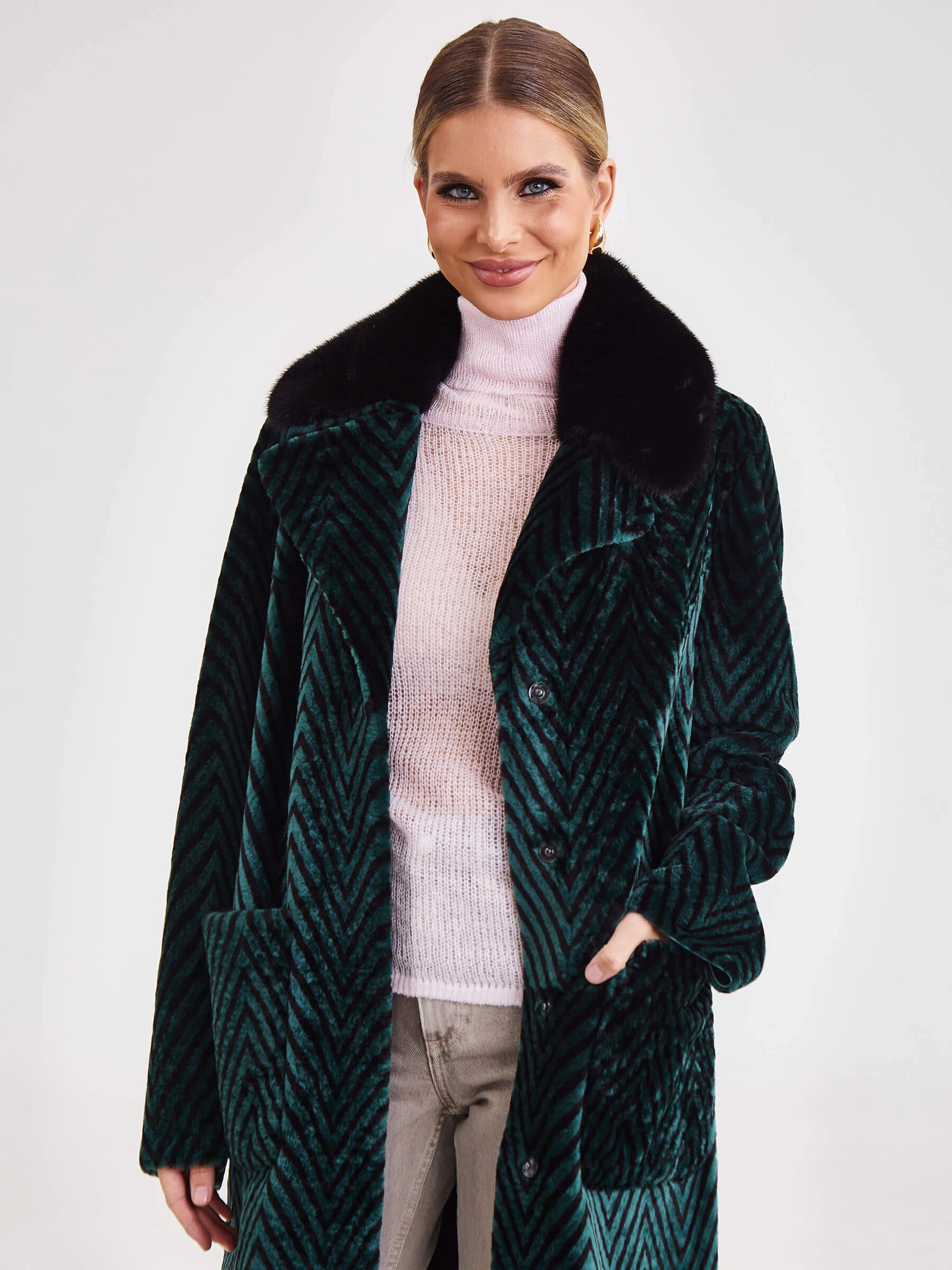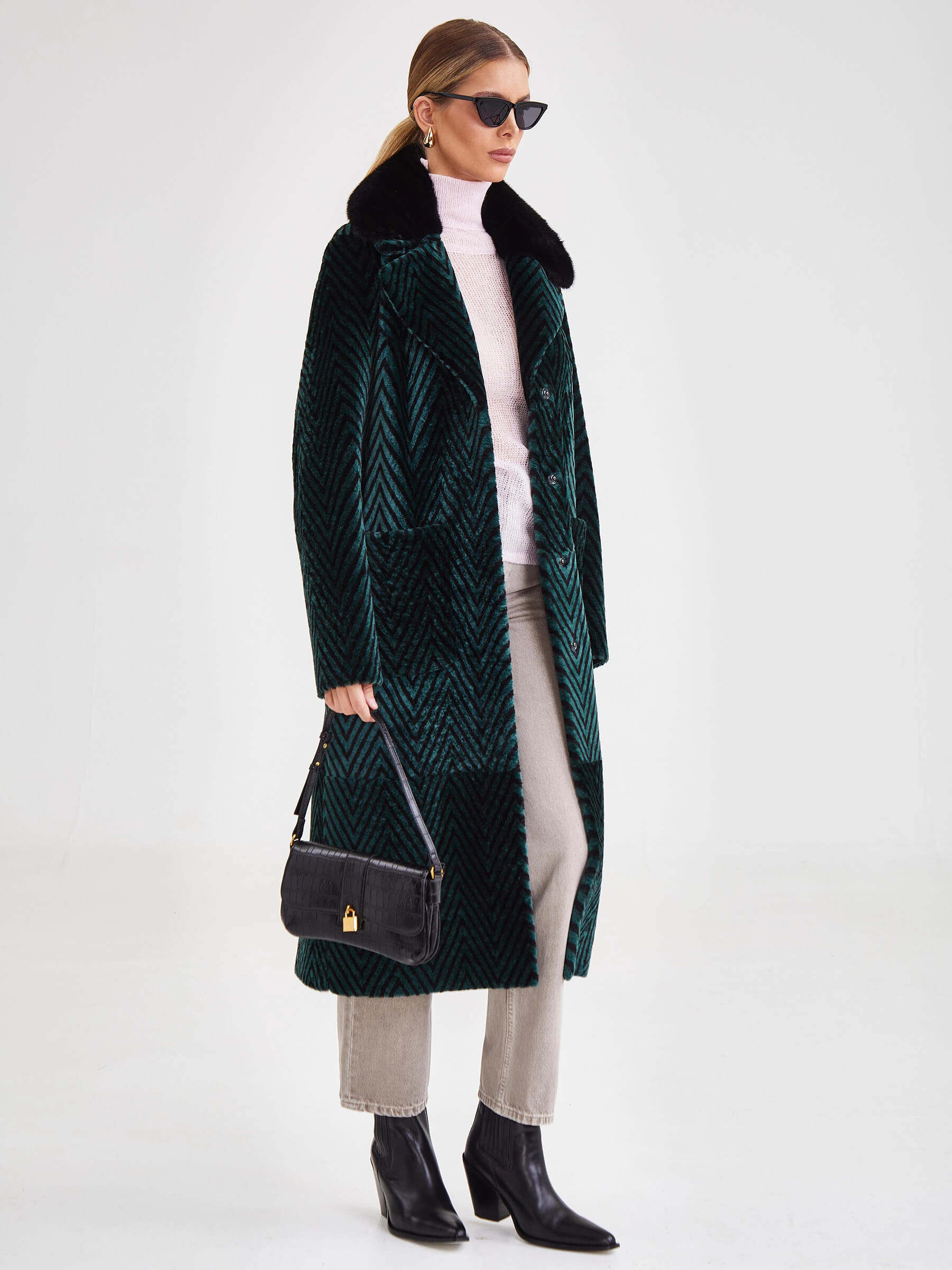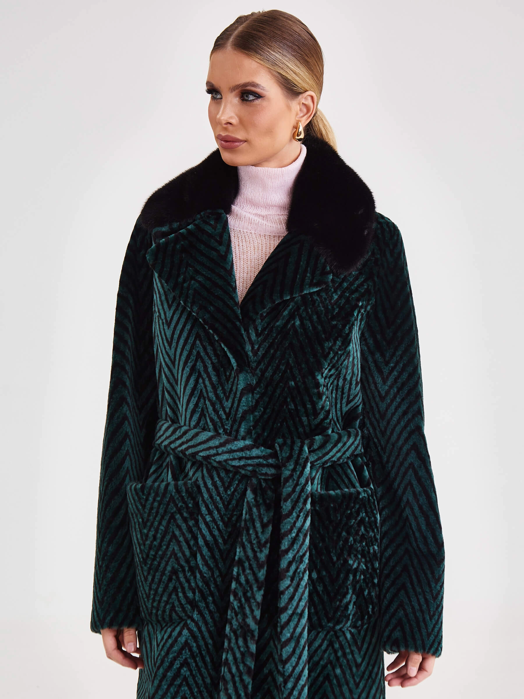 Лимитированная серия: роскошное двустороннее женское пальто премиум-класса длиной 119 см сочетает принтованный мех ягнёнка, известный как астраган, с одной стороны и благородное бронзовое металлизированное покрытие — с другой. Свободный силуэт со съёмным английским воротником из густого чёрного меха норки и застёжкой на кнопках создаёт изысканный образ. Дополнено накладными карманами и длинным поясом, завязываемым на талии. Нежнейший шелковистый материал гарантирует премиальное качество. Совет стилиста: наденьте со стороной из ягнёнка и меховым воротником с платьем-миди для вечера или со стороной-металлик без воротника с водолазкой и кожаными брюками для дерзкого повседневного стиля — одна вещь, два безупречных образа.