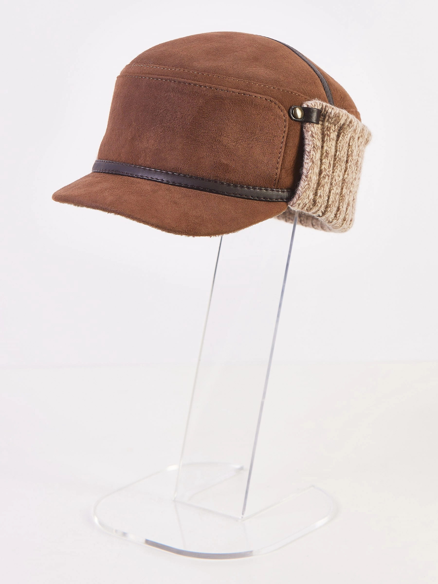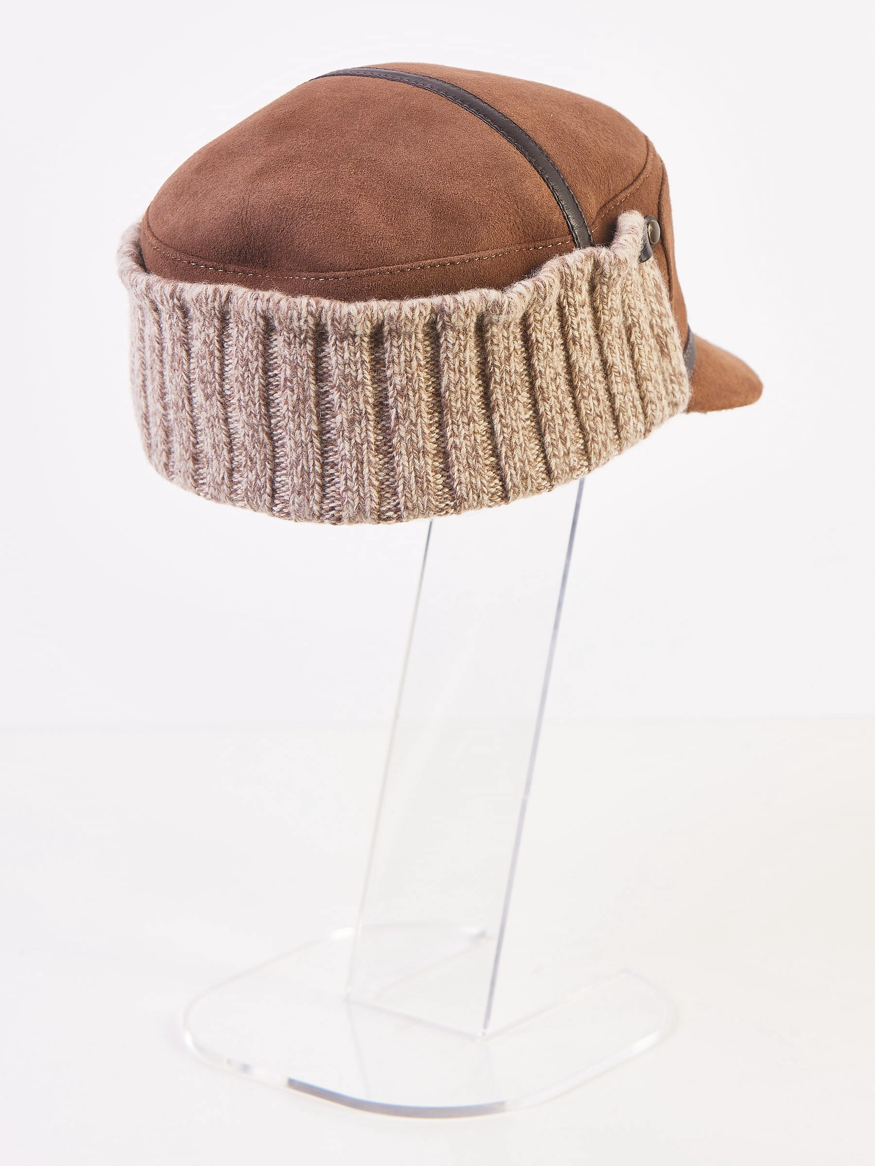 Мужской головной убор выполнен из плотной овчины. Лицевая из натуральной замши. Жесткий козырек. Ветрозащитный отворот выполнен из трикотажа и фиксируется кнопками.