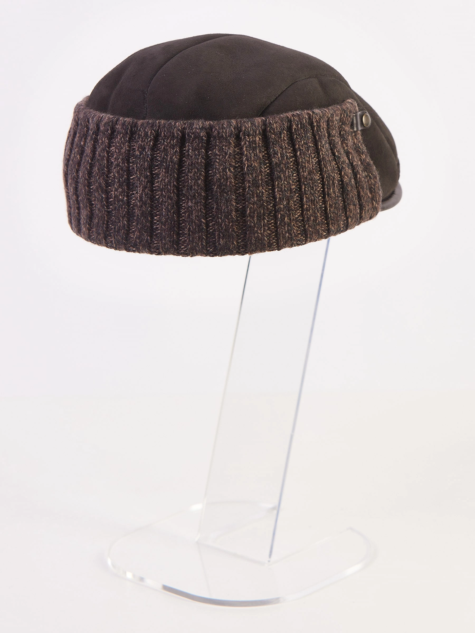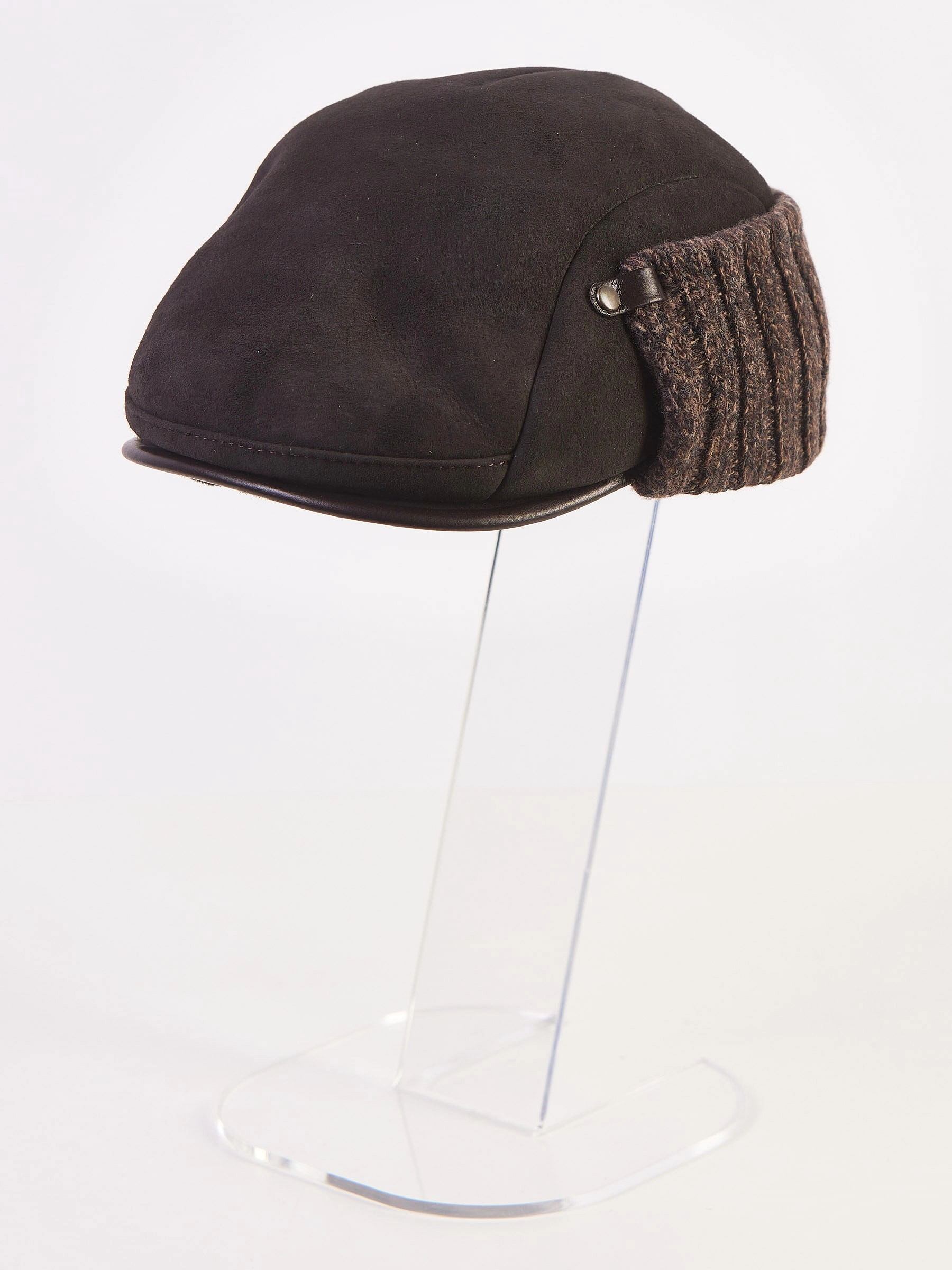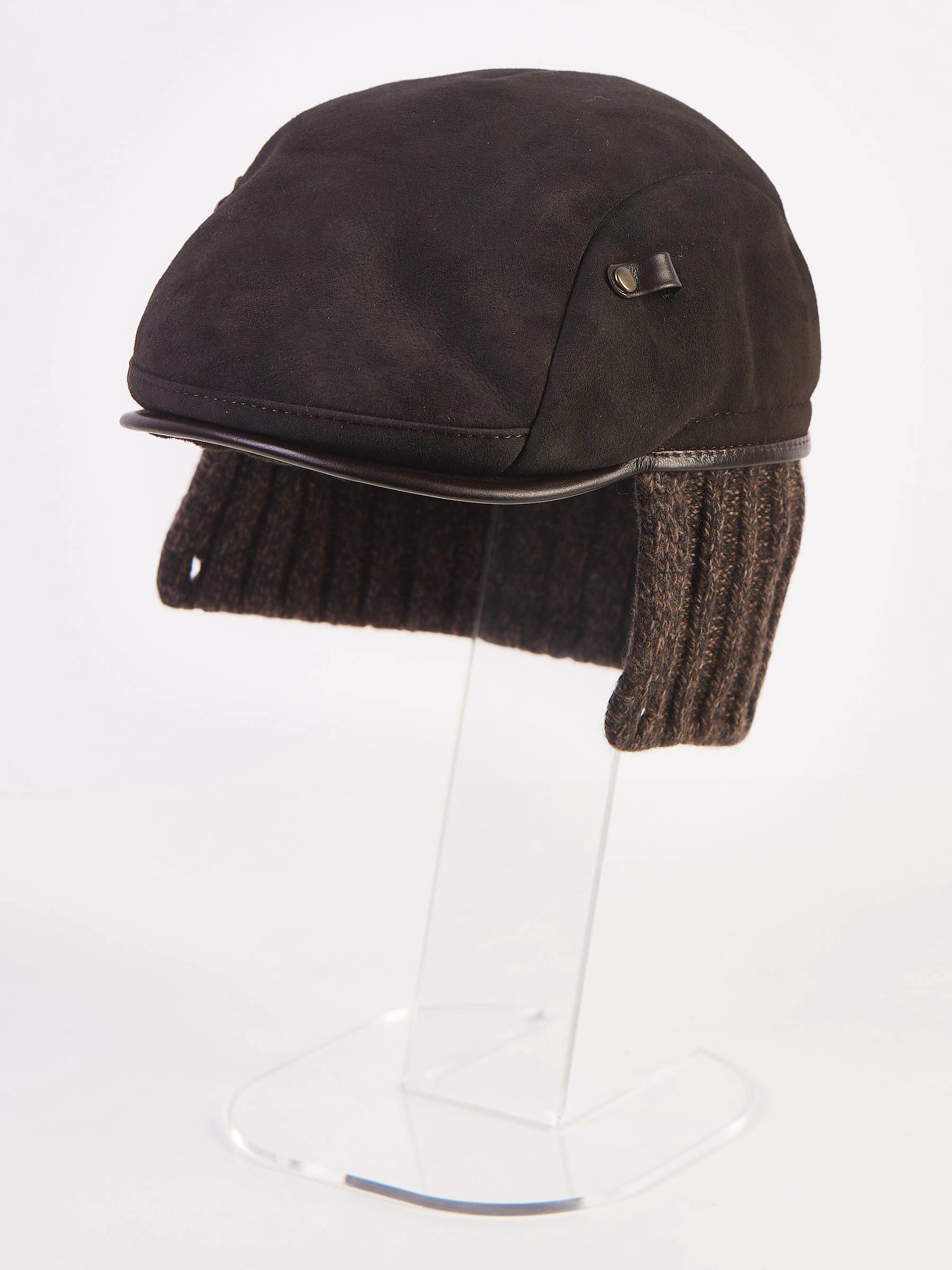 Зимний головной убор - кепка выполнена из гладкой кожи в комбинации с плотной овчиной. Хорошо сохраняет тепло. Кепка имеет жесткий козырек, трикотажный отворот фиксируется кнопками.