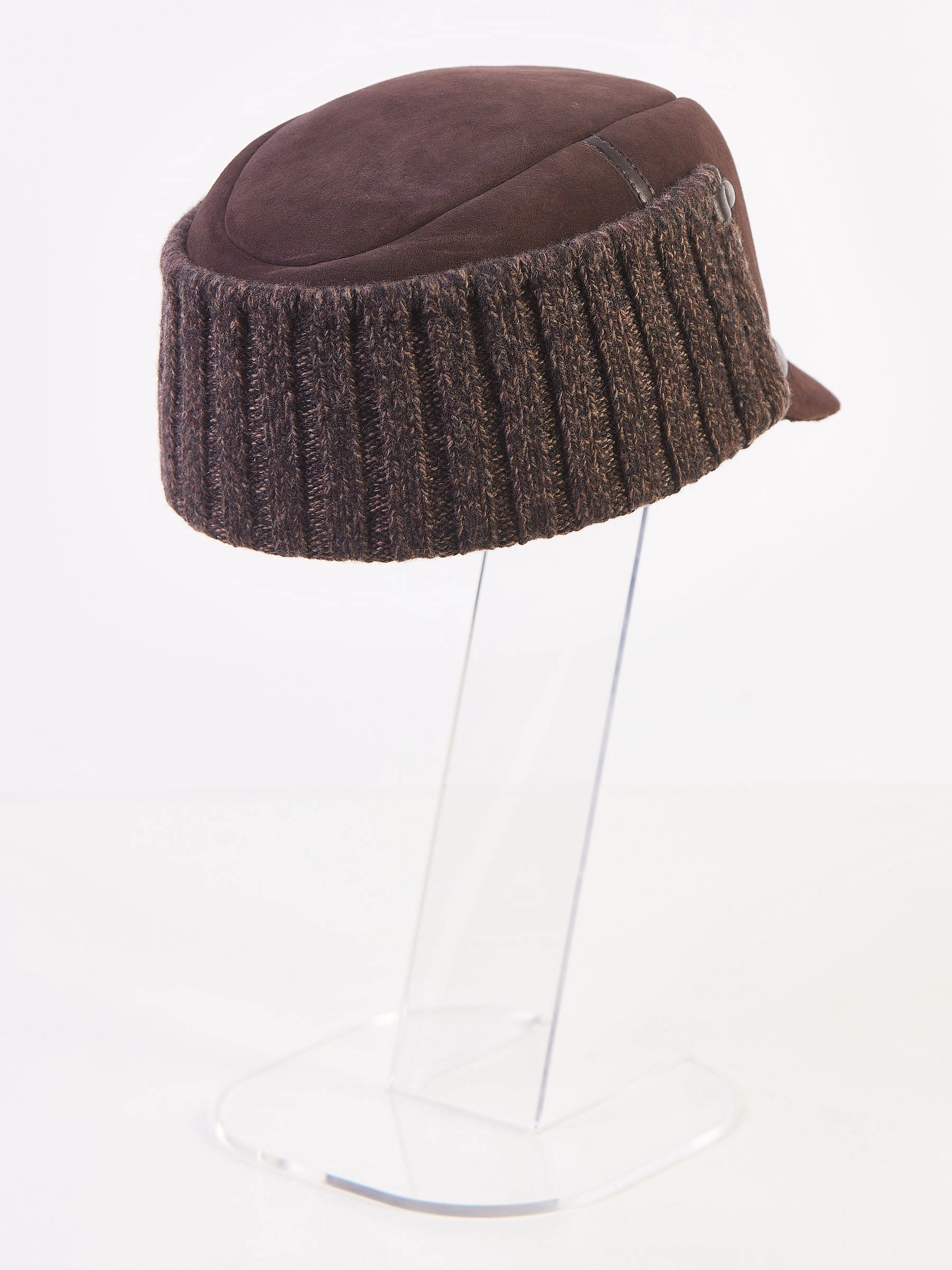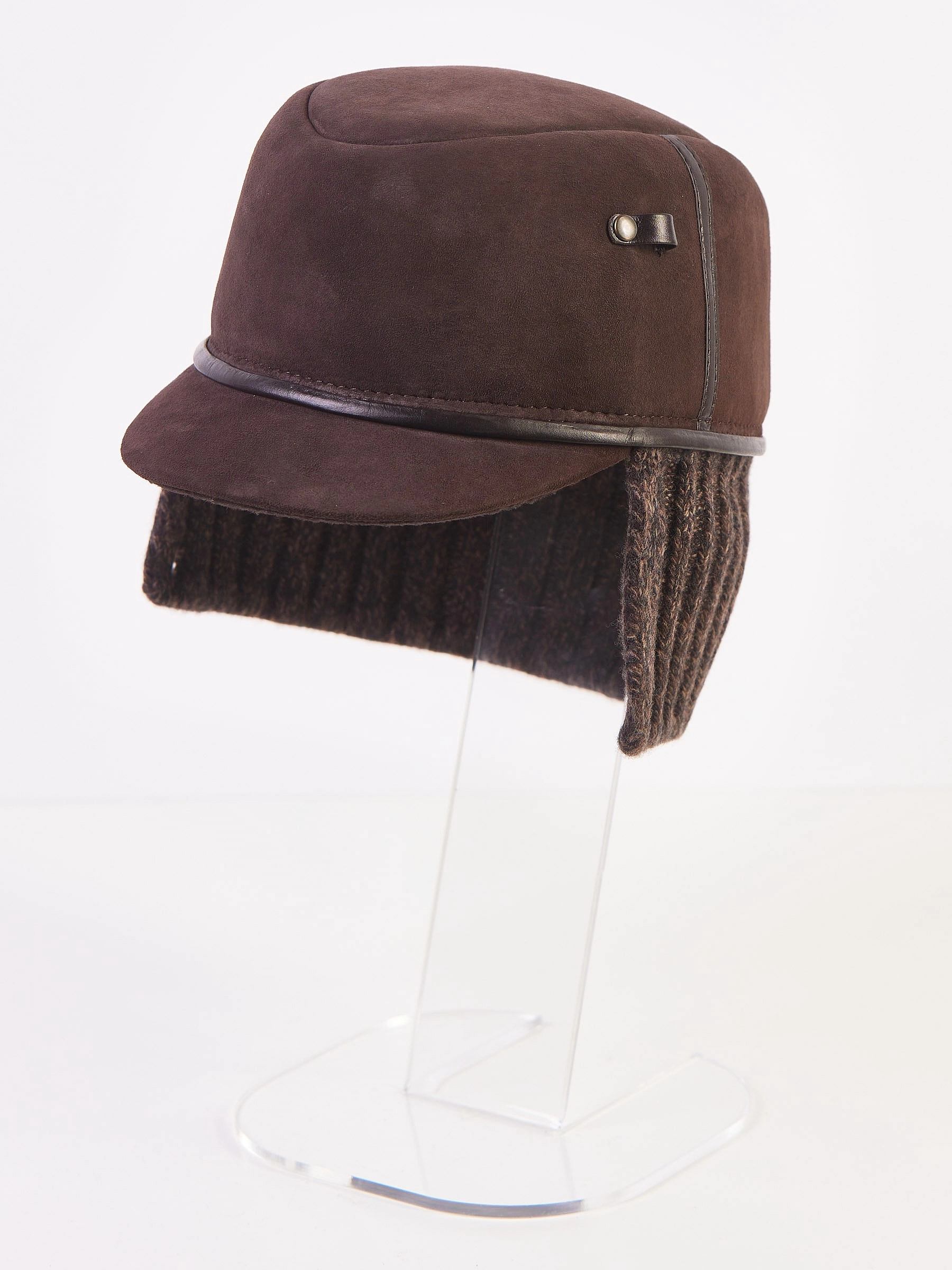 Мужской головной убор выполнен из плотной овчины. Лицевая из натуральной замши. Жесткий козырек. Ветрозащитный отворот выполнен из трикотажа и фиксируется кнопками.