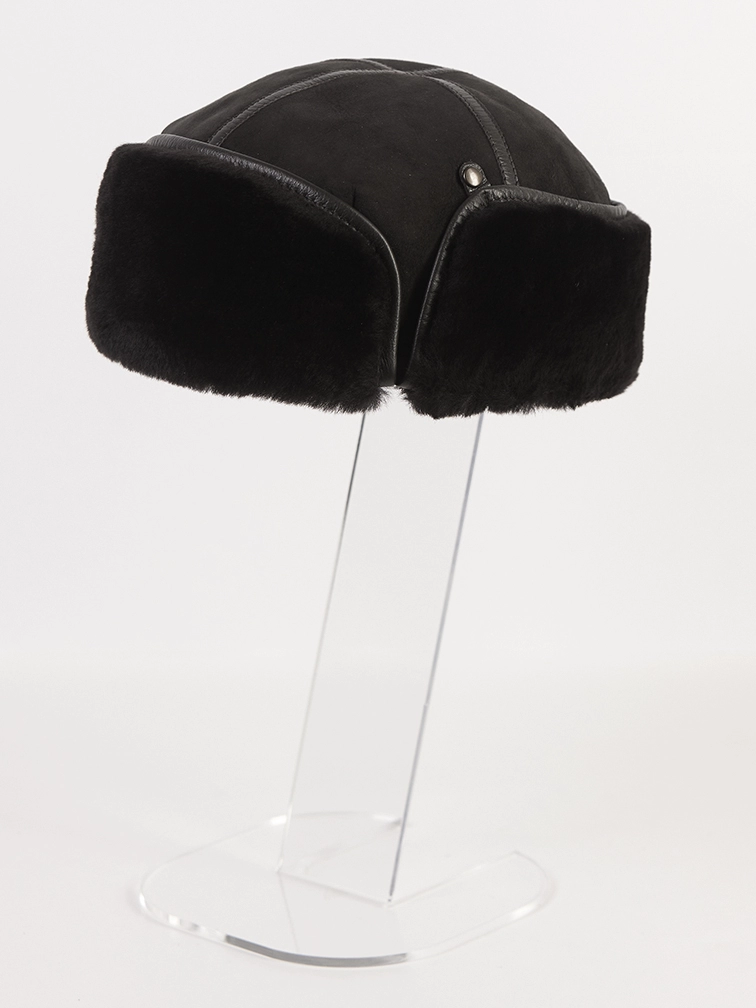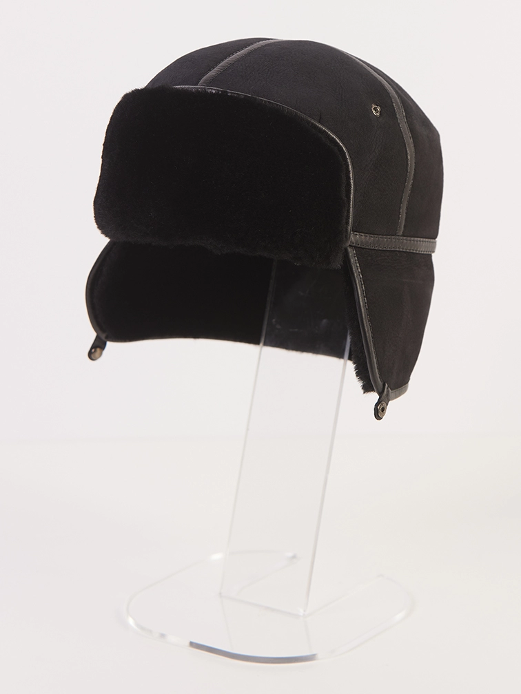 Мужской головной убор выполнен из плотной меховой овчины. Лицевая сторона из натуральной замши. Ветрозащитный клапан фиксируется кнопками и опускается.