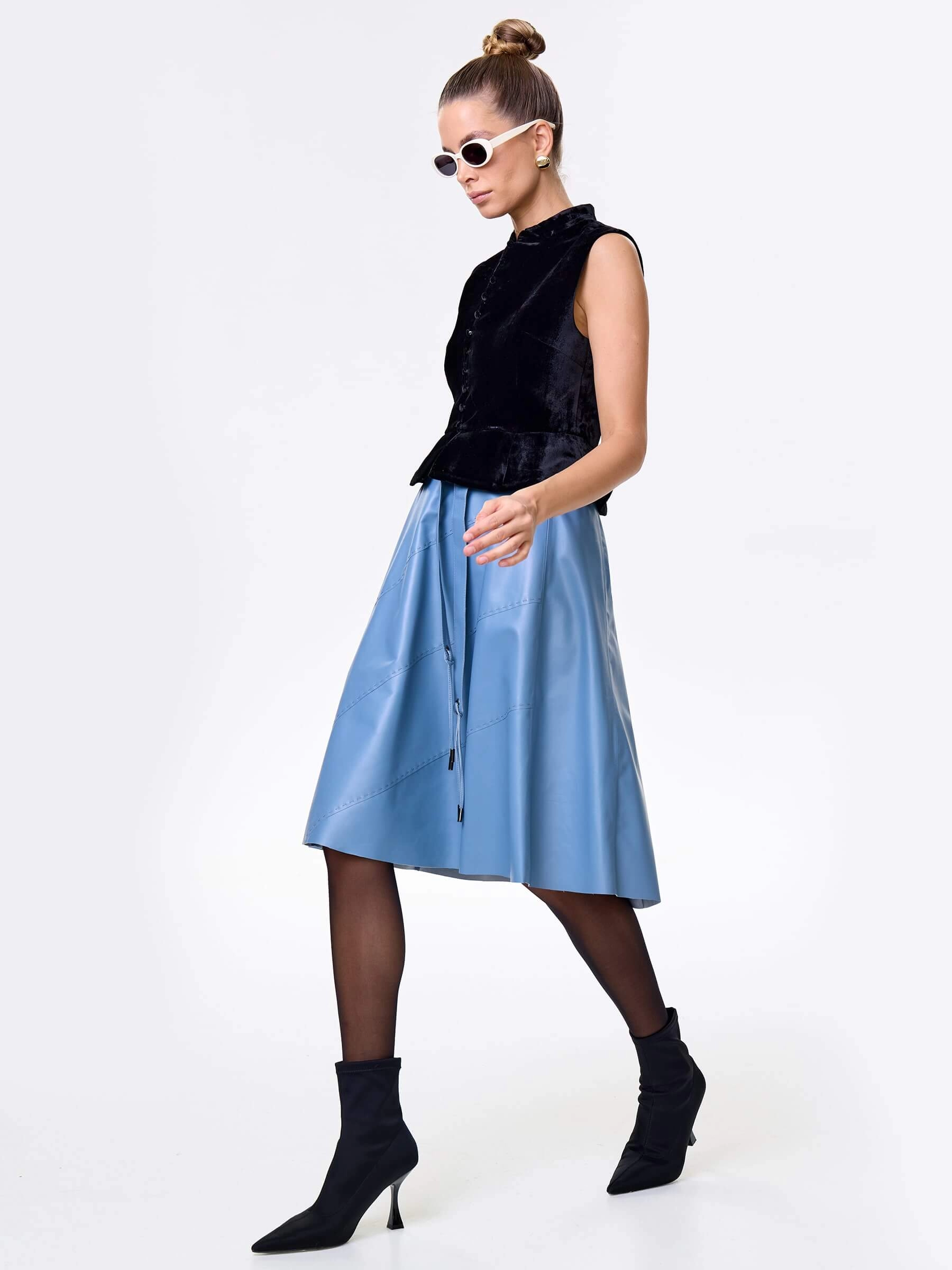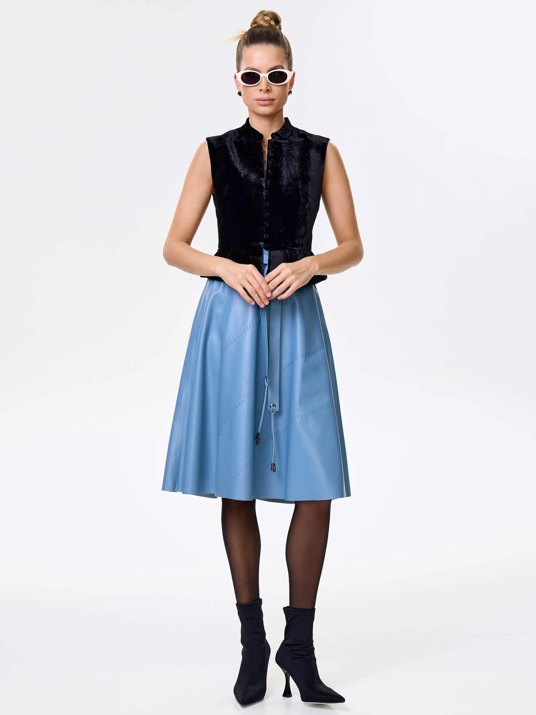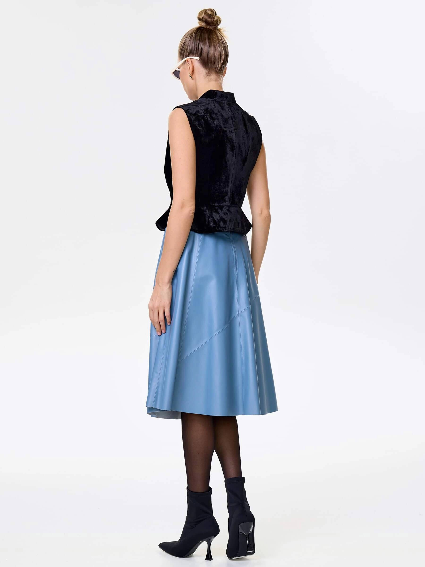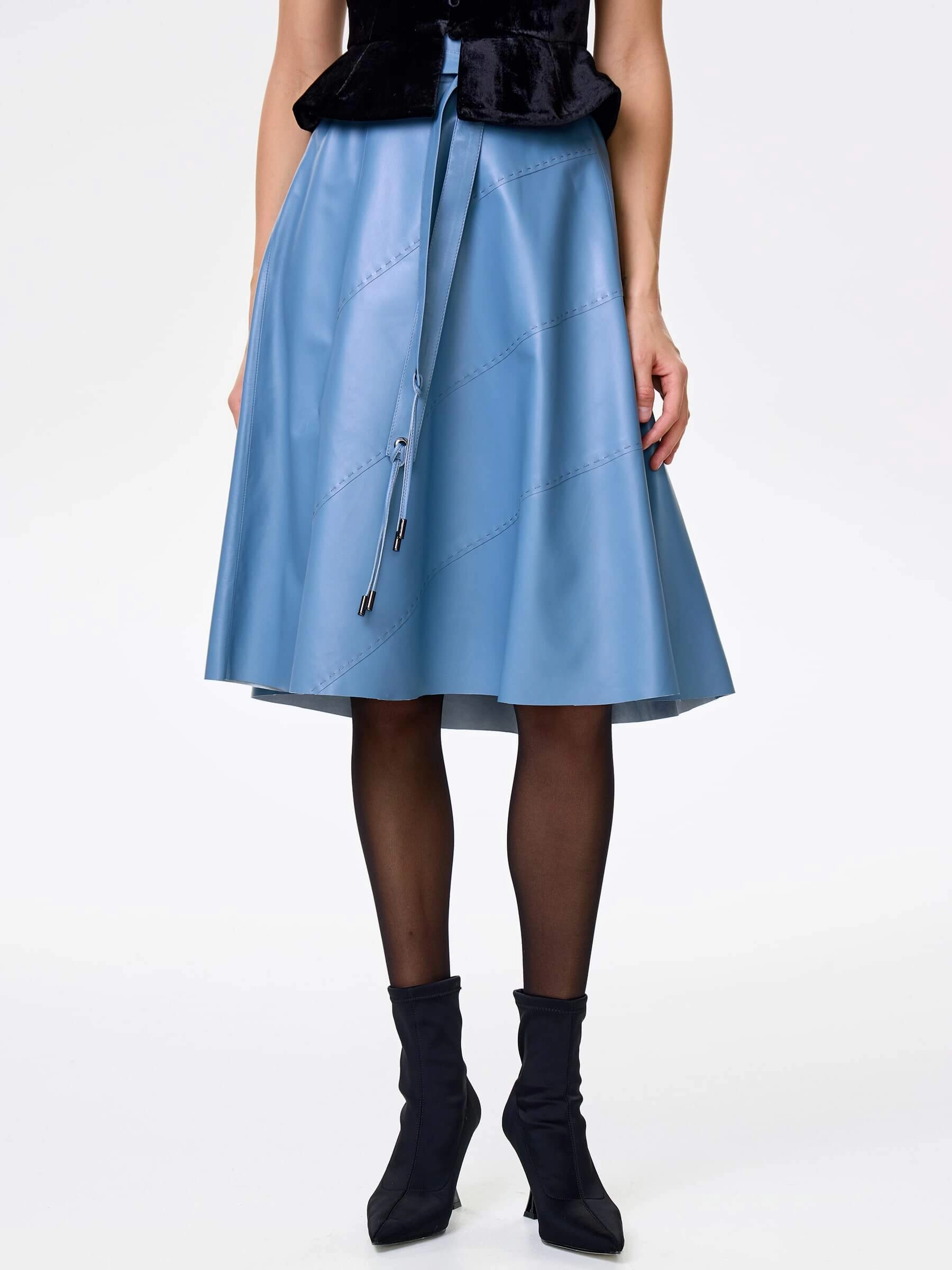 Товар голубая кожаная юбка 01рс, размер 48, артикул 85452 выполнен из натуральной кожи с застежкой молния. Рассчитан на сезон: демисезон. Длина изделия 70 см, силуэт расклешенный.