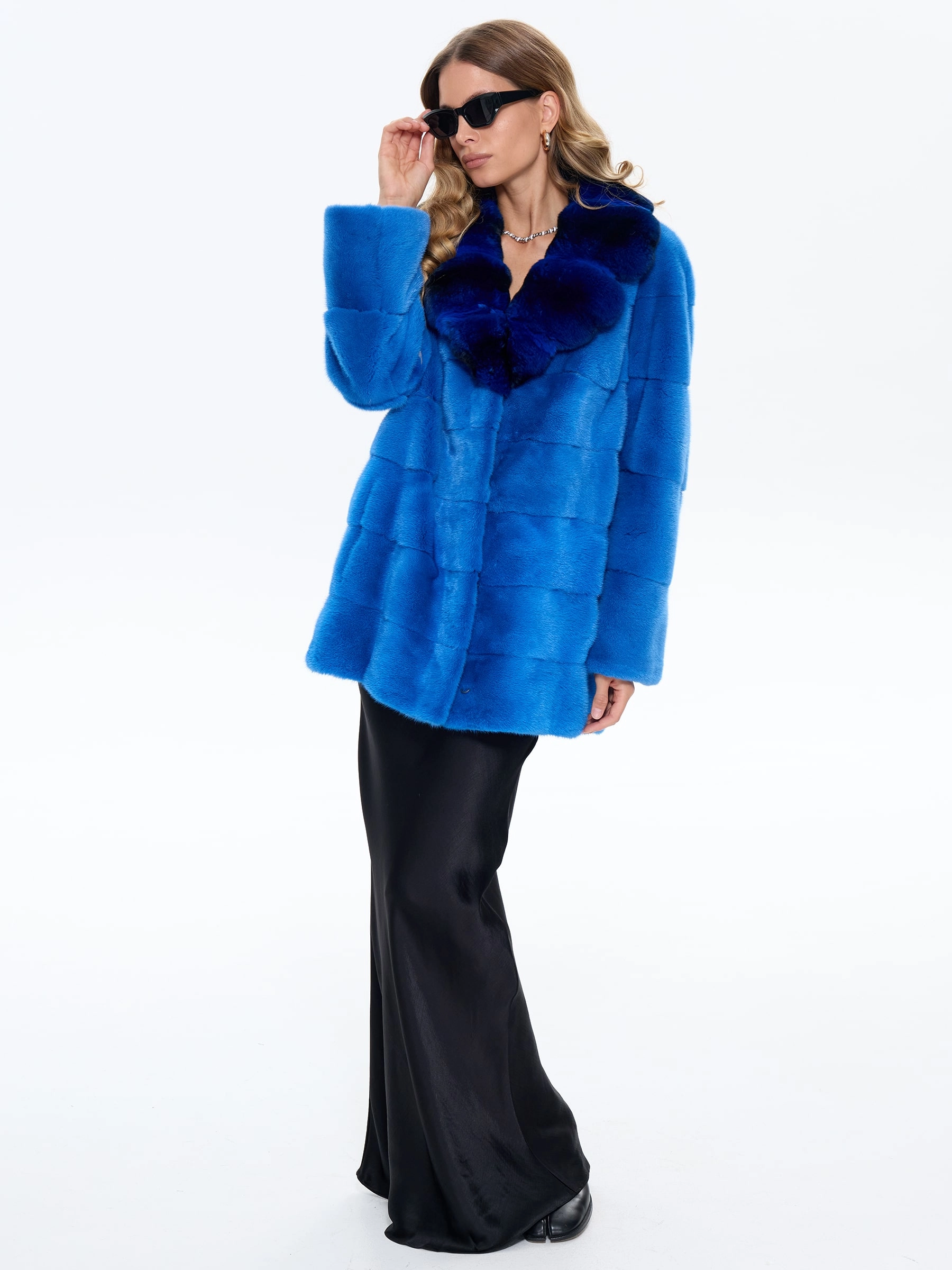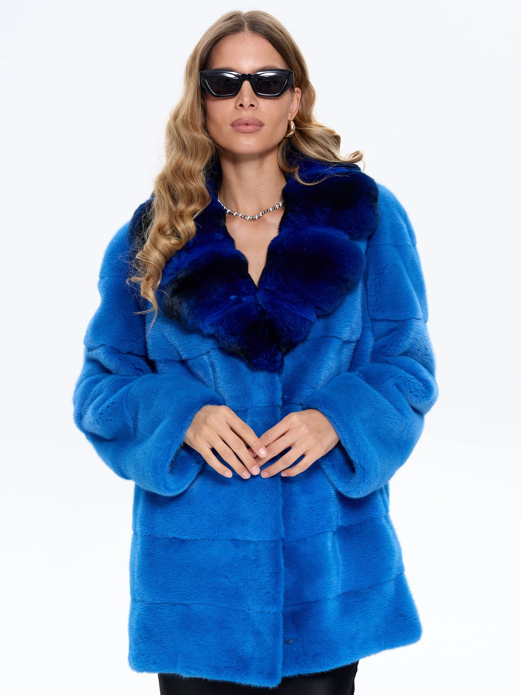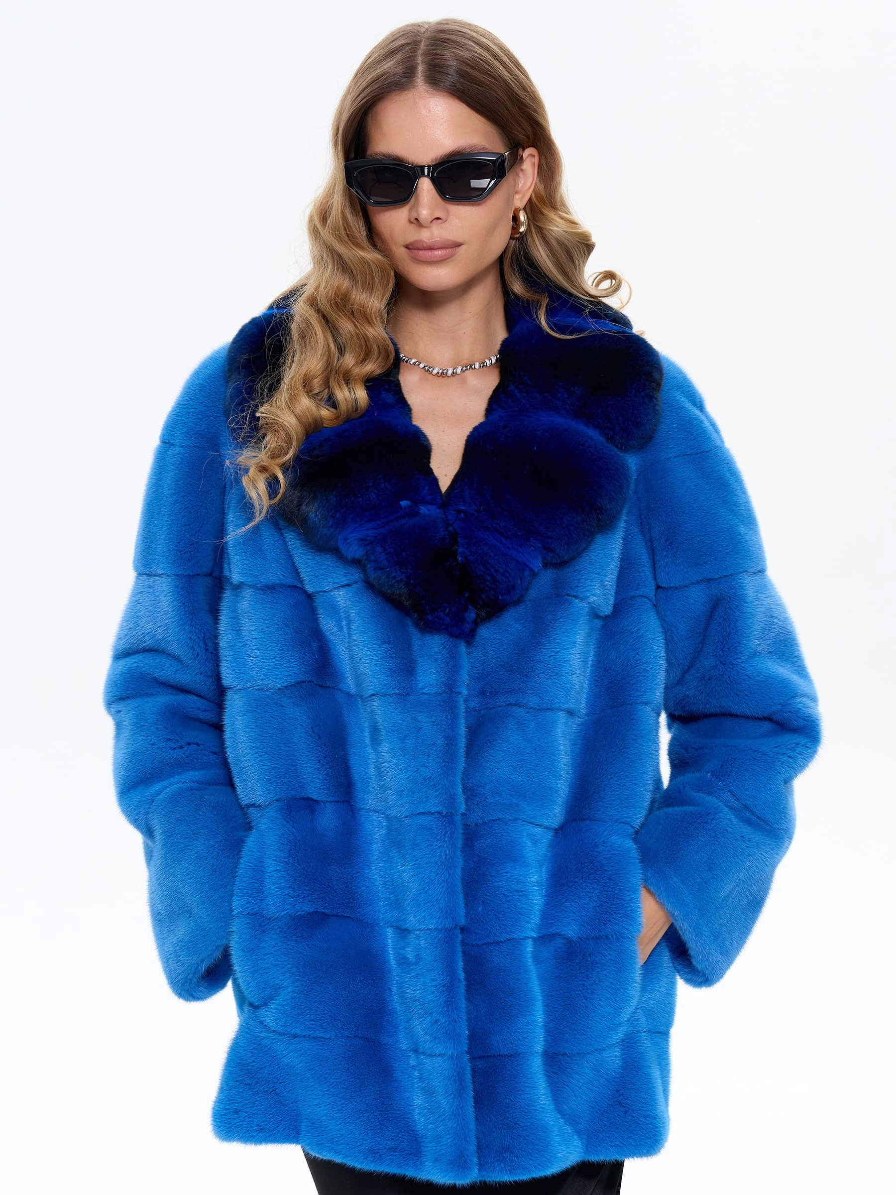 Товар голубая норковая шуба с шиншилой 2а, размер 54, артикул 65460 выполнен из мех норки с застежкой клипсы. Рассчитан на сезон: зима. Длина изделия 73 см, силуэт прямой.