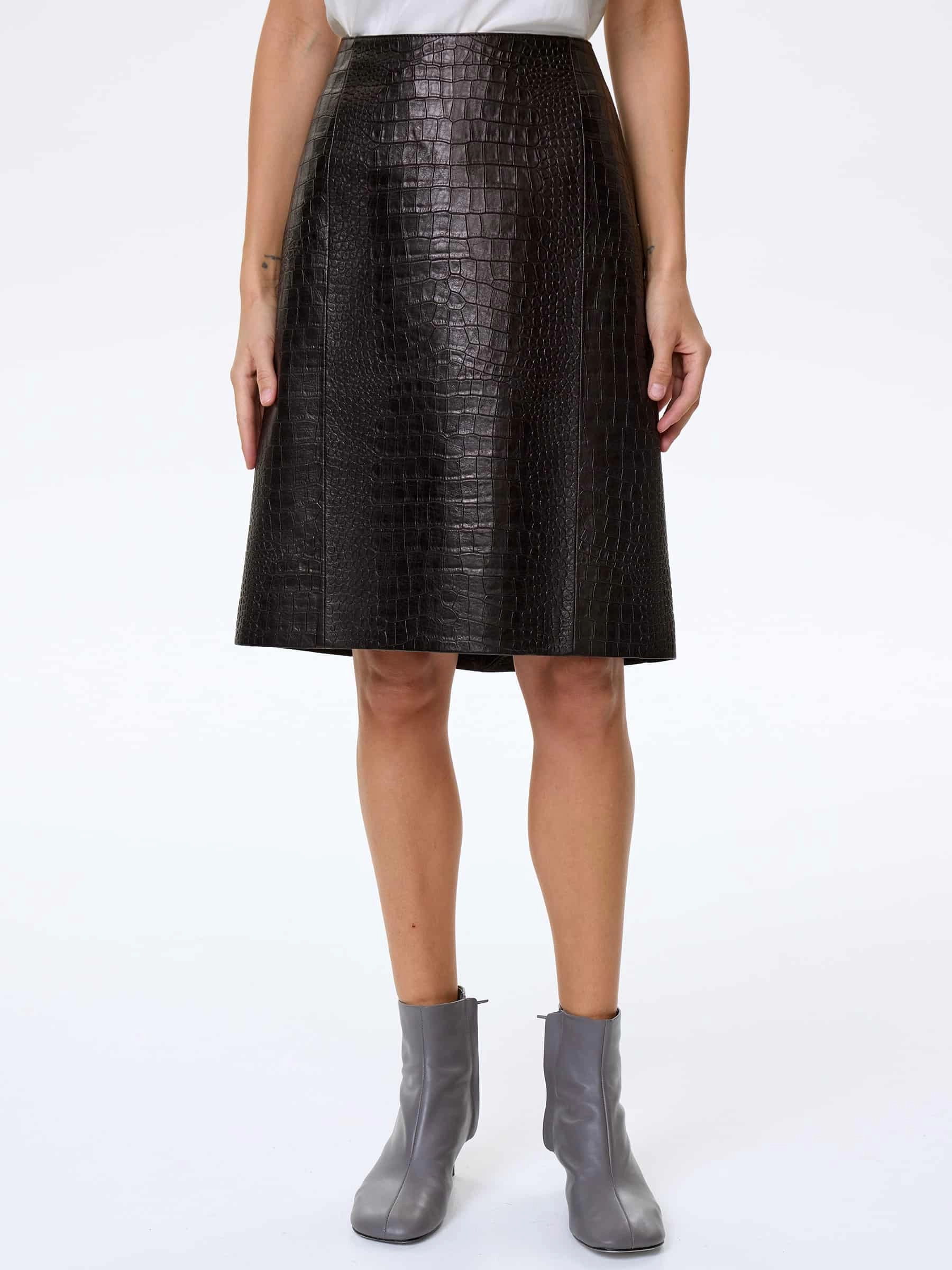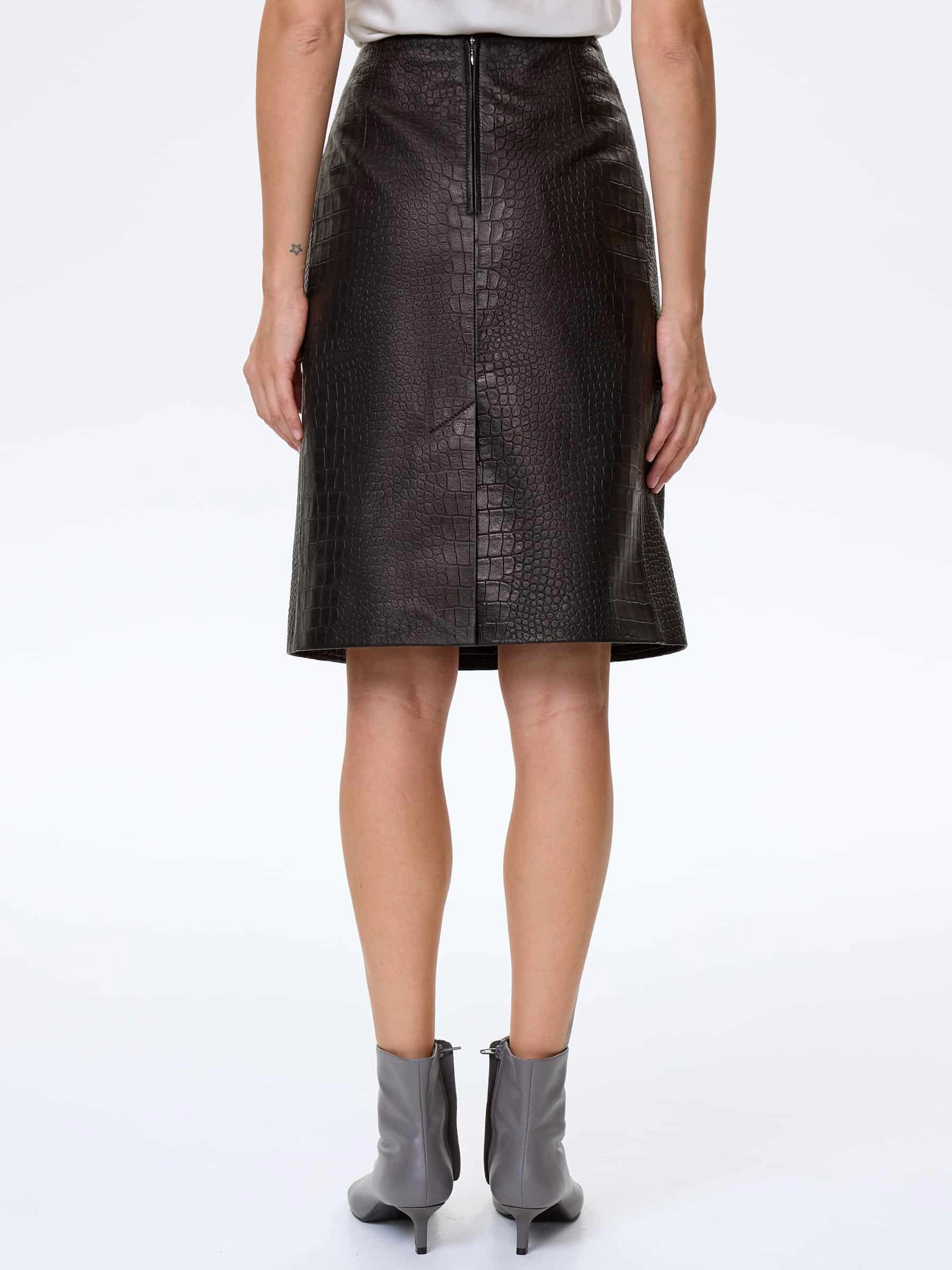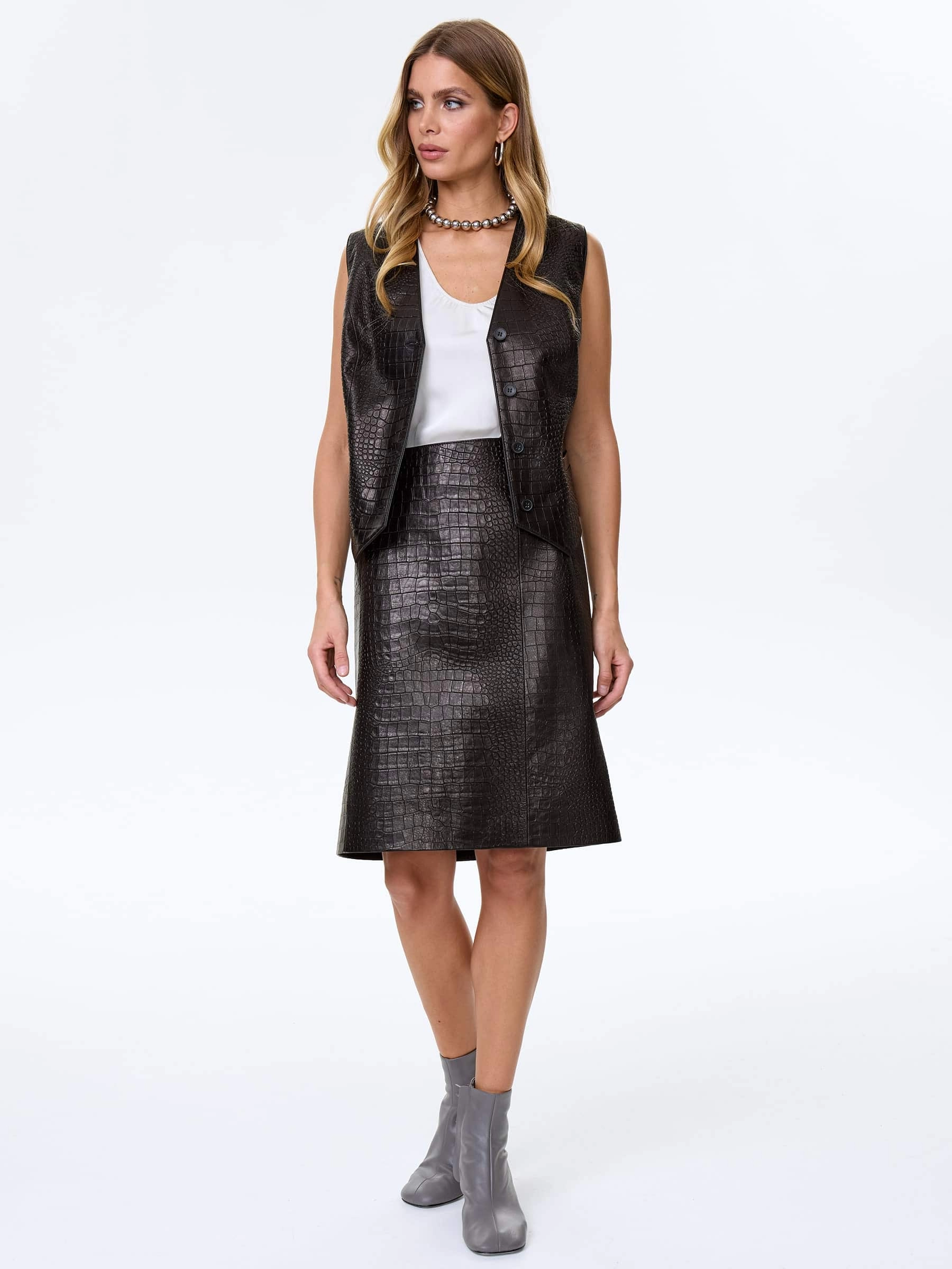 Юбка из мягкой натуральной кожи с эффектным тиснением под крокодила в глубоком черном цвете — образец элегантности и безупречного кроя. Изысканный блеск кожи, удобная застежка и лаконичный силуэт без пояса делают эту модель универсальной основой гардероба. Носите ее с классическими блузами для работы, с массивными джемперами для прогулок или с облегающими топами для вечера — благородная фактура кожи гарантирует безупречный вид в любой ситуации.