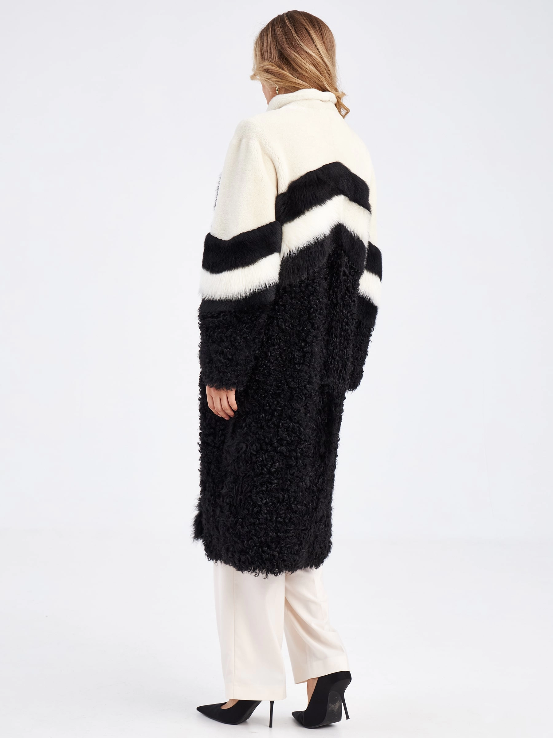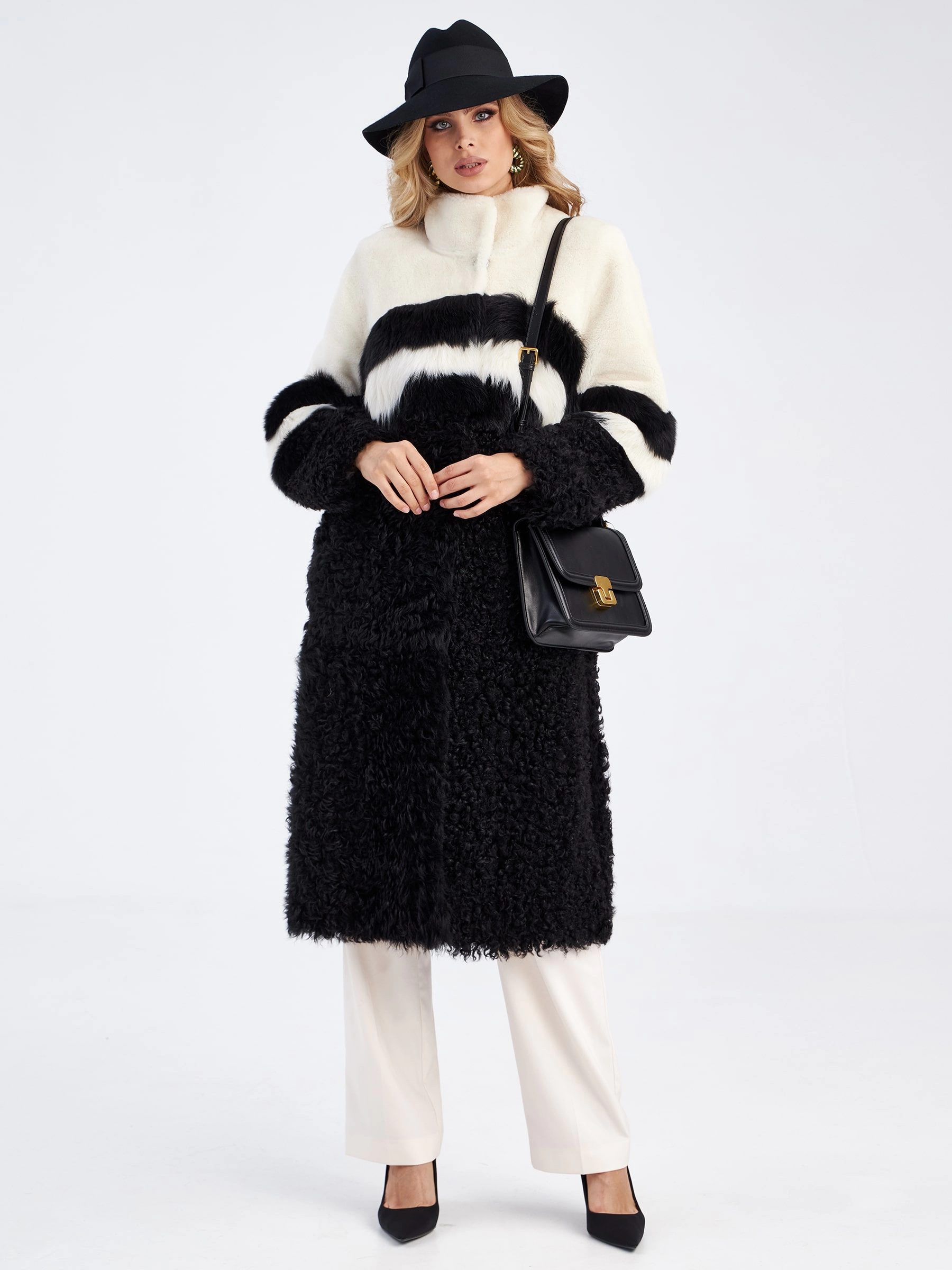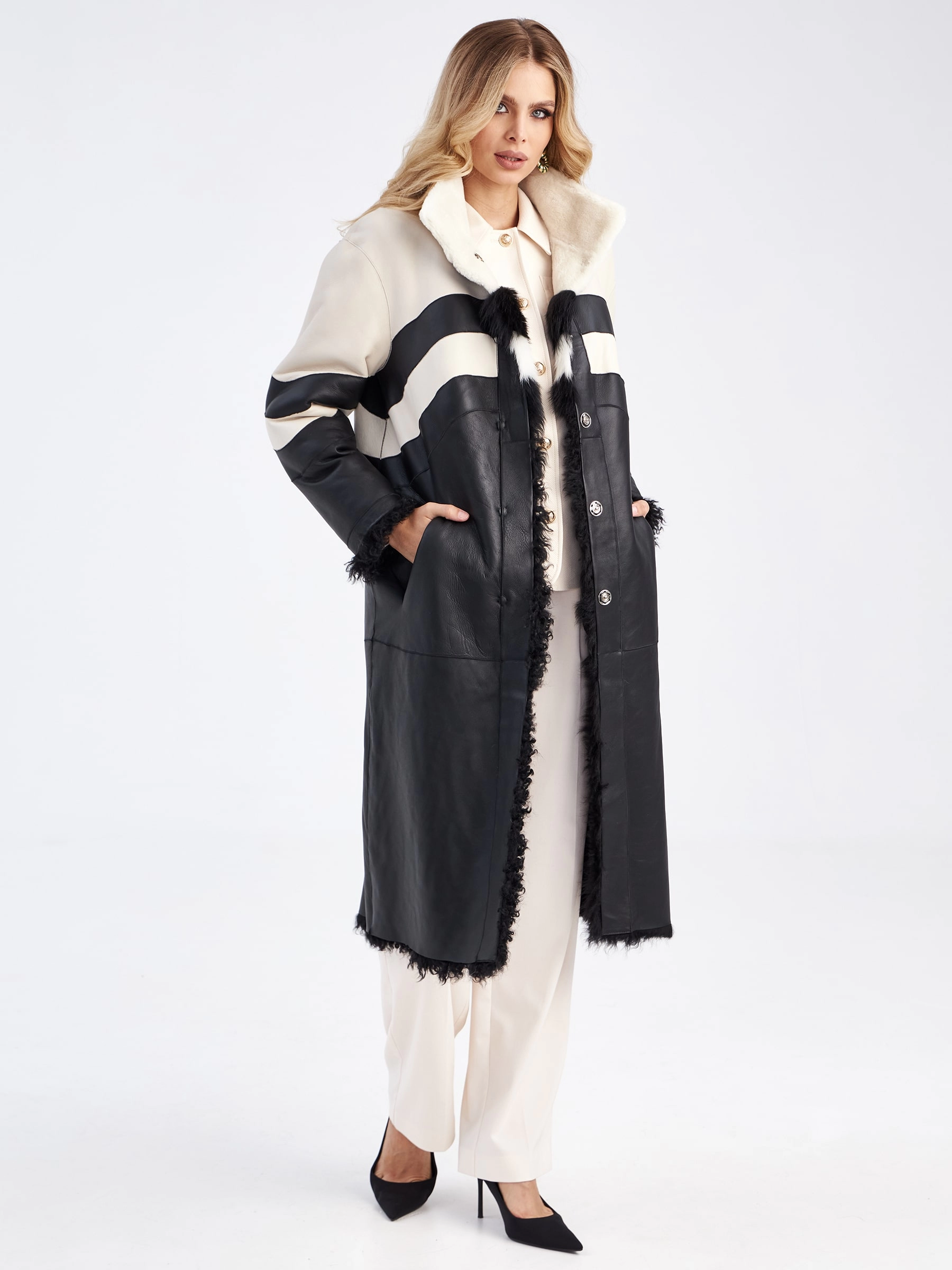 Длинное пальто из натуральной овчины прямого кроя в черно-белом оттенке, станет доказательством того, что можно найти компромисс между красотой и удобством. Выполняя эту модель мастера использовали плотную мягкую овчину в комбинации с шелковистым мехом тиградо. Материал хорошо сохраняет тепло даже в сильный мороз, а воротник - стойка обеспечит особый комфорт в непогоду.