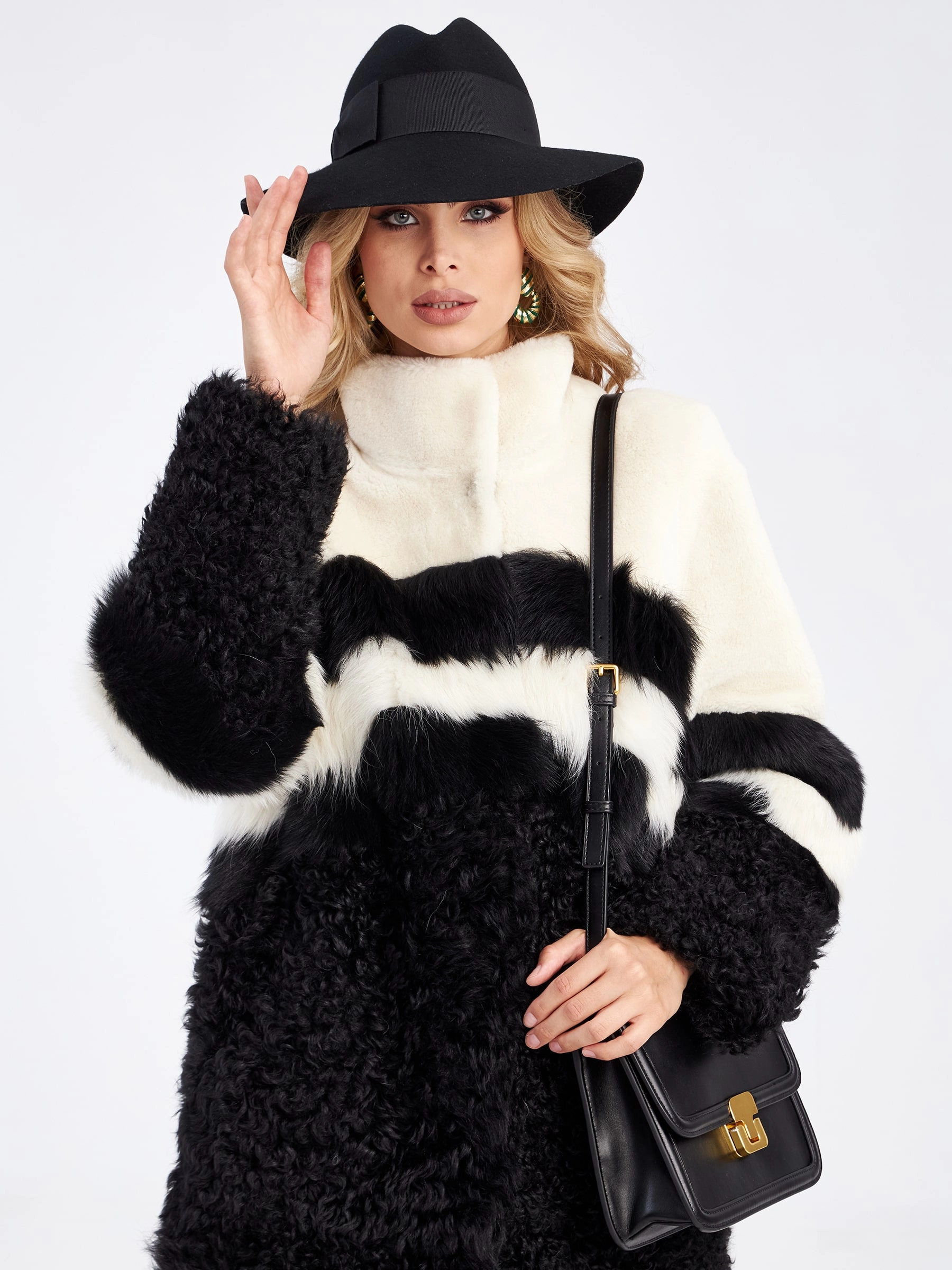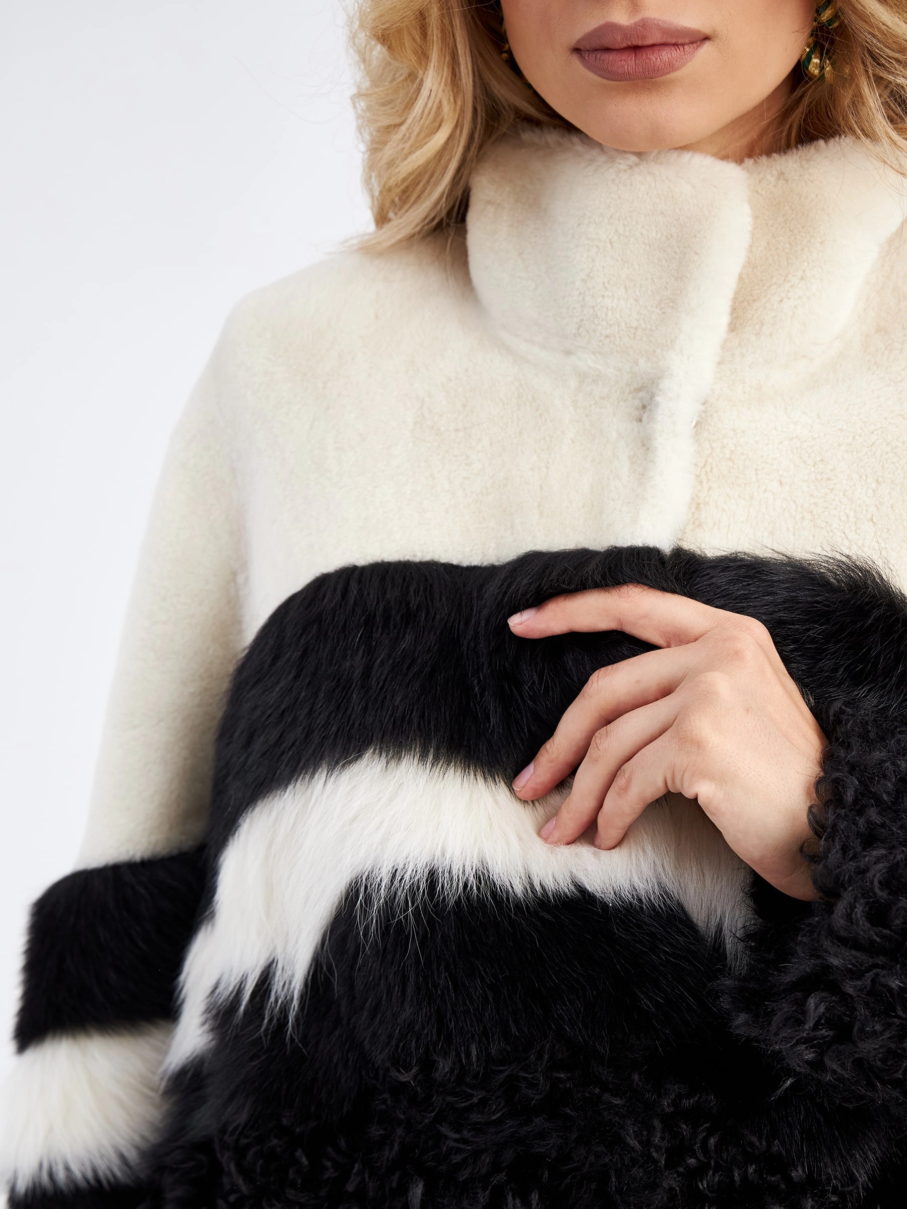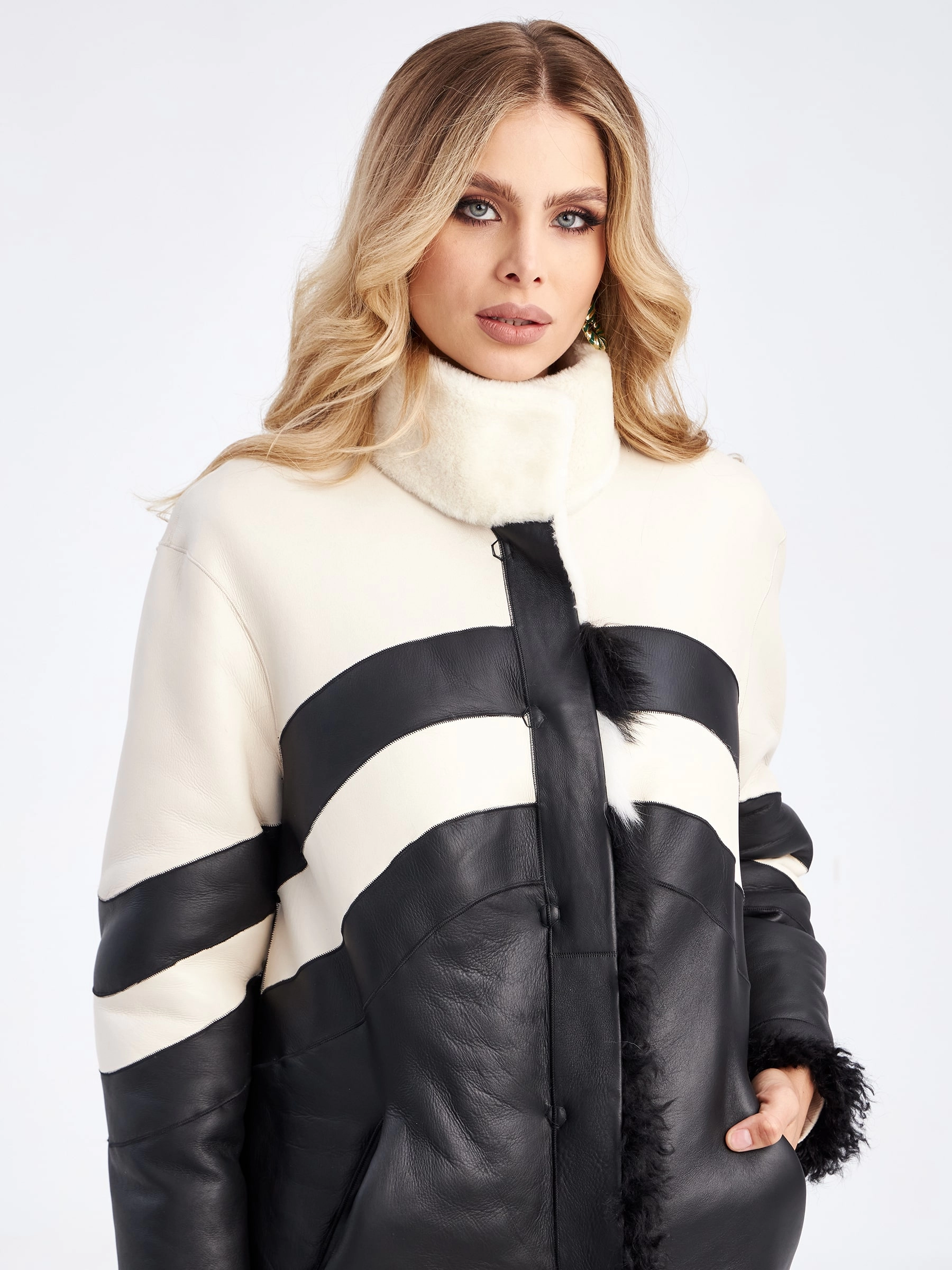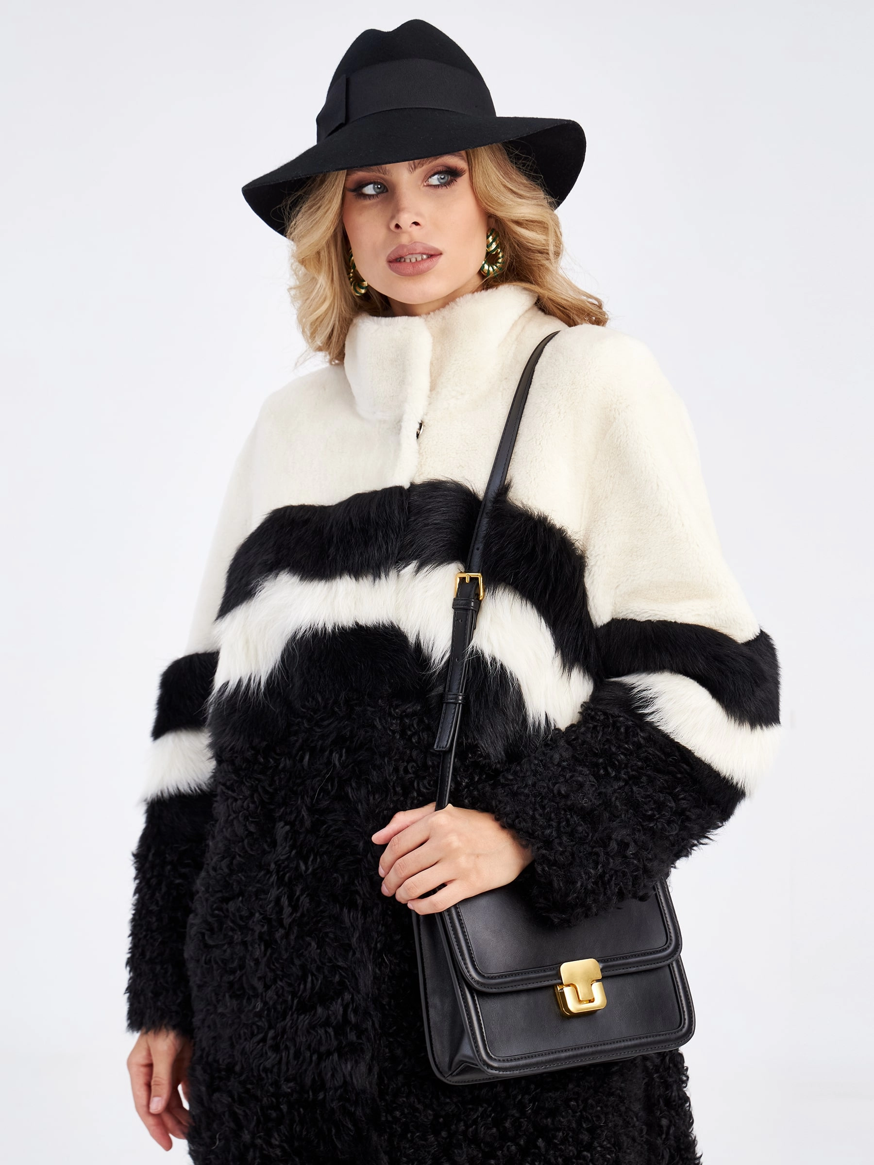 Длинное пальто из натуральной овчины прямого кроя в черно-белом оттенке, станет доказательством того, что можно найти компромисс между красотой и удобством. Выполняя эту модель мастера использовали плотную мягкую овчину в комбинации с шелковистым мехом тиградо. Материал хорошо сохраняет тепло даже в сильный мороз, а воротник - стойка обеспечит особый комфорт в непогоду.