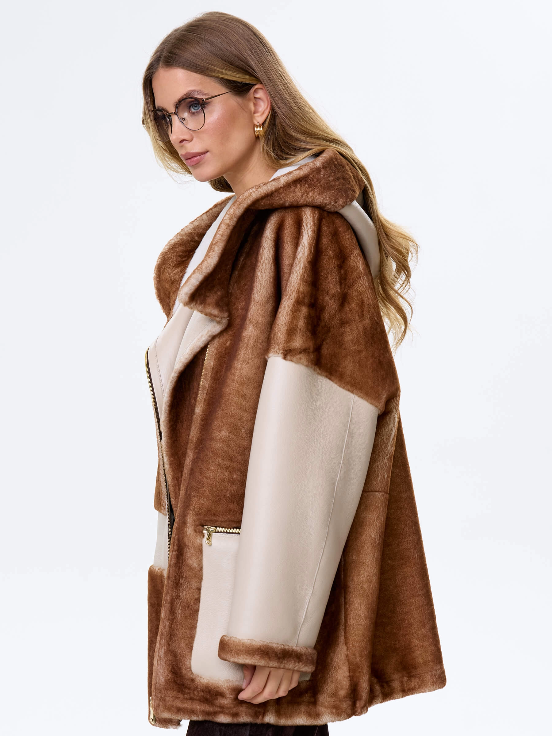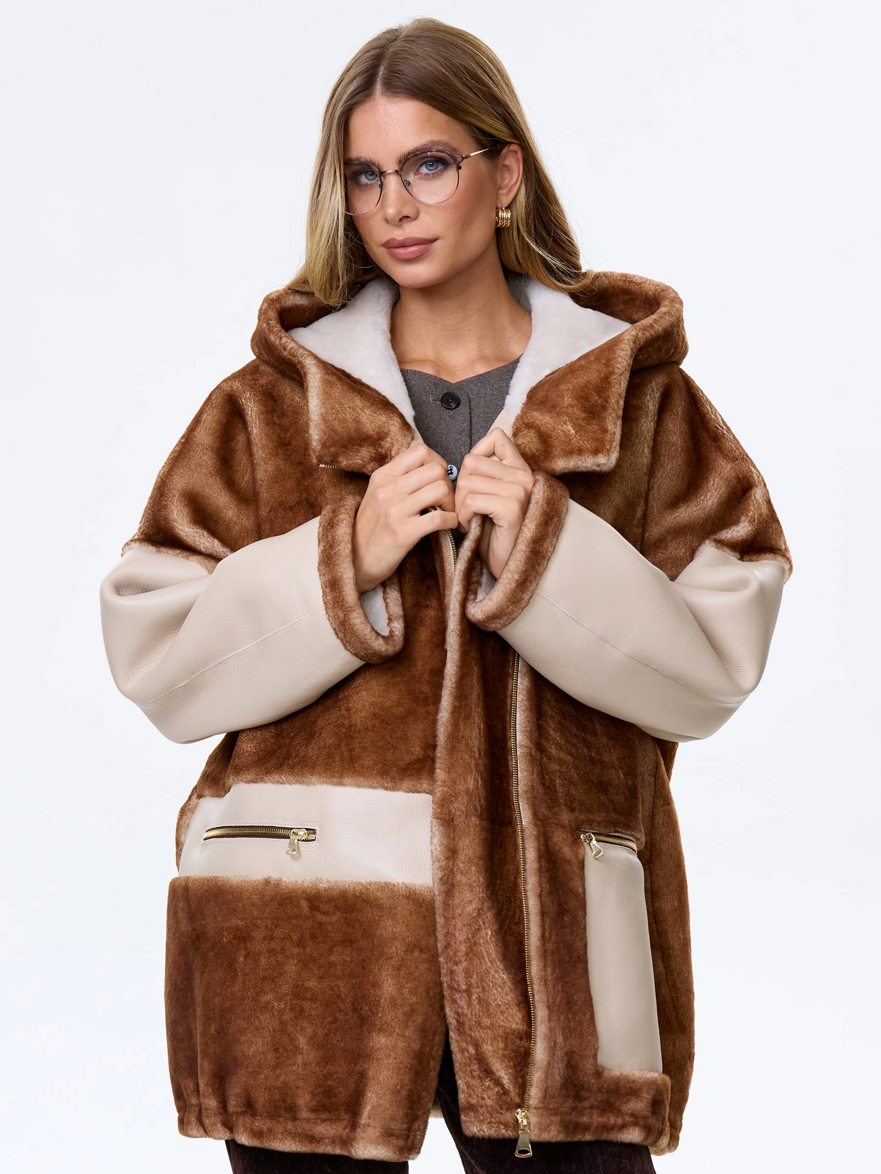 Товар комбинированная женская дубленка с капюшоном из астрагана премиум класса 2058, бежевая, размер 52, артикул 64140 выполнен из овчина "мерино" с застежкой молния. Рассчитан на сезон: осень-зима. Длина изделия 77 см, силуэт свободный.