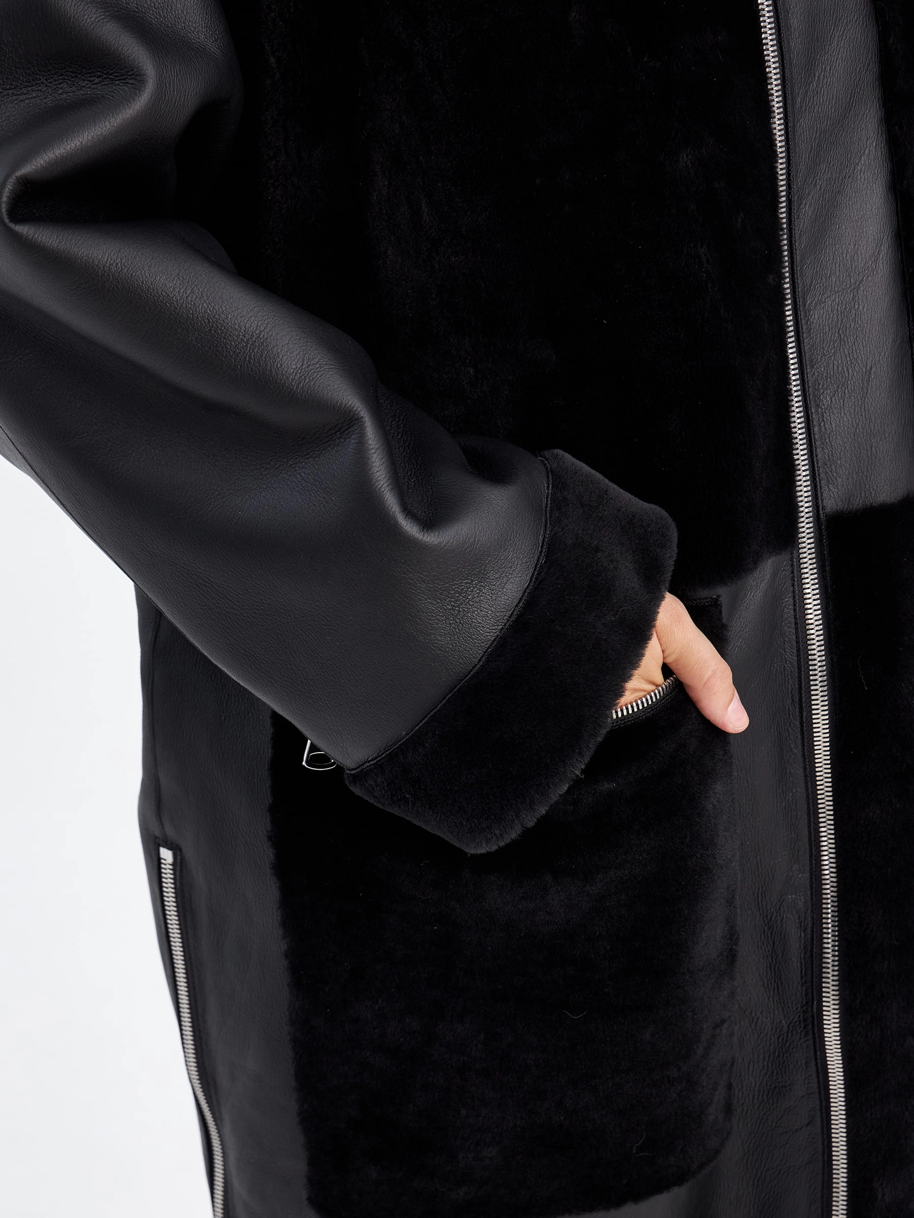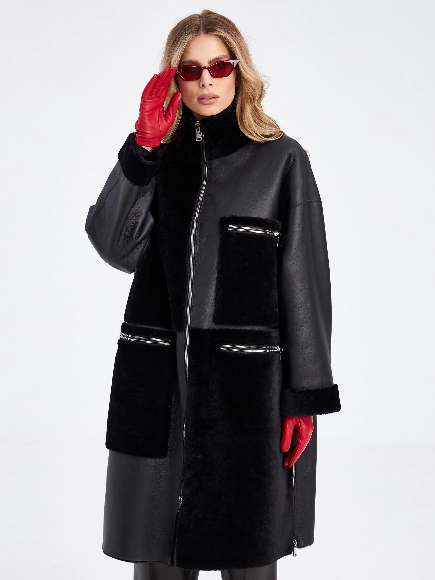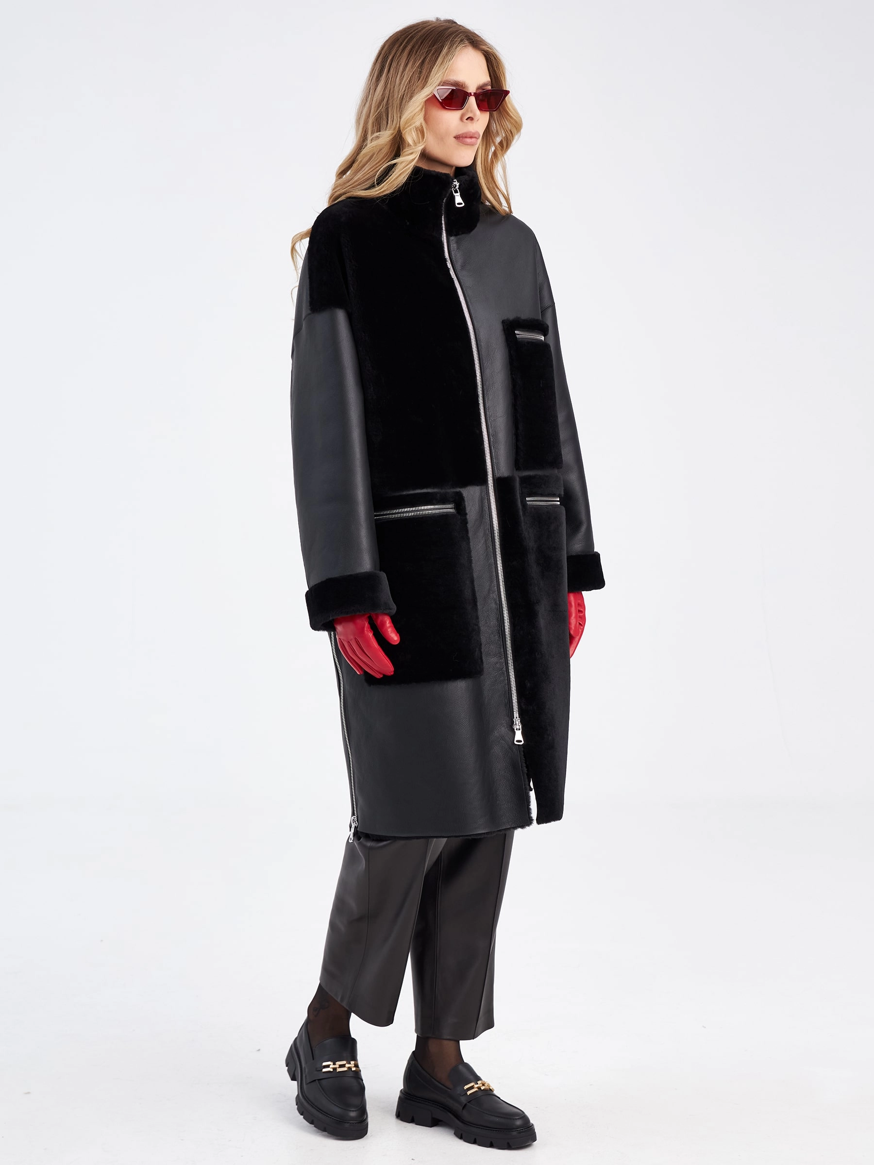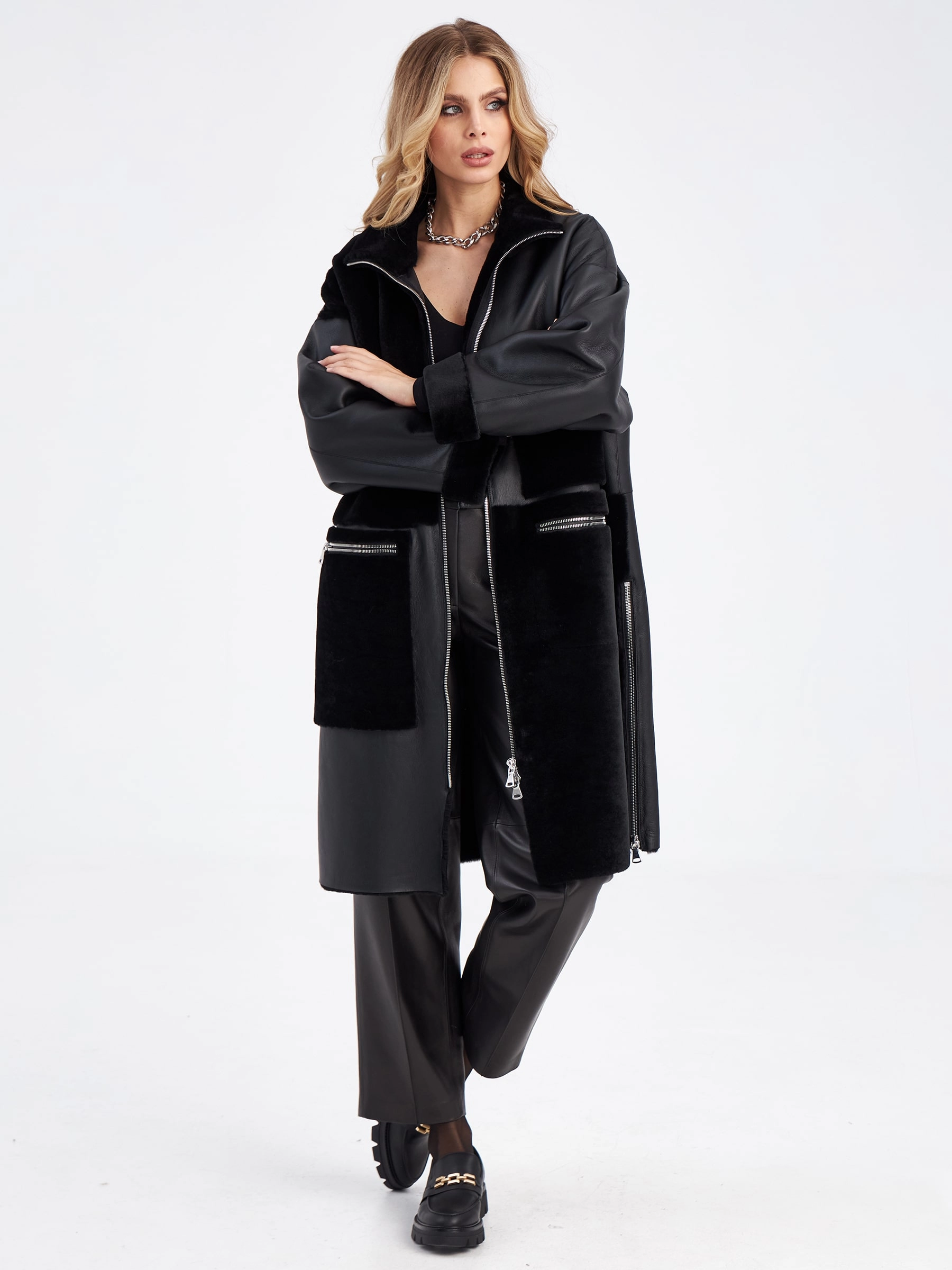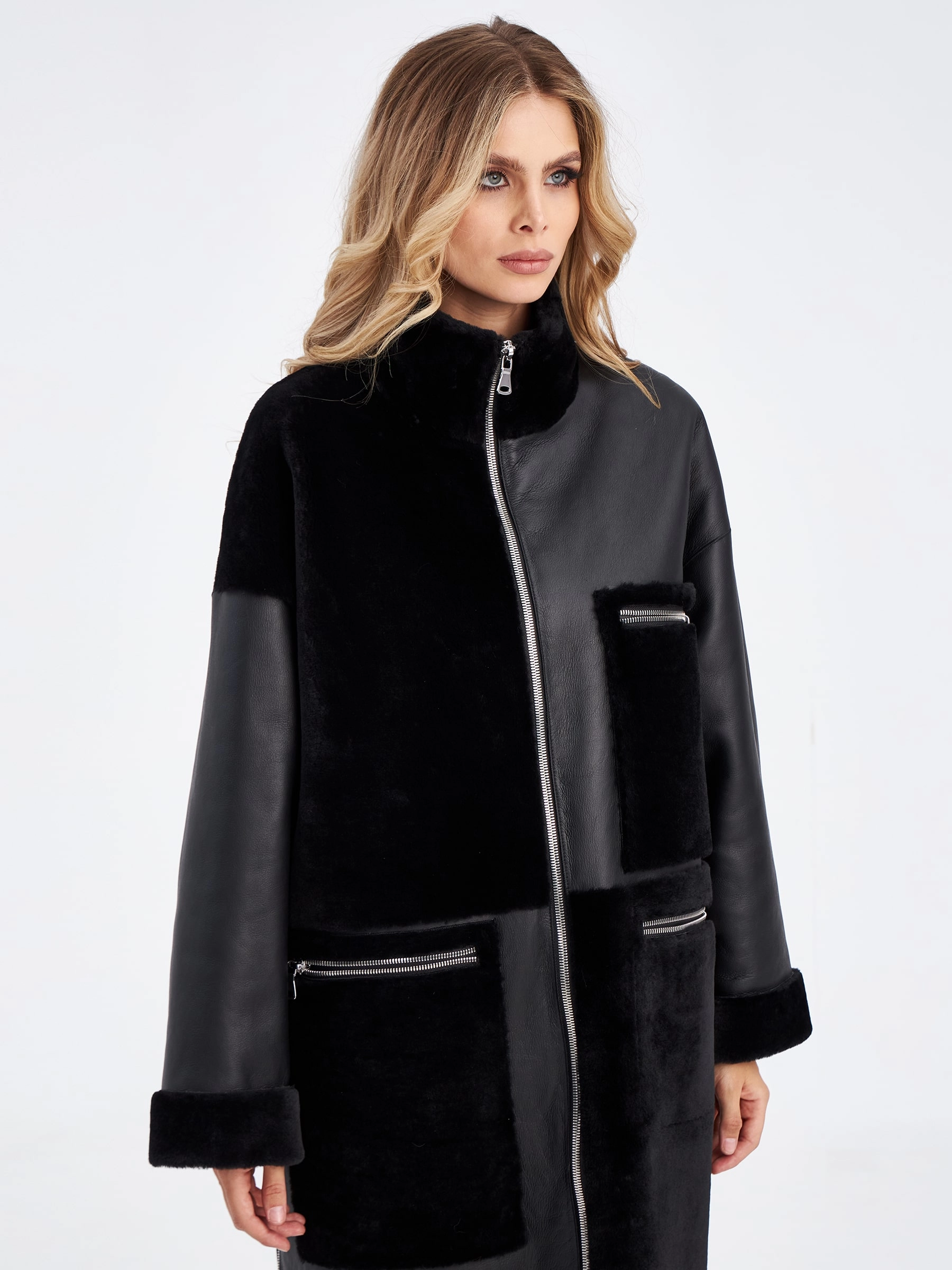 Товар комбинированное молодежное женское пальто из меховой овчины премиум класса 2044, черное, размер 44, артикул 63970 выполнен из овчина "мерино" с застежкой молния. Рассчитан на сезон: осень-зима. Длина изделия 110 см, силуэт прямой.