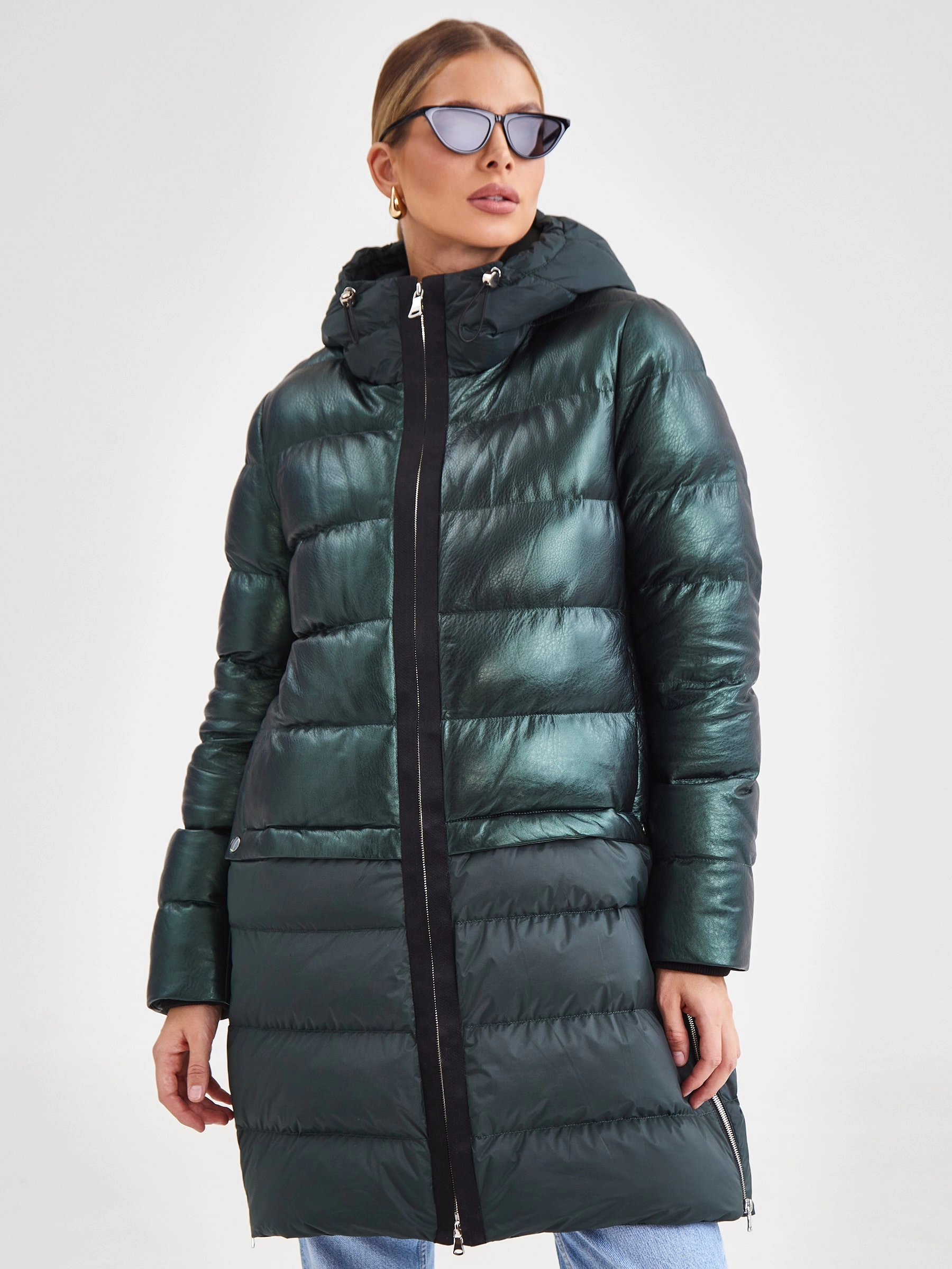 Комбинированный кожаный женский пуховик премиум класса 3049, размер 44, артикул 25460