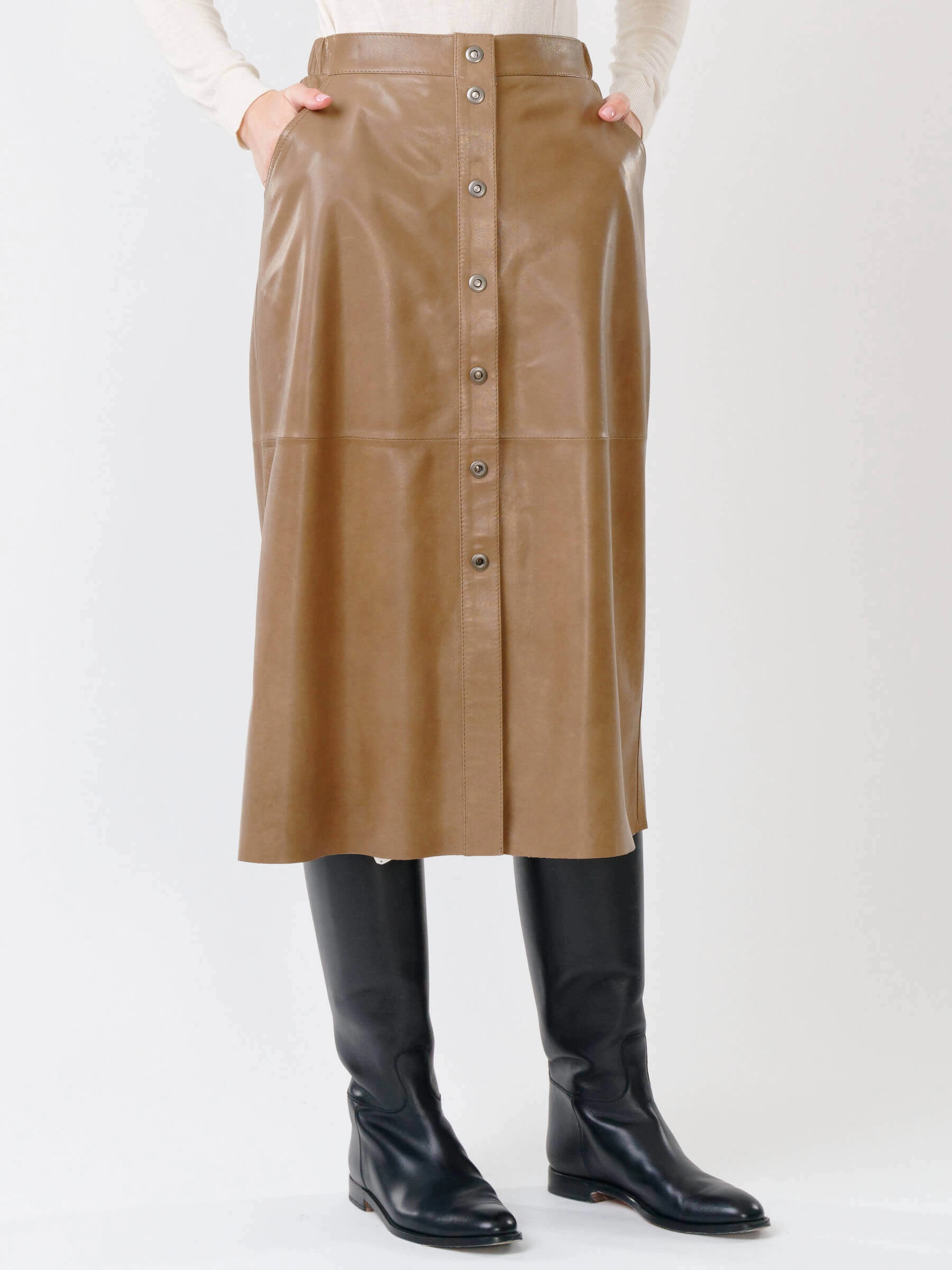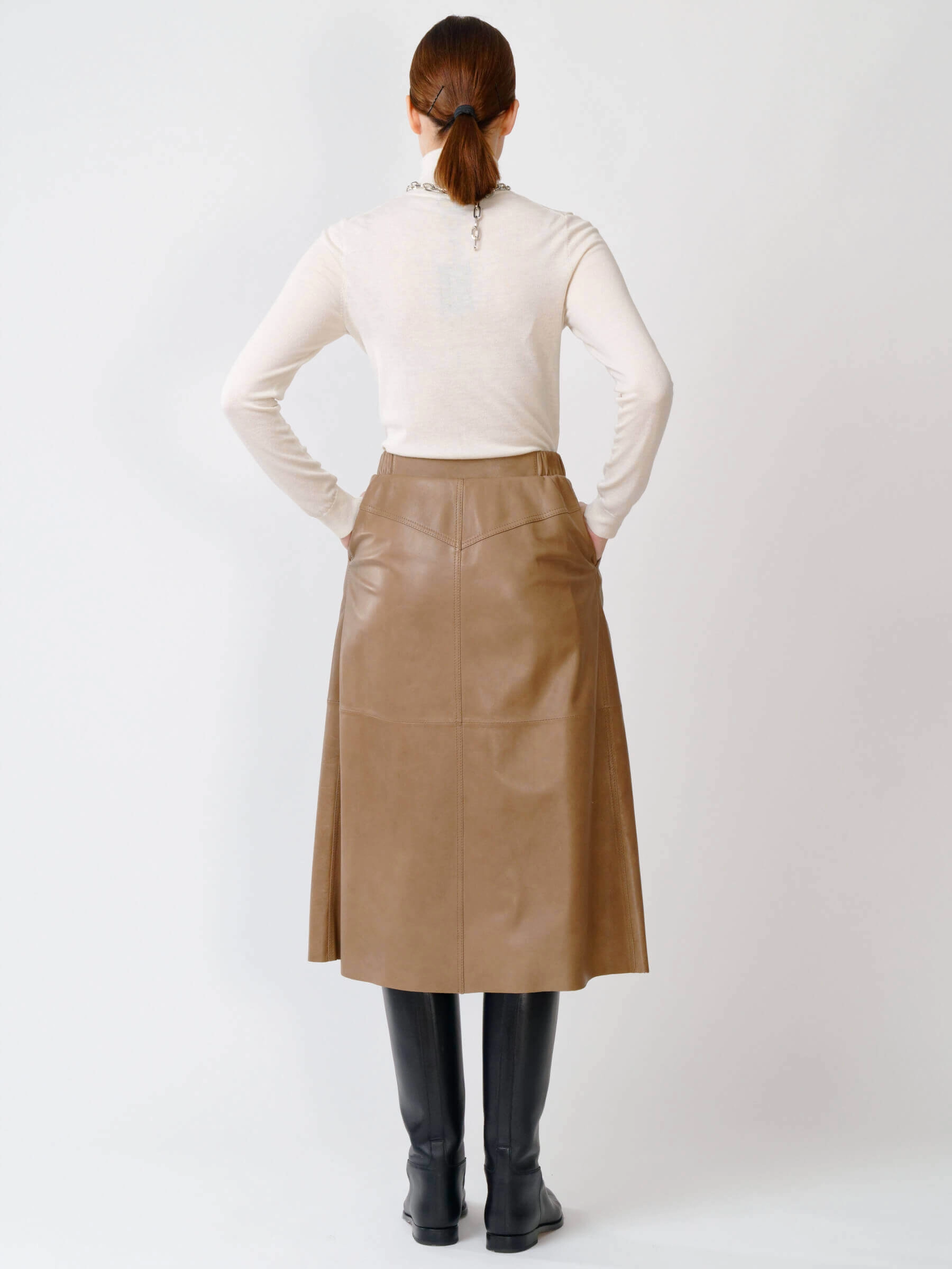 Длинная юбка из натуральной кожи в коричневом оттенке длиной 80 см на кнопках с расклешённым силуэтом обеспечивает безупречную посадку. Мягкая кожа теплого бежево-коричневого тона идеально сочетается с водолазками, объёмными свитерами и кожаными косухами. Дополните образ ботильонами или сапогами на каблуке в тон, добавьте тонкие аксессуары под золото или кожу — получите стильный лук на любой случай. Эта модель в нежном карамельном цвете идеальна для создания элегантных, уютных и одновременно дерзких образов.