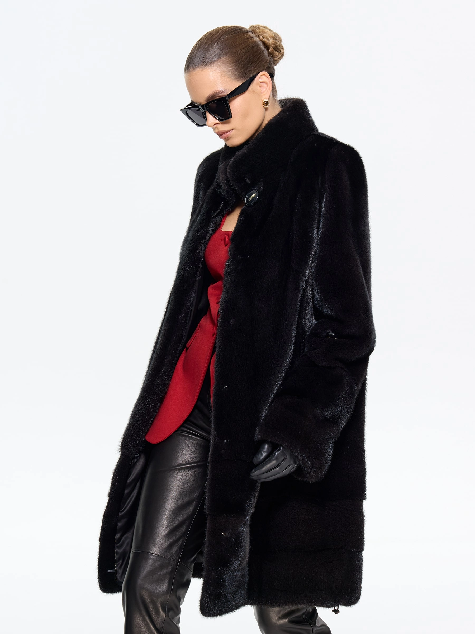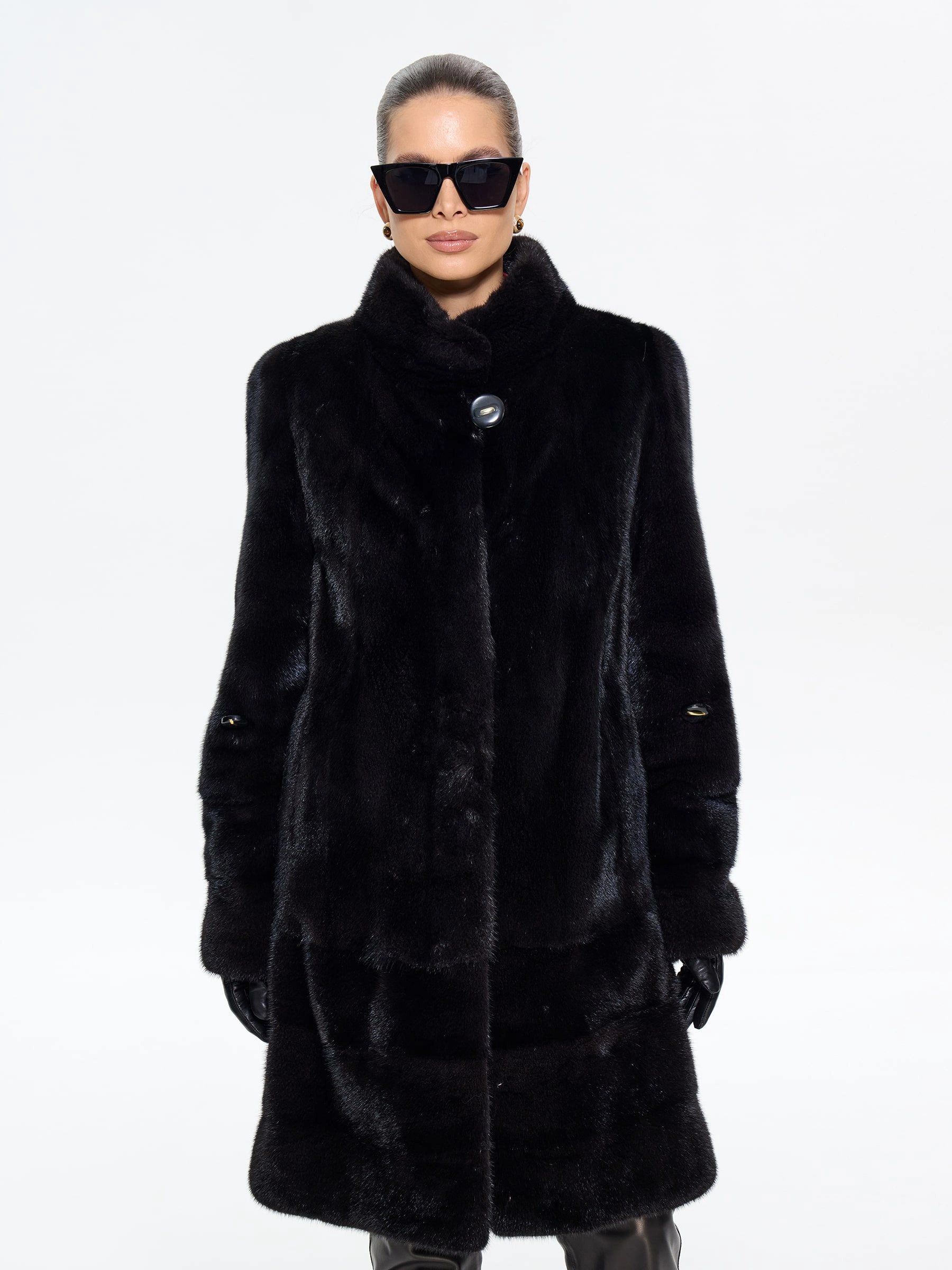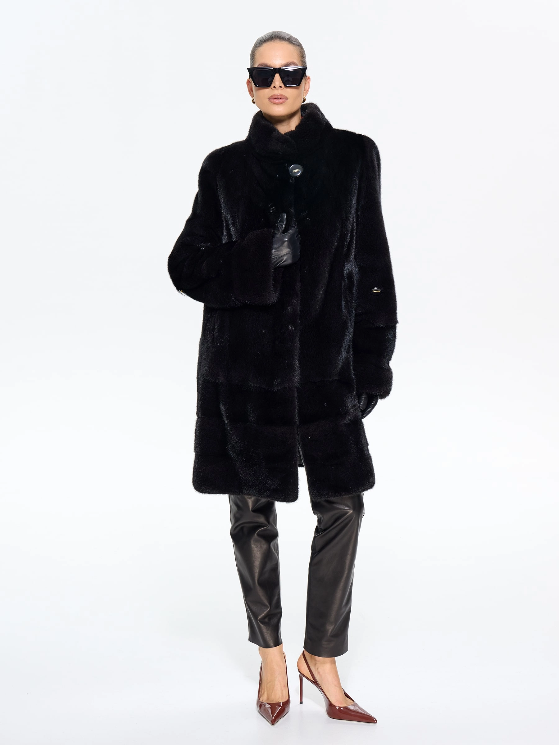 Черная женская норковая шуба прямого силуэта — воплощение классической элегантности и безупречного вкуса: модель длиной 100 см выполнили из меха норки премиум-класса с густым шелковистым ворсом, который дарит благородный блеск и надежное тепло, а диагональная раскладка по подолу и рукавам создает изящную игру света и подчеркивает мастерство исполнения. Лаконичный воротник-стойка добавляет современного звучания, втачные рукава обеспечивают идеальную посадку по фигуре, а продуманные детали делают модель по-настоящему функциональной — удобные карманы и регулируемая внутренняя кулиска позволяют менять силуэт, адаптируя его под ваши предпочтения. Подкладка из смесовой ткани и надежные клипсы гарантируют комфорт при носке и бережное отношение к меху. Совет стилиста: универсальность этой шубы поражает — носите ее с джинсами-скинни и высокими сапогами для повседневной элегантности, с платьем-миди и туфлями на каблуке для выхода в свет или с узкими брюками и водолазкой для офисного стиля; ее утонченная классика покори