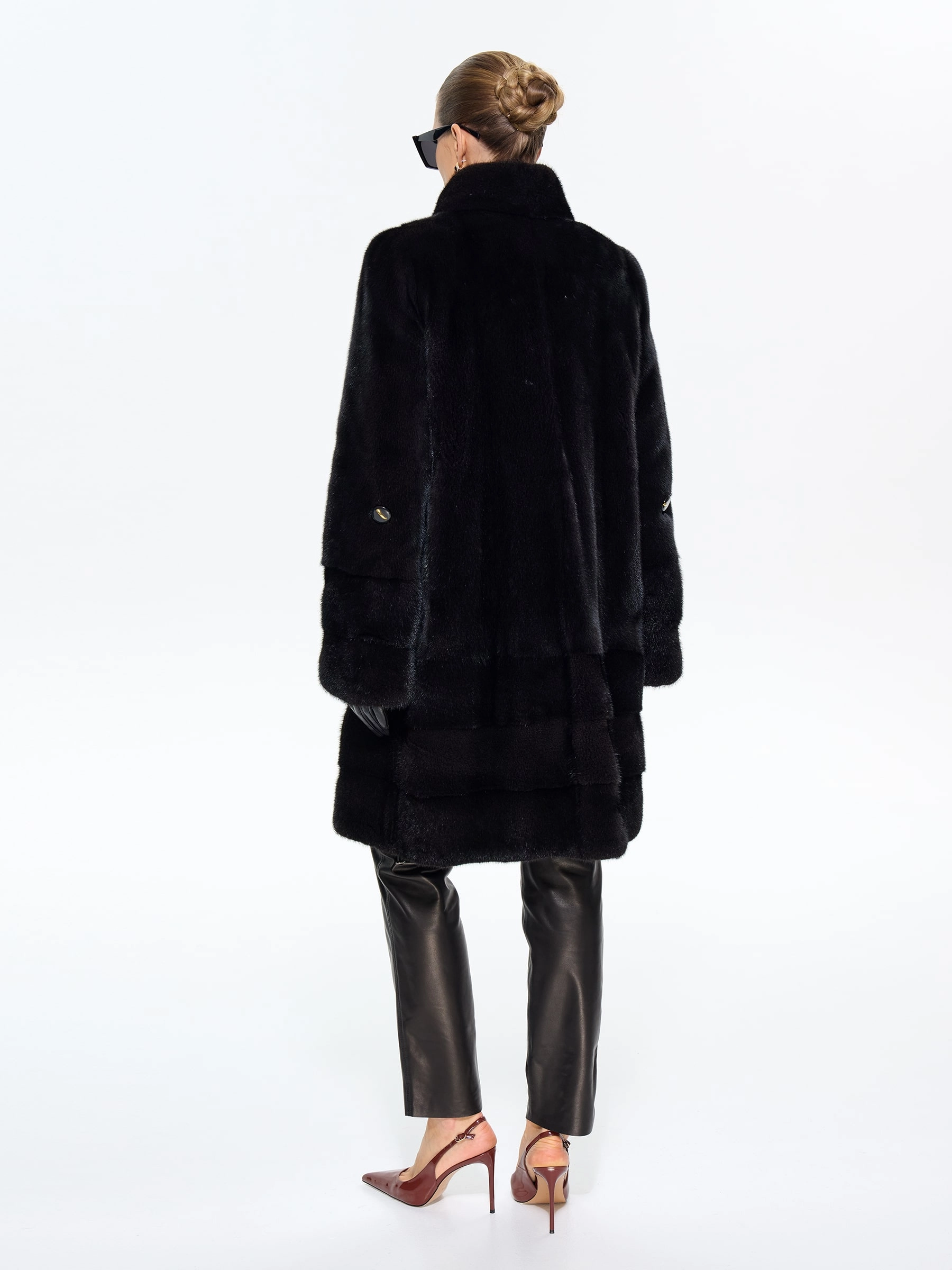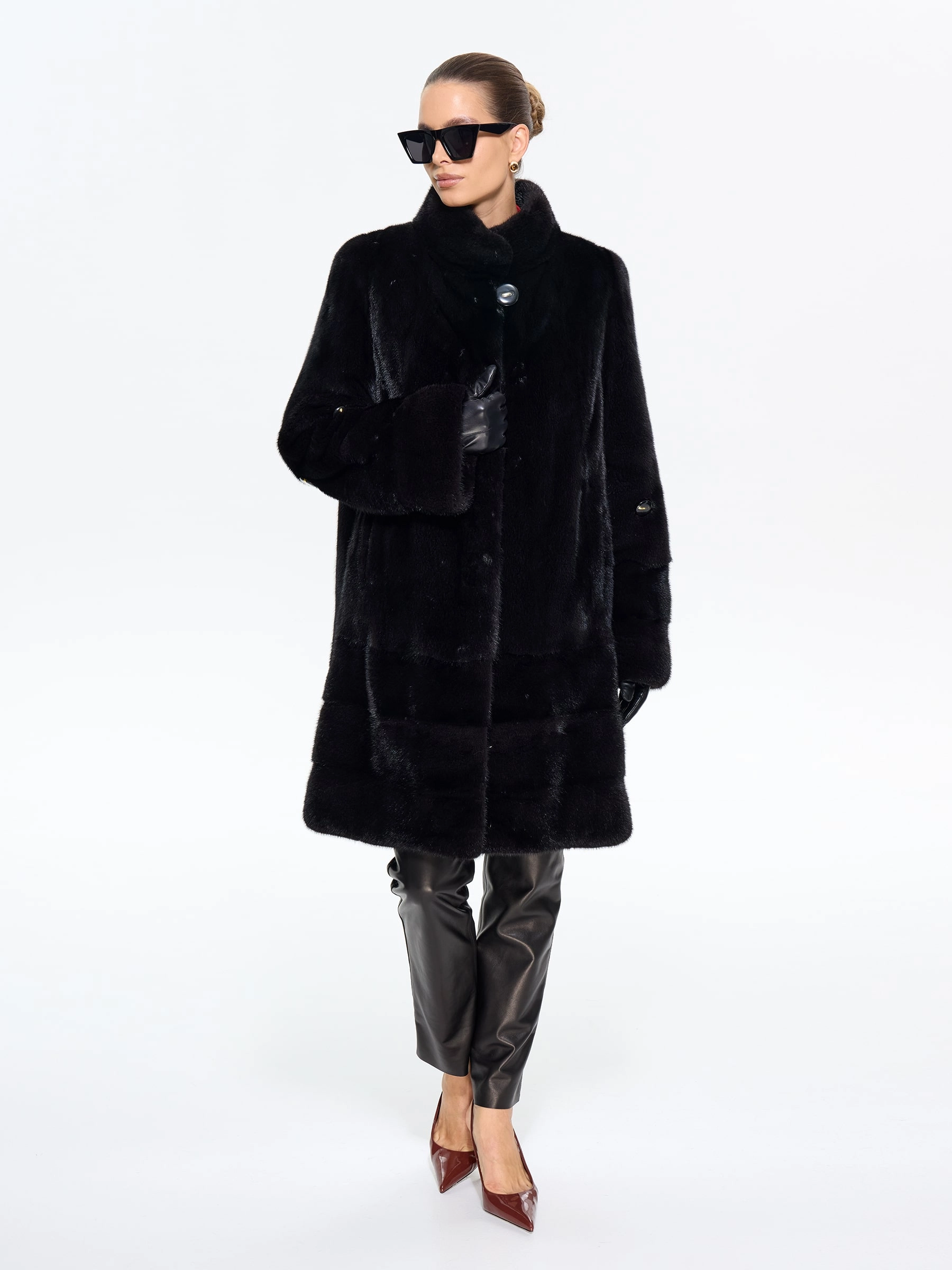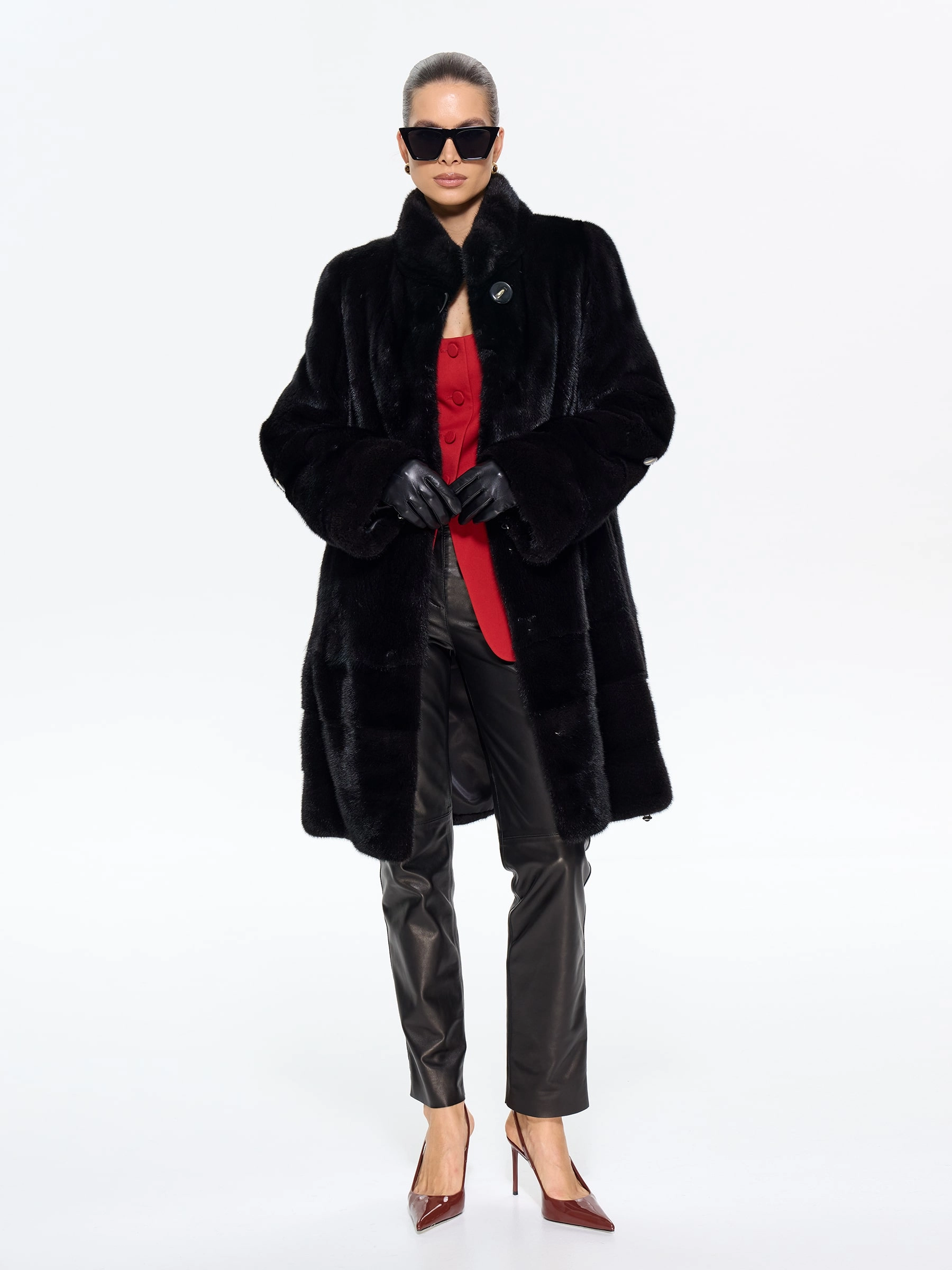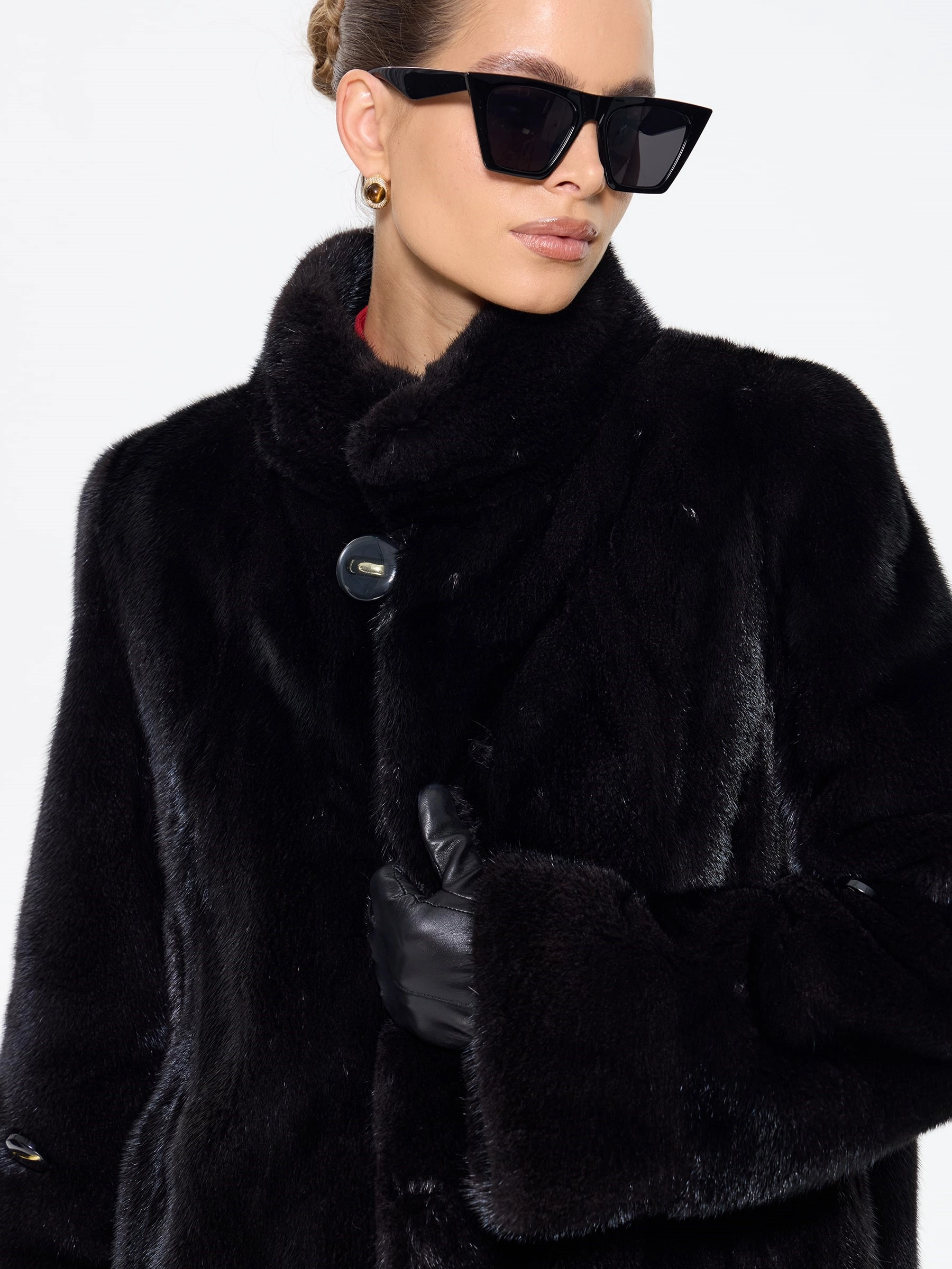 Черная женская норковая шуба прямого силуэта — воплощение классической элегантности и безупречного вкуса: модель длиной 100 см выполнили из меха норки премиум-класса с густым шелковистым ворсом, который дарит благородный блеск и надежное тепло, а диагональная раскладка по подолу и рукавам создает изящную игру света и подчеркивает мастерство исполнения. Лаконичный воротник-стойка добавляет современного звучания, втачные рукава обеспечивают идеальную посадку по фигуре, а продуманные детали делают модель по-настоящему функциональной — удобные карманы и регулируемая внутренняя кулиска позволяют менять силуэт, адаптируя его под ваши предпочтения. Подкладка из смесовой ткани и надежные клипсы гарантируют комфорт при носке и бережное отношение к меху. Совет стилиста: универсальность этой шубы поражает — носите ее с джинсами-скинни и высокими сапогами для повседневной элегантности, с платьем-миди и туфлями на каблуке для выхода в свет или с узкими брюками и водолазкой для офисного стиля; ее утонченная классика покори