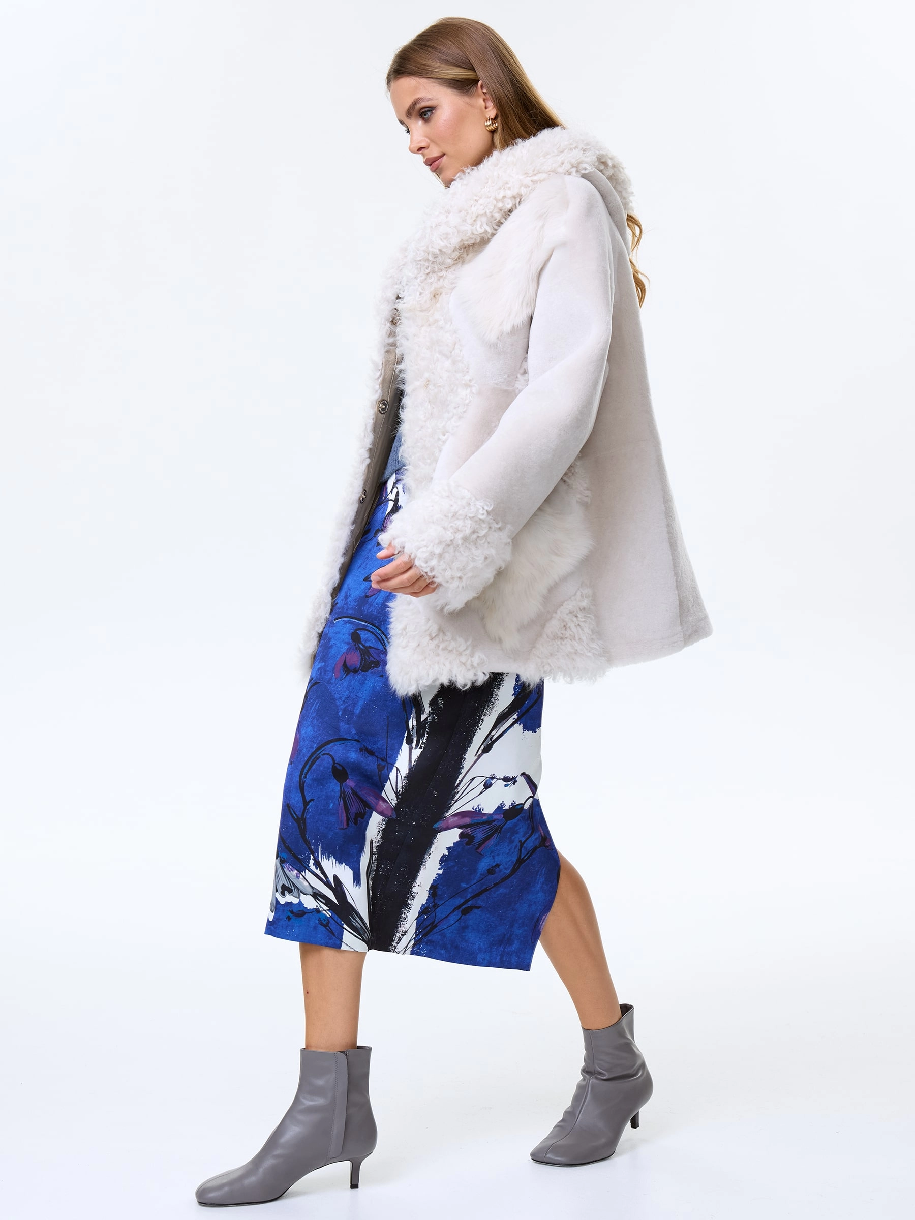 Товар короткая комбинированная женская дубленка с мехом тиградо премиум класса 2027, белая, размер 44, артикул 64190 выполнен из овчина "мерино" с застежкой кнопки. Рассчитан на сезон: осень-зима. Длина изделия 73 см, силуэт свободный.