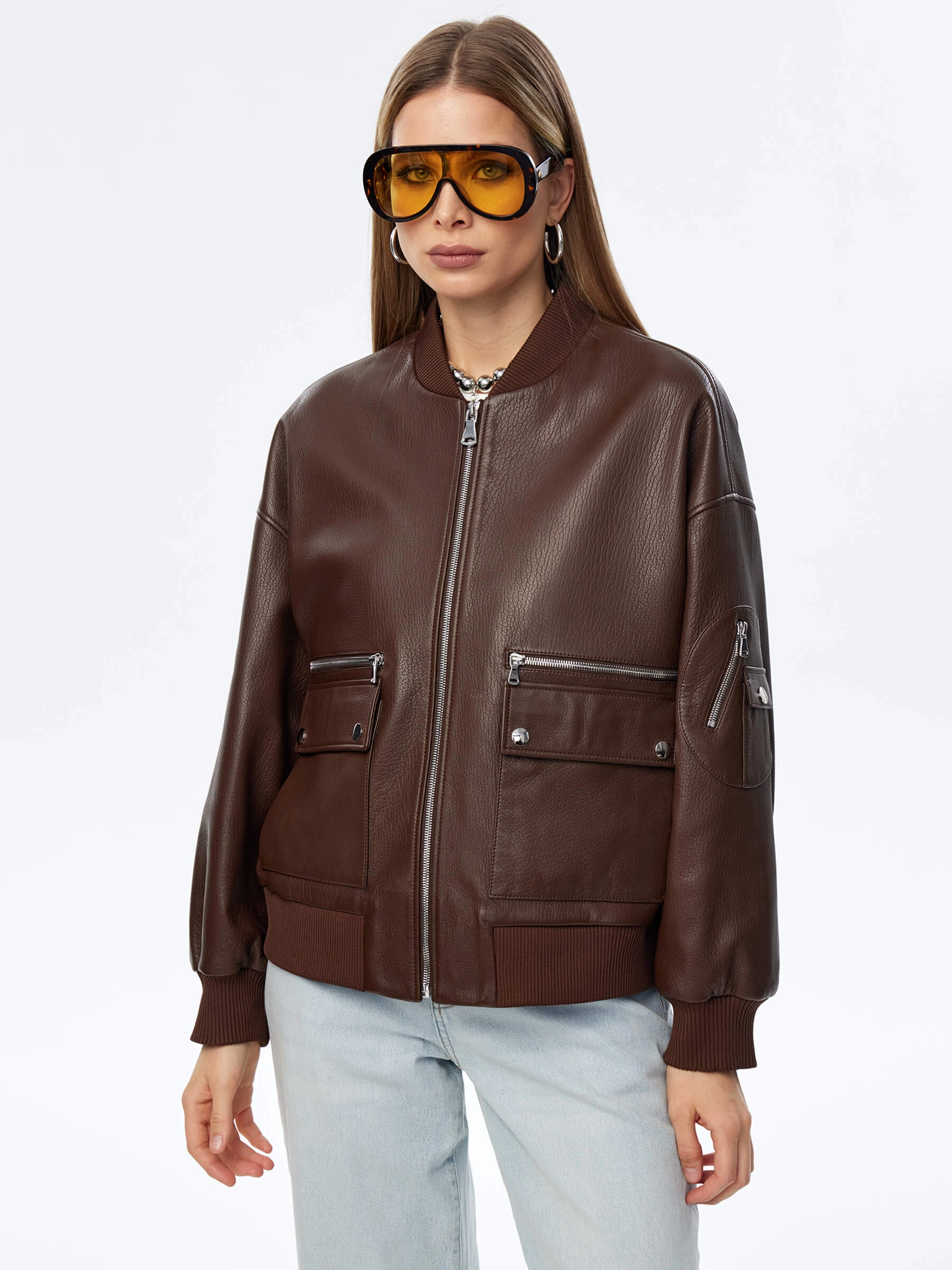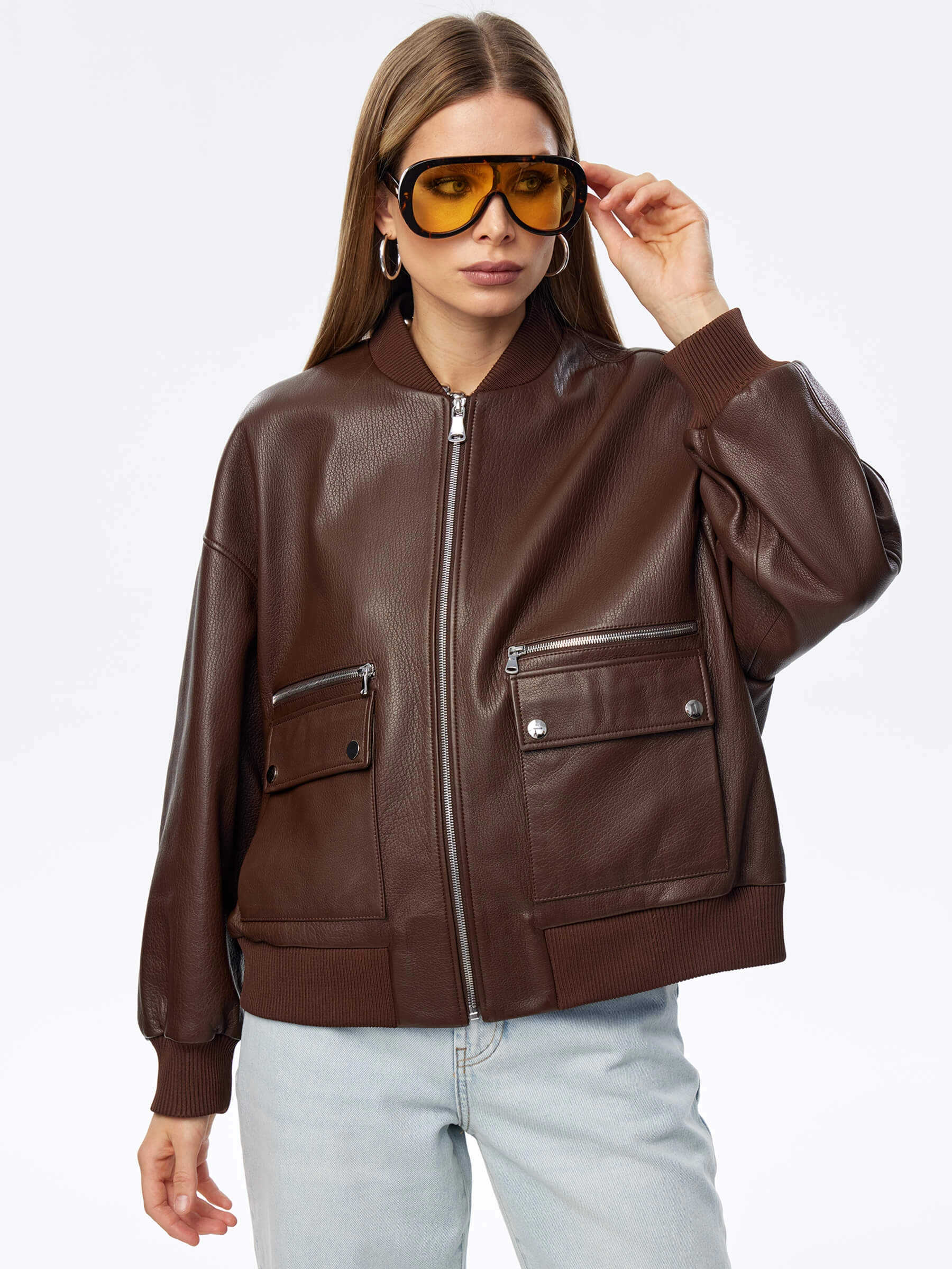 Товар короткая кожаная куртка бомбер для женщин премиум класса 3064, коричневая, размер 46, артикул 24030 выполнен из натуральной кожи с застежкой молния. Рассчитан на сезон: весна-осень. Длина изделия 60 см, силуэт свободный.
