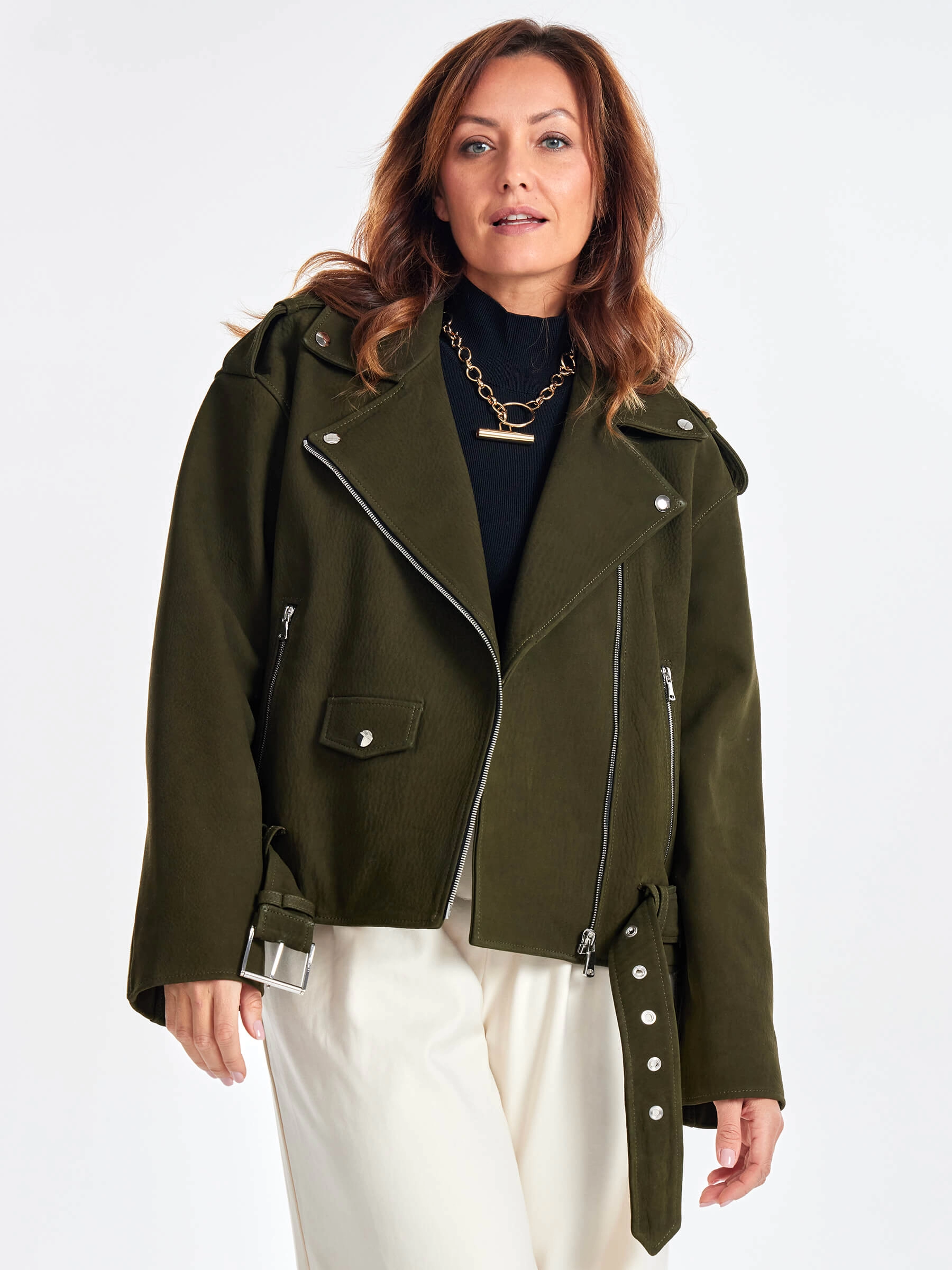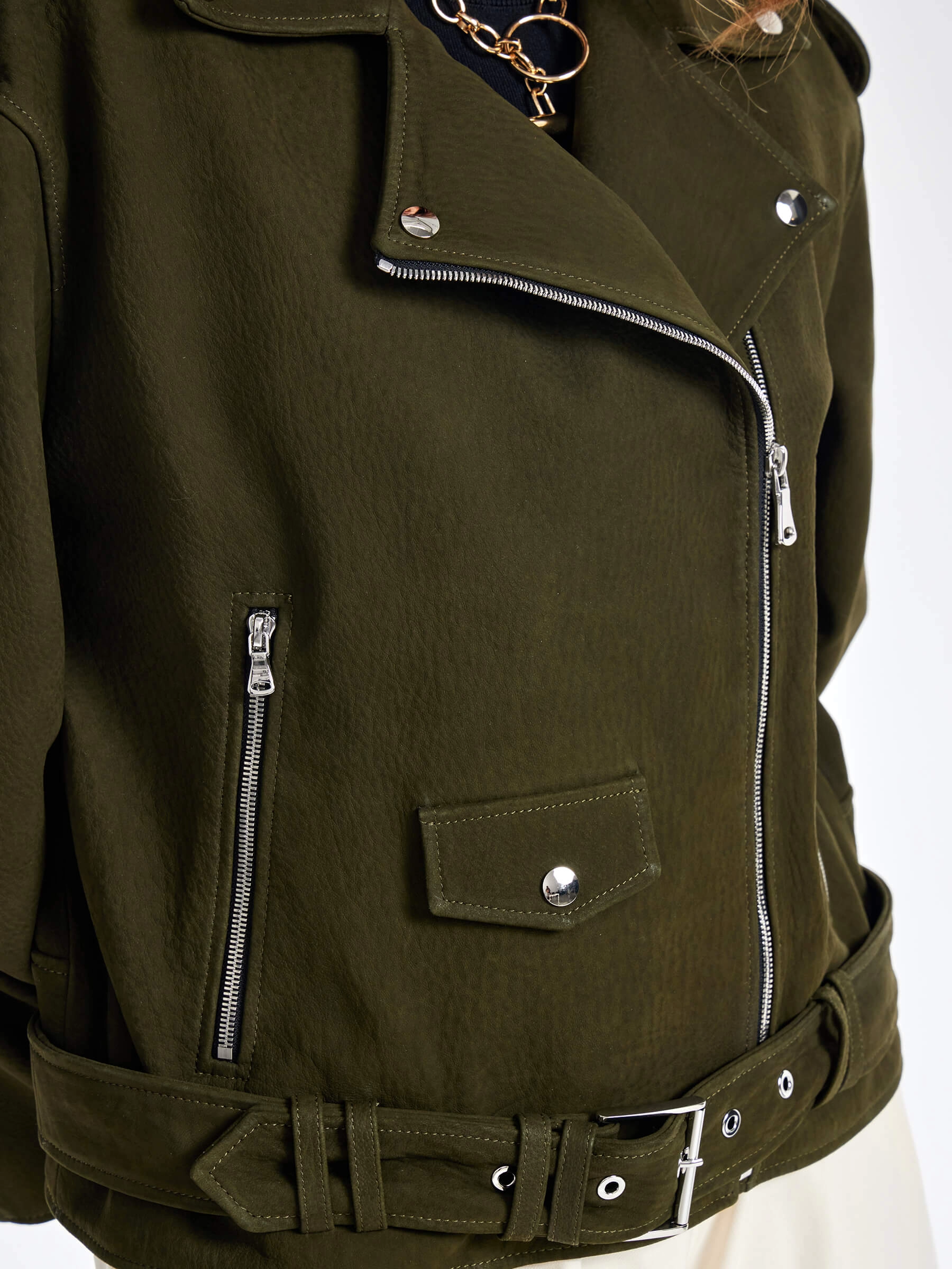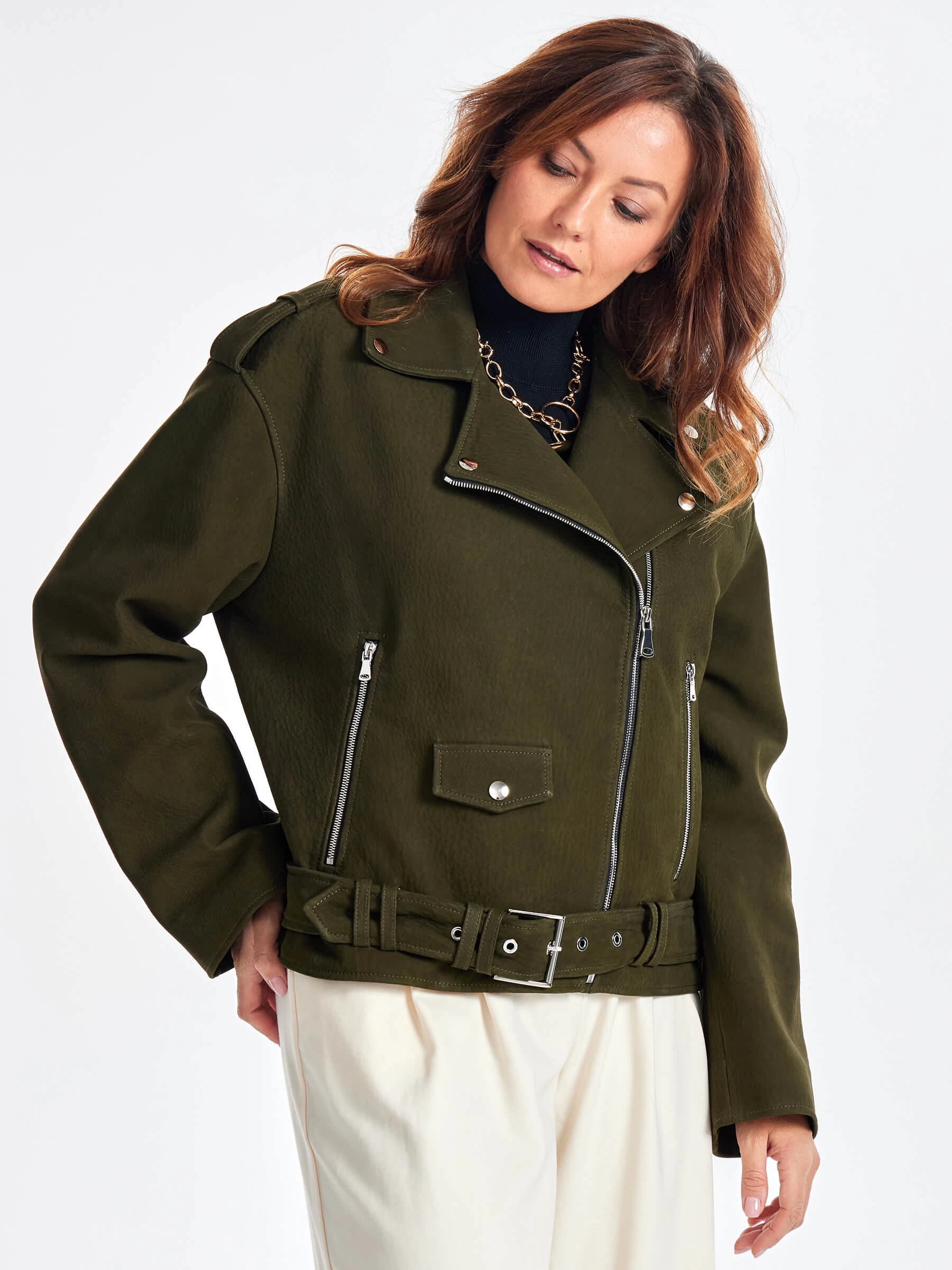 Товар короткая кожаная куртка косуха с поясом для женщин премиум класса 3052, хаки, размер 44, артикул 23460 выполнен из натуральной кожи. Рассчитан на сезон: весна-осень. Длина изделия 60 см, силуэт свободный.