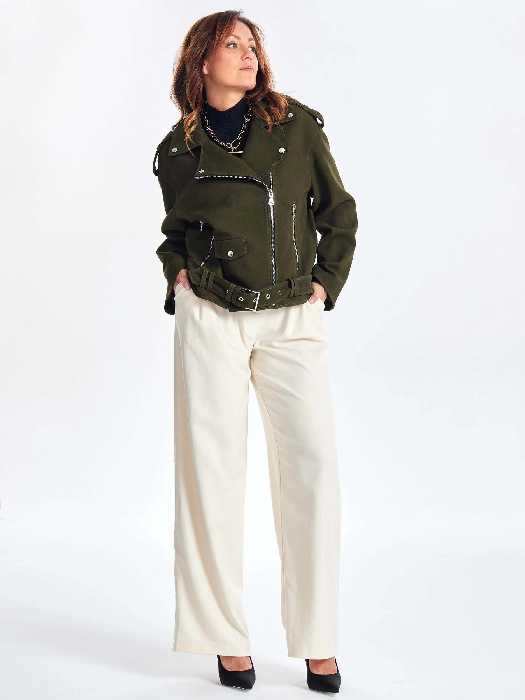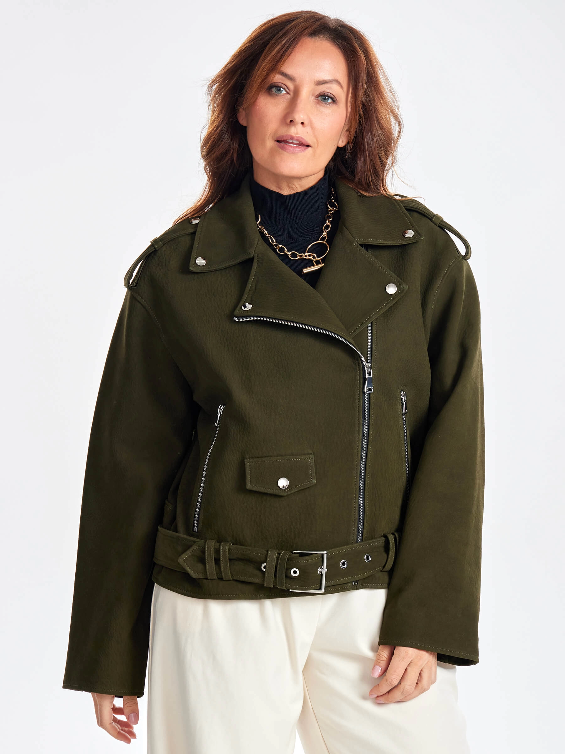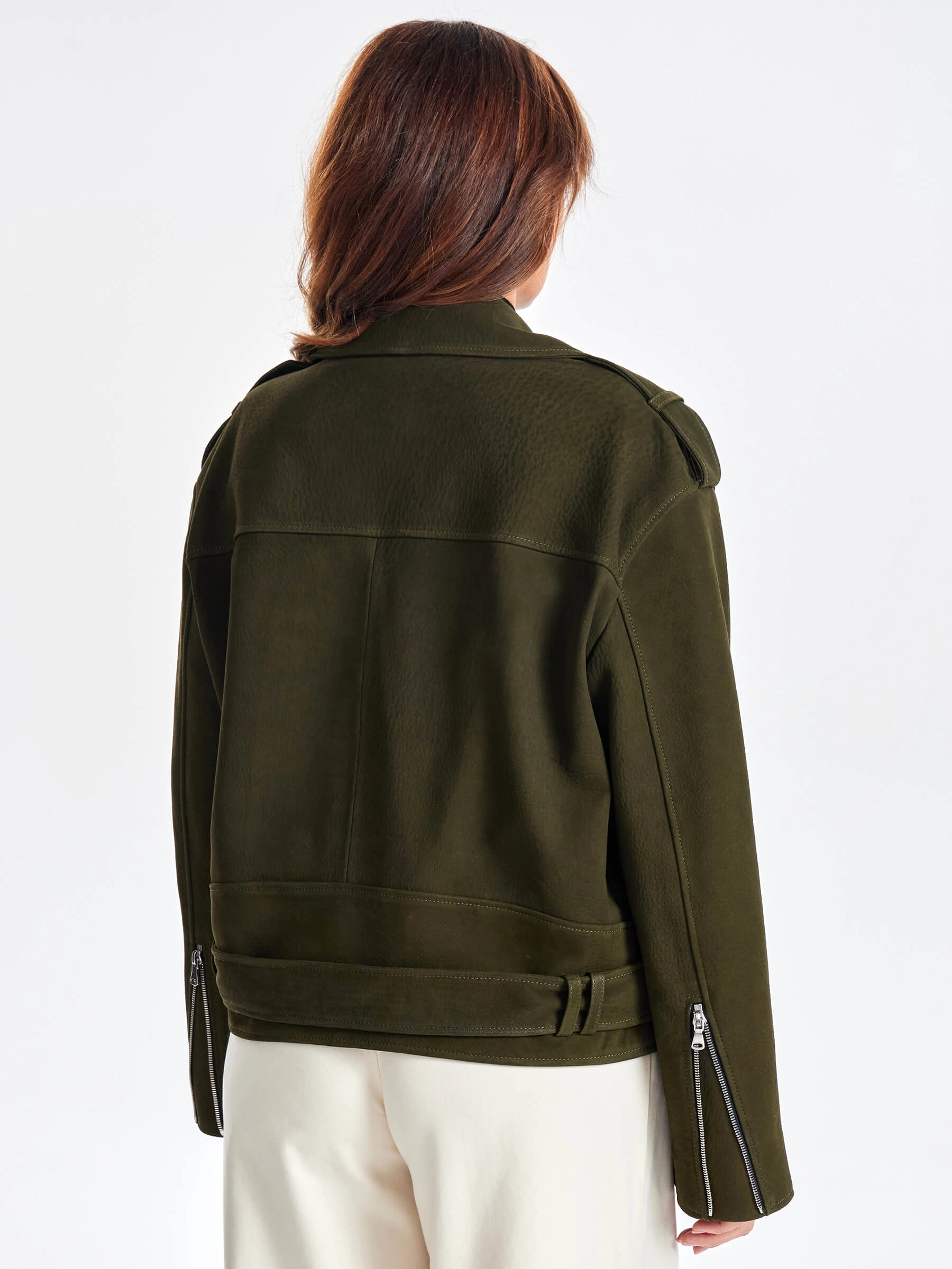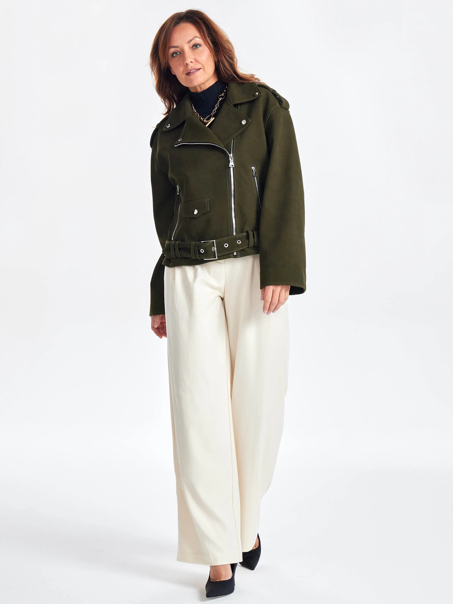 Товар короткая кожаная куртка косуха с поясом для женщин премиум класса 3052, хаки, размер 44, артикул 23460 выполнен из натуральной кожи. Рассчитан на сезон: весна-осень. Длина изделия 60 см, силуэт свободный.
