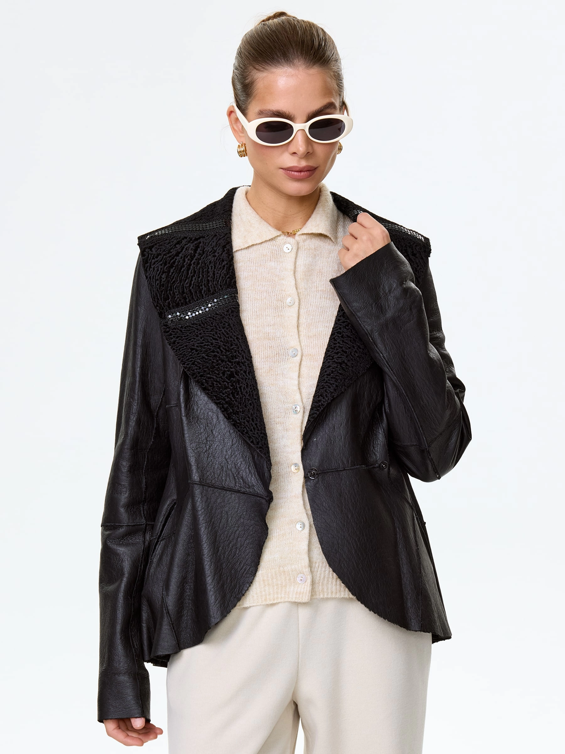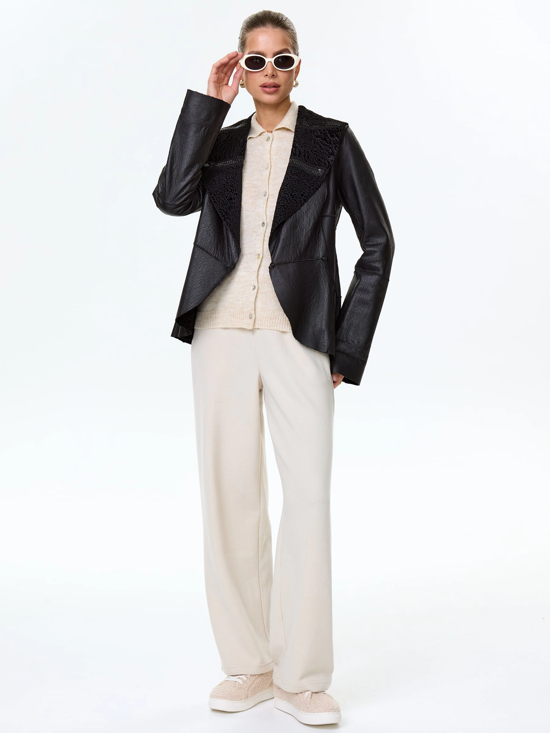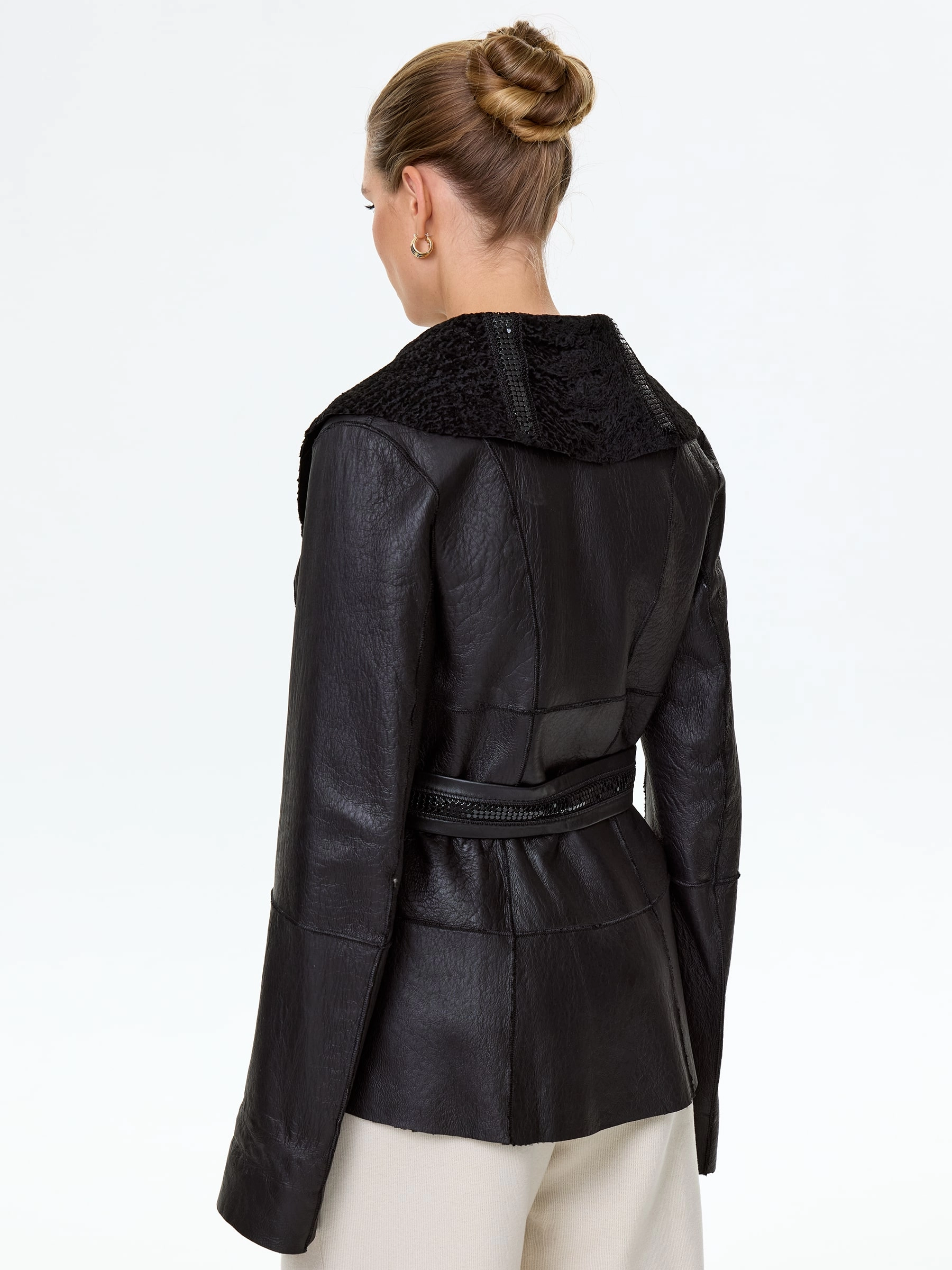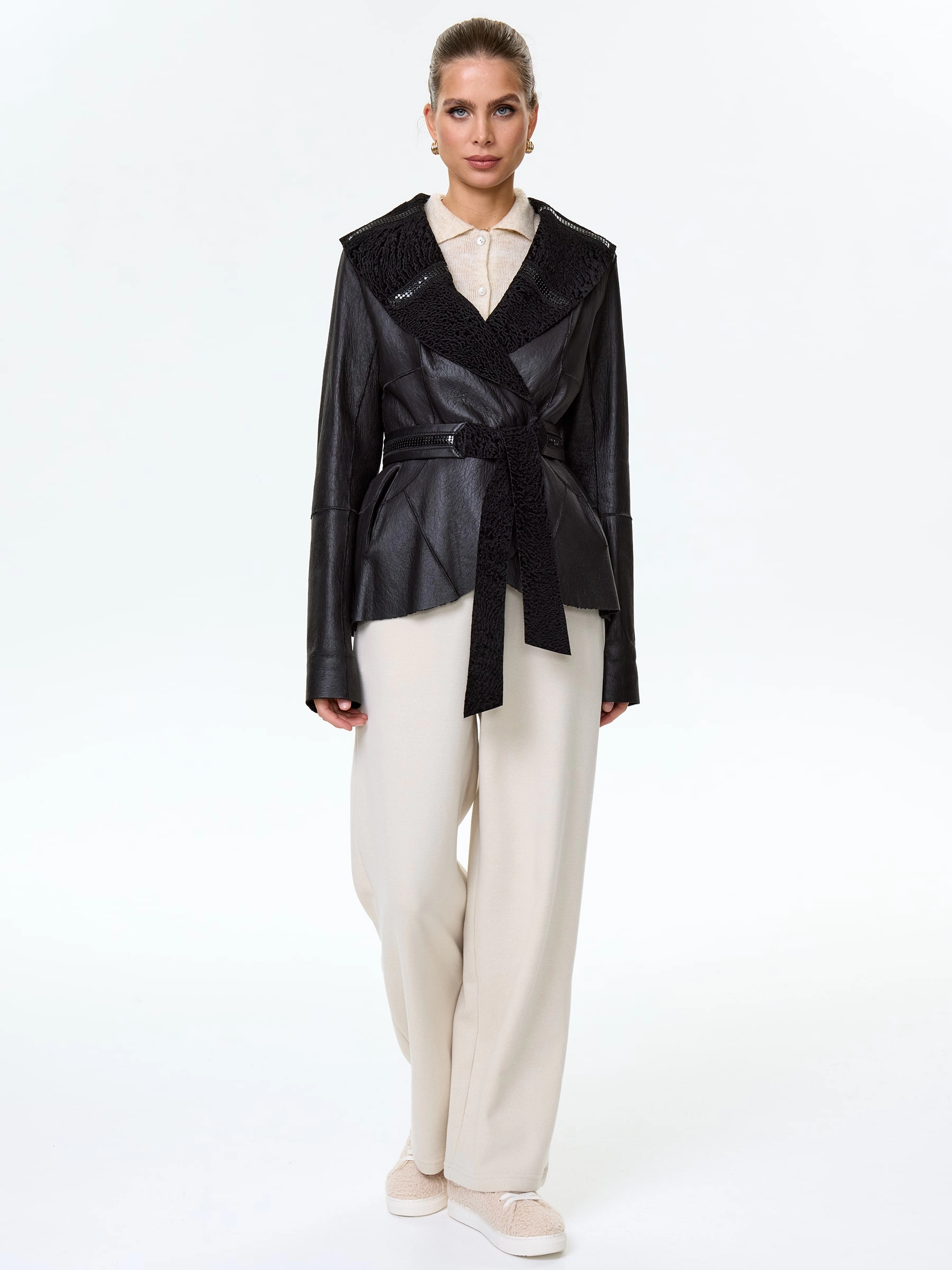 Приталенную двухстороннюю дубленку выполнили из нежнейшего меха новозеландского ягненка, близкого по восприятию к каракульче. Изделие можно носить и гладкой и фактурной стороной наружу. Шалевидный воротник декорировали паедками. Дополнением к модели послужил широкий кожаный пояс.