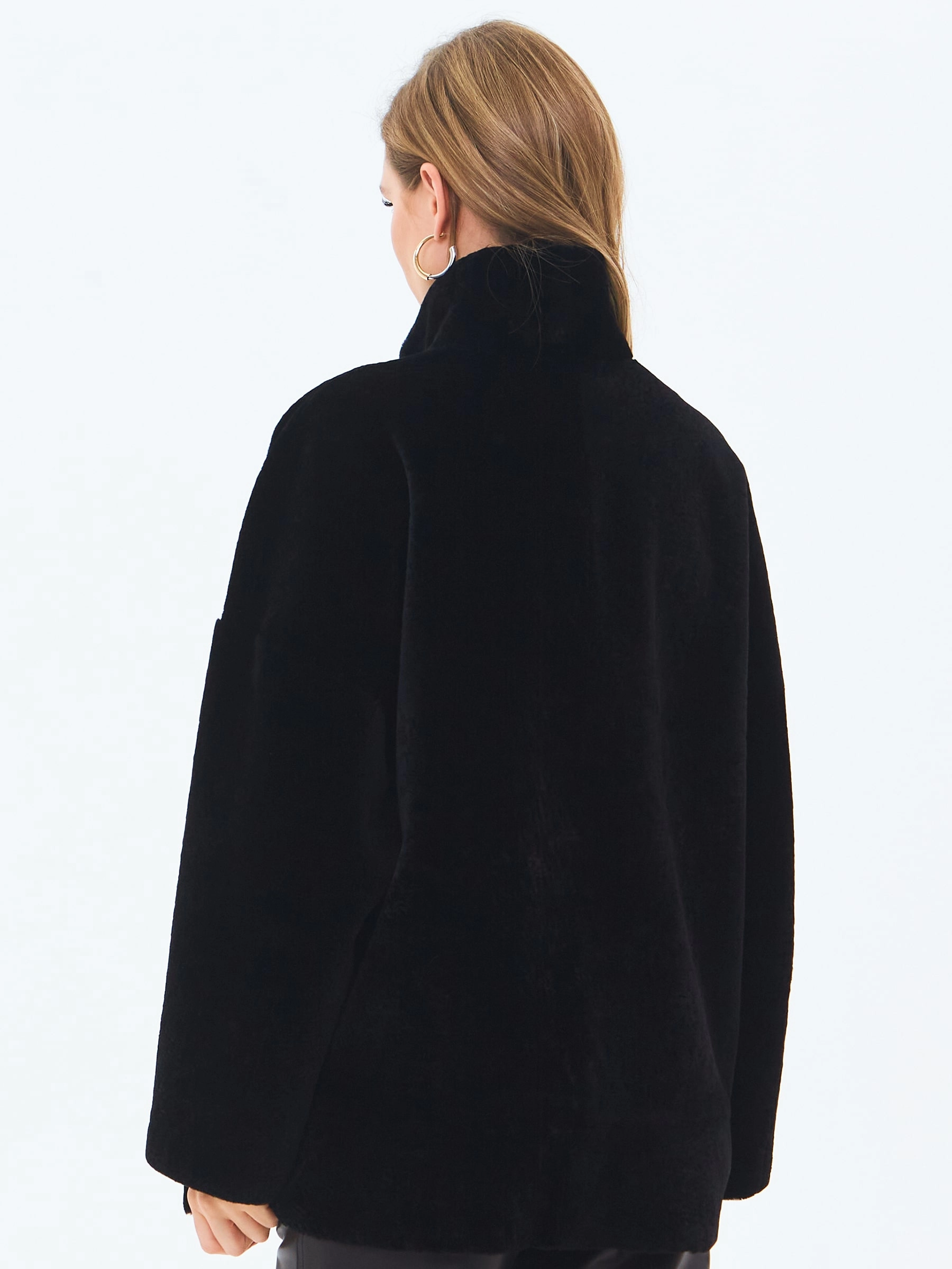 Для пошива короткой дубленки использовали мех овчины астраган тонкой выделки. Изделие свободного кроя комфортно садится по фигуре не ограничивая движения. Модель с воротником- стойка и двумя врезными карманами застегивается крупной молнией.