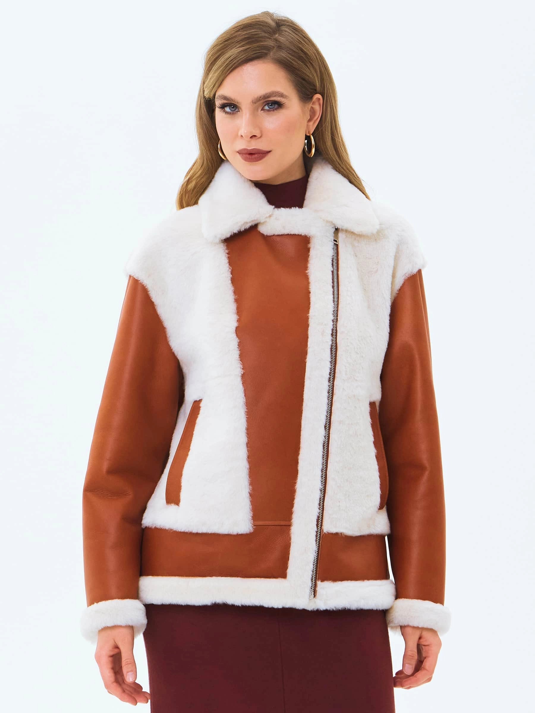 Укороченную дубленку-косуху выполнили из натуральной овчины мерино, сочетая детали с гладкой и меховой поверхностью. Модель свободного кроя с отложным воротником и широкими лацканами хорошо удерживает тепло в холодную погоду,надежно защитит от ветра. Изделие дополнили двумя врезными карманами и застежкой в виде крупной молнии.