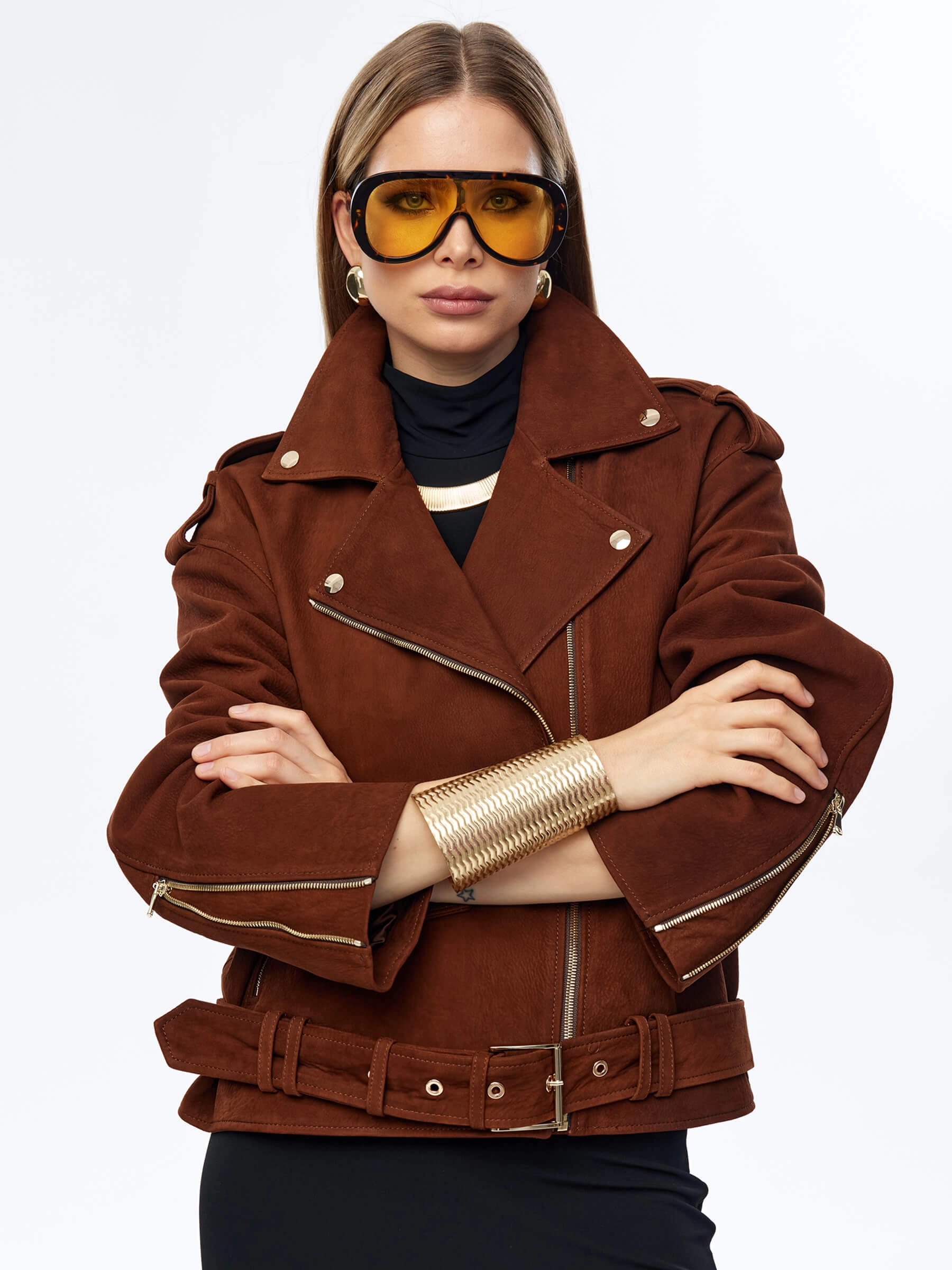 Для пошива укороченной косухи с погонамии и регулируемым поясом с пряжкой, использовали фактурную матовую кожу премиум класса. Модель свободного силуэта, со спущенной линией плеч не сковывает движения, комфортно садится по фигуре. Изделие с широкими лацканами и множеством карманов, подчеркнули серебристыми молниями.