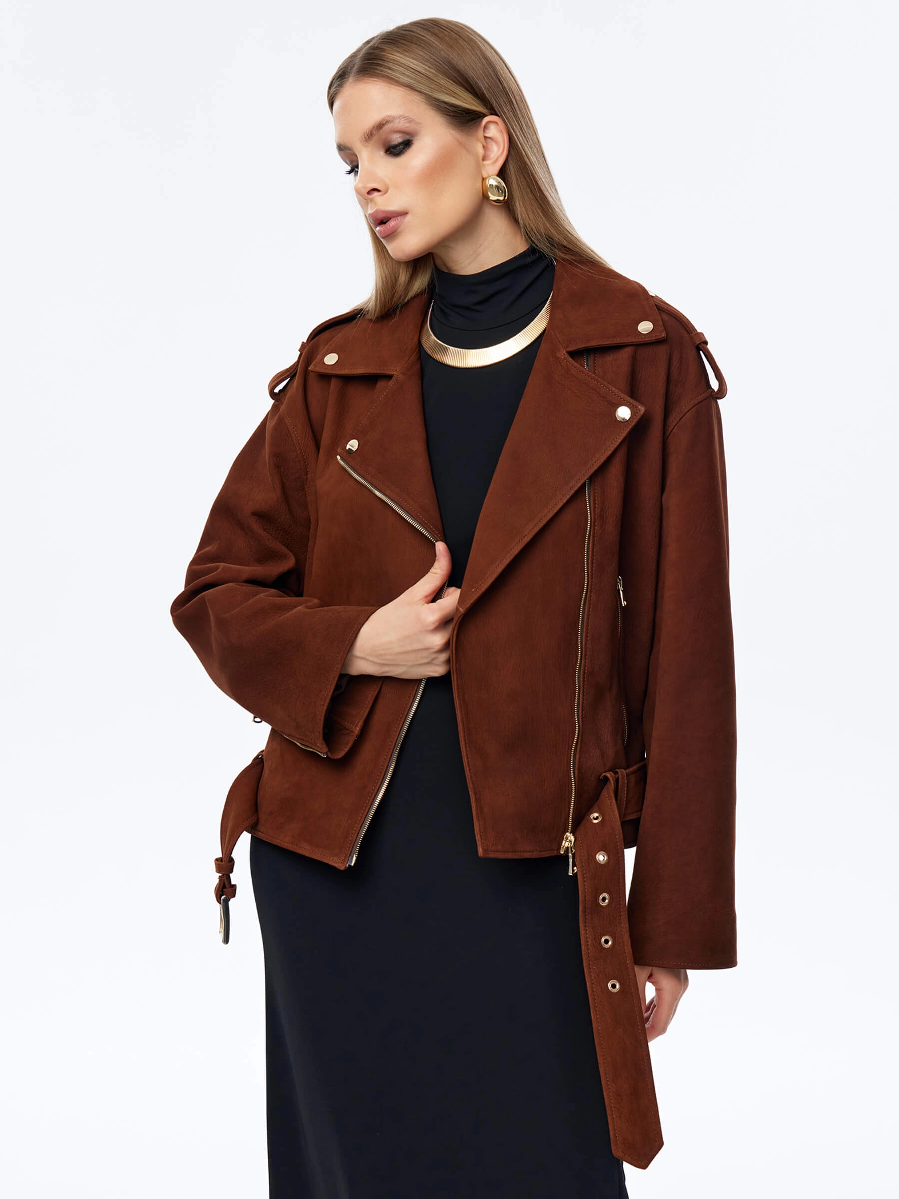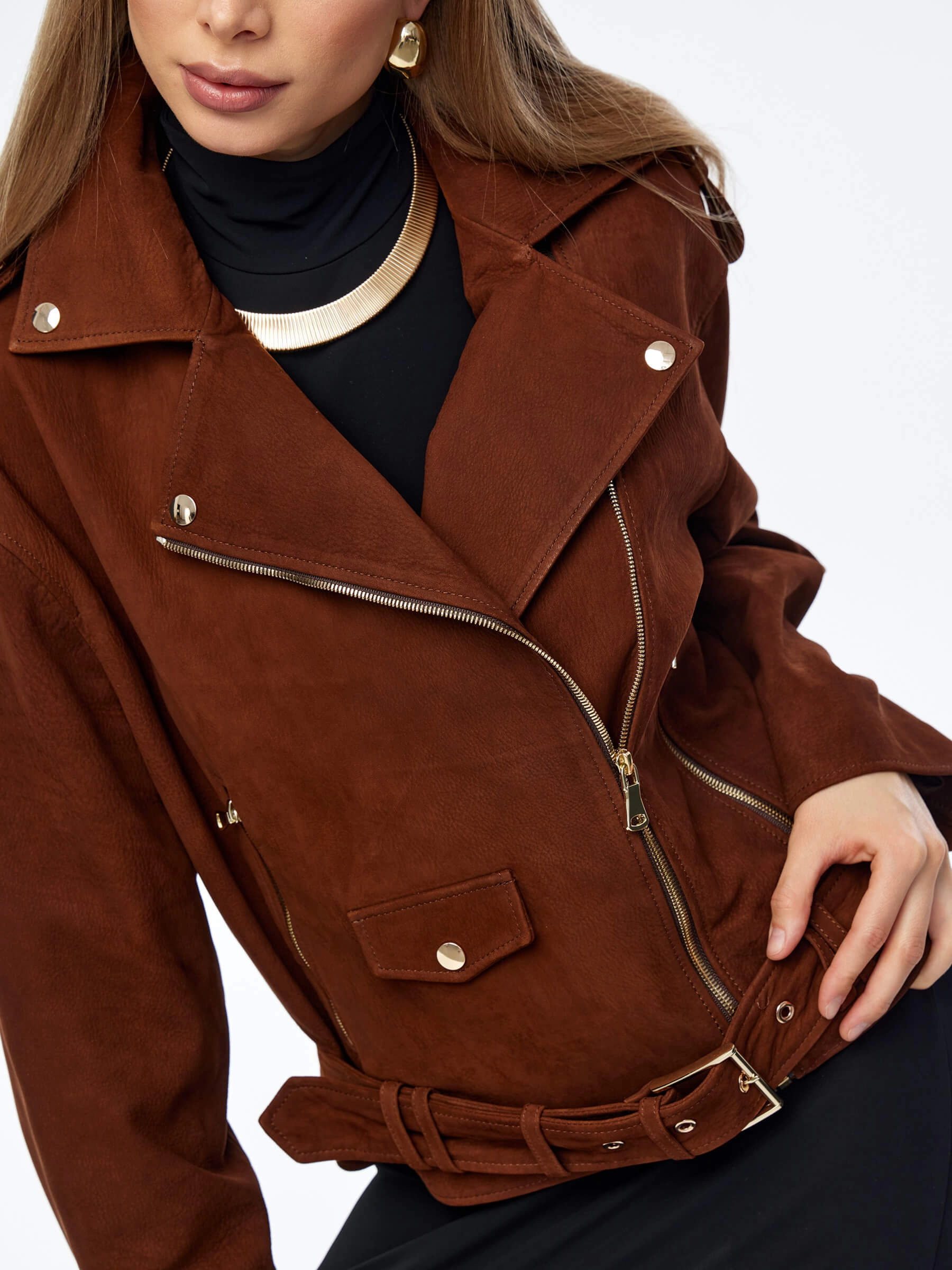 Короткая женская кожаная куртка косуха с поясом премиум класса 3052, виски, размер 46, артикул 23960