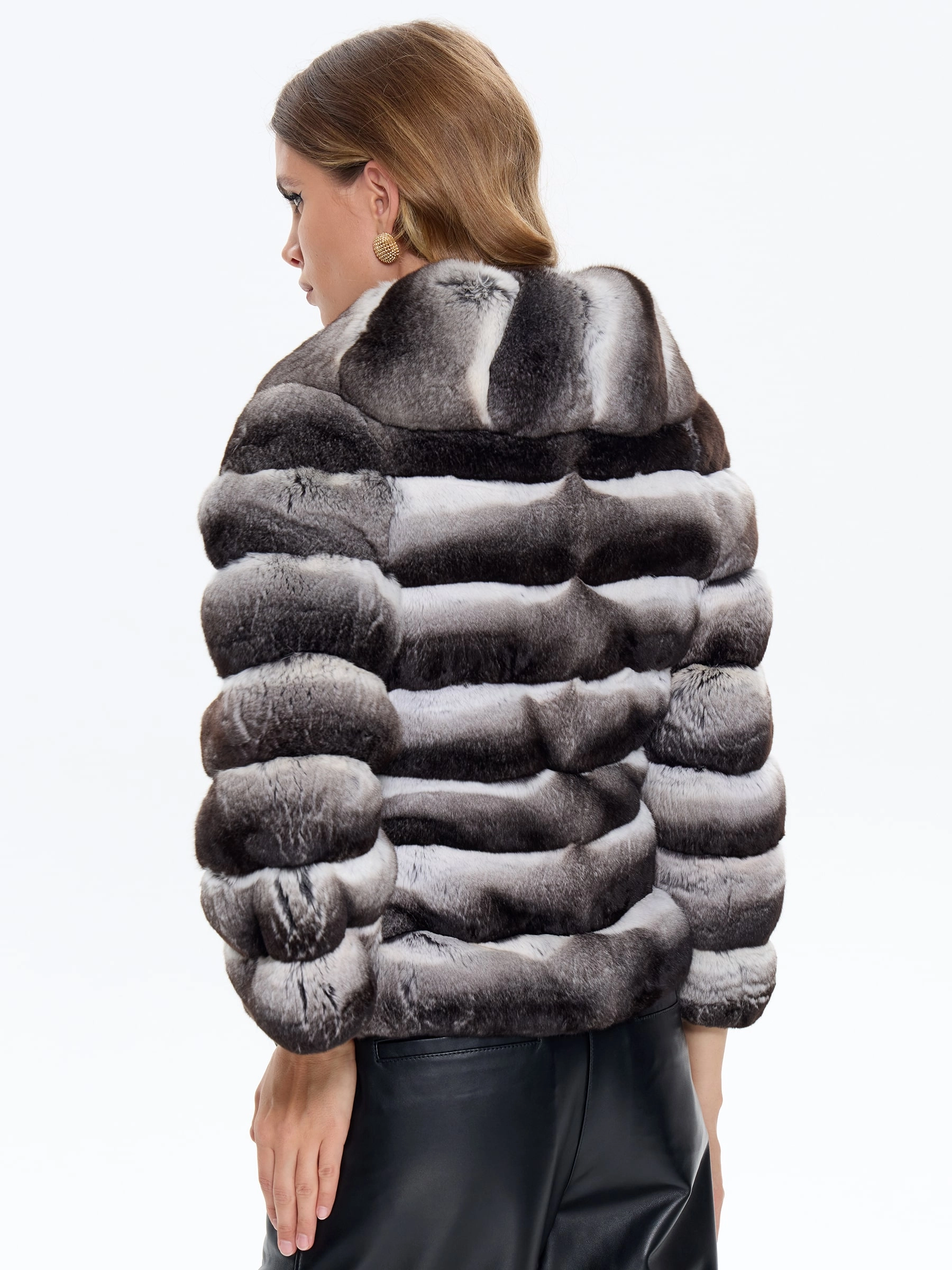 Короткую шубу прямого кроя выполнили из эксклюзивного меха шиншиллы — невесомого, с уникальным серебристо-голубым переливом и облачной мягкостью, где хаотичный рисунок волосков и мерцающий блеск невозможно воспроизвести искусственно. Укороченный крой акцентирует талию и идеально сочетается с юбками и брюками с высокой посадкой, в то время как воротник-шале драпируется элегантными волнами, заменяя аксессуары. Вискозная подкладка, шелковистая на ощупь, защищает деликатный мех от контакта с кожей, а скрытые клипсы обеспечивают фиксацию без видимых элементов, делая эту куртку воплощением эксклюзивности, которая требует уверенности, но вознаграждает владелицу уникальным образом, недоступным в масс-маркете — это инвестиция в статус, а не в практичность.