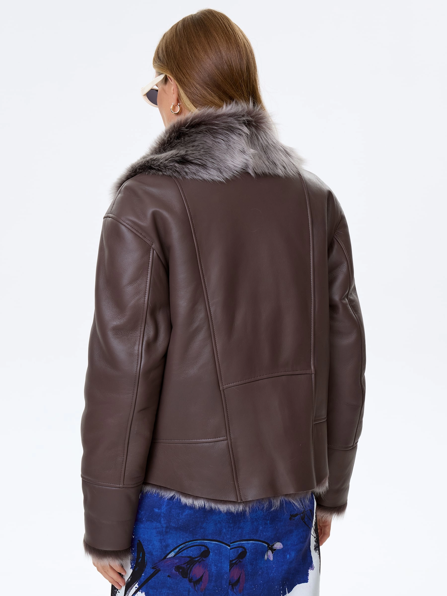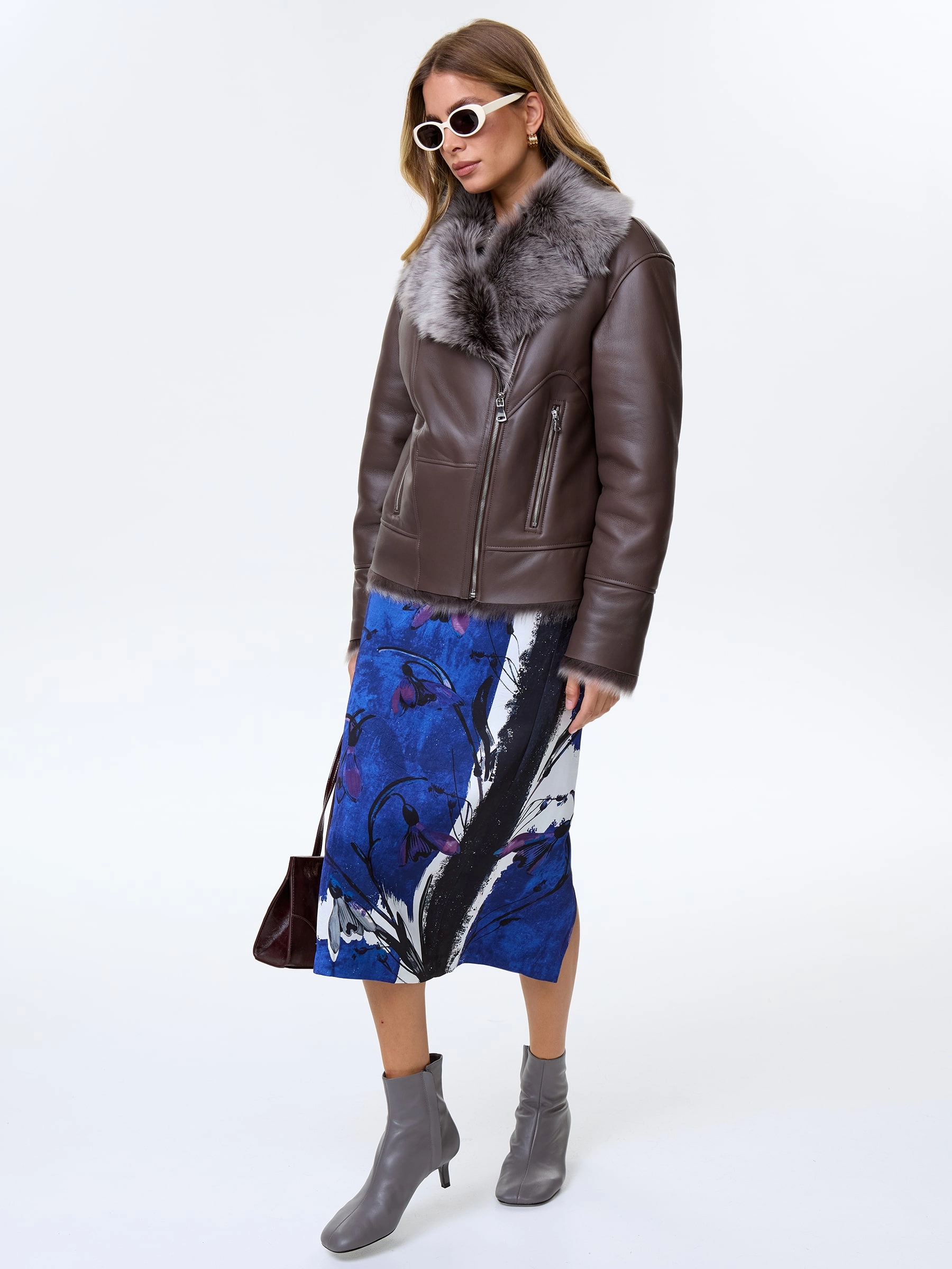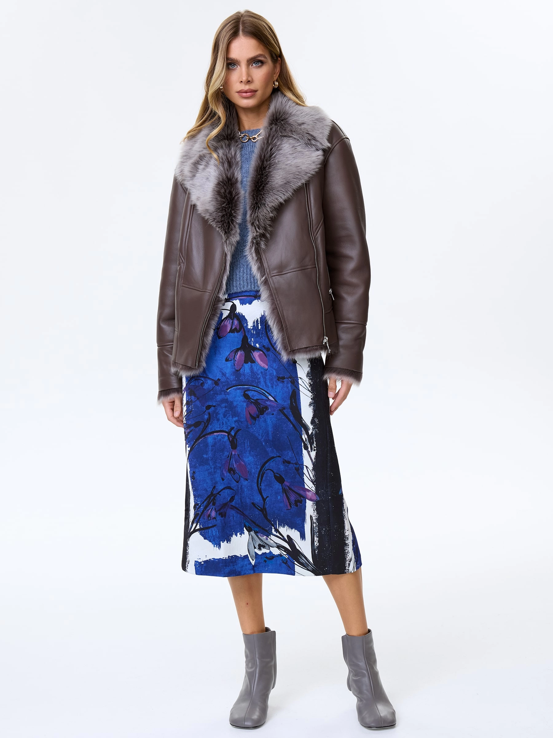 Для пошива короткой куртки-косуха использовали натуральную тосканскую овчину. Полуприлегающий крой, широкие лацканы, боковые карманы как и само изделие застегиваются крупной молнией. Комфортная посадка по фигуре.