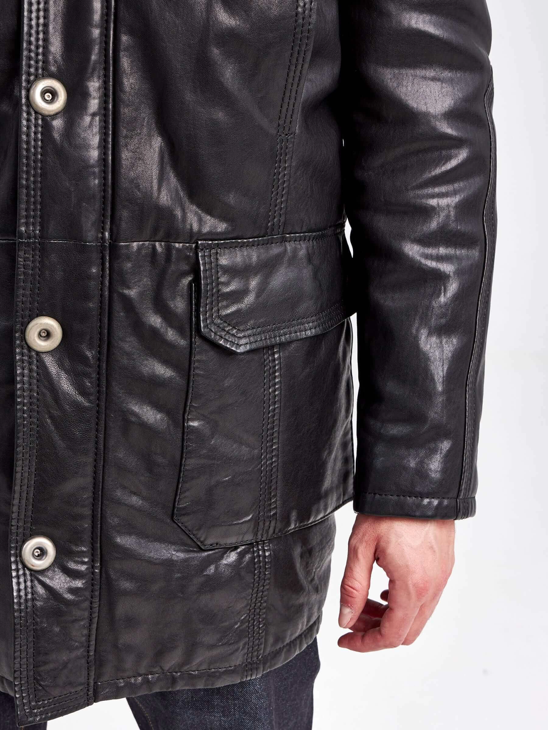 Товар кожаная аляска утепленная мужская 5467, с капюшоном и мехом енота, черная, p. 48, арт. 41000 выполнен из натуральной кожи с застежкой молния. Рассчитан на сезон: зима. Длина изделия 75-90 см, силуэт прямой.