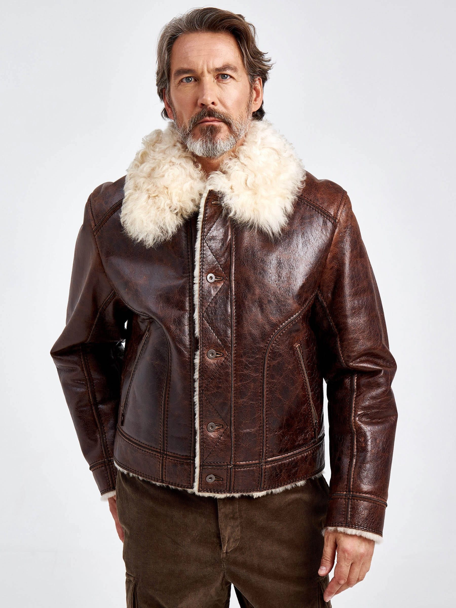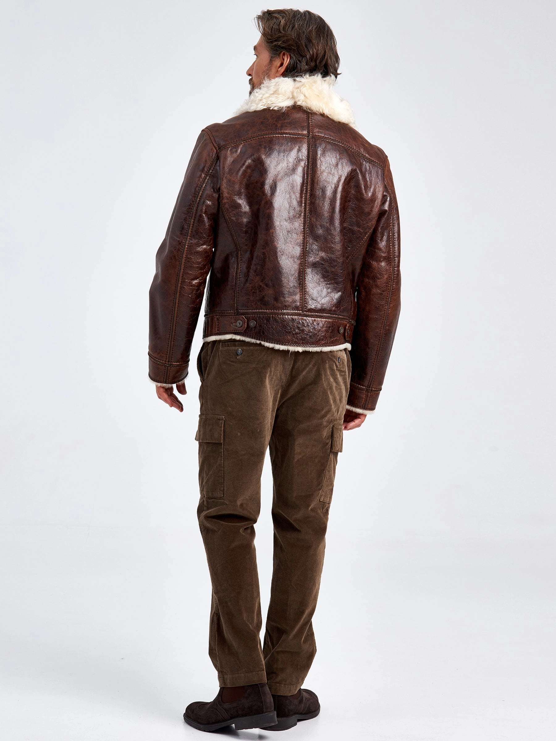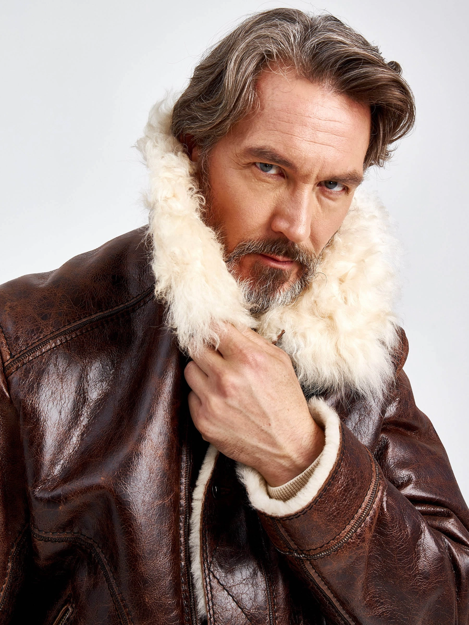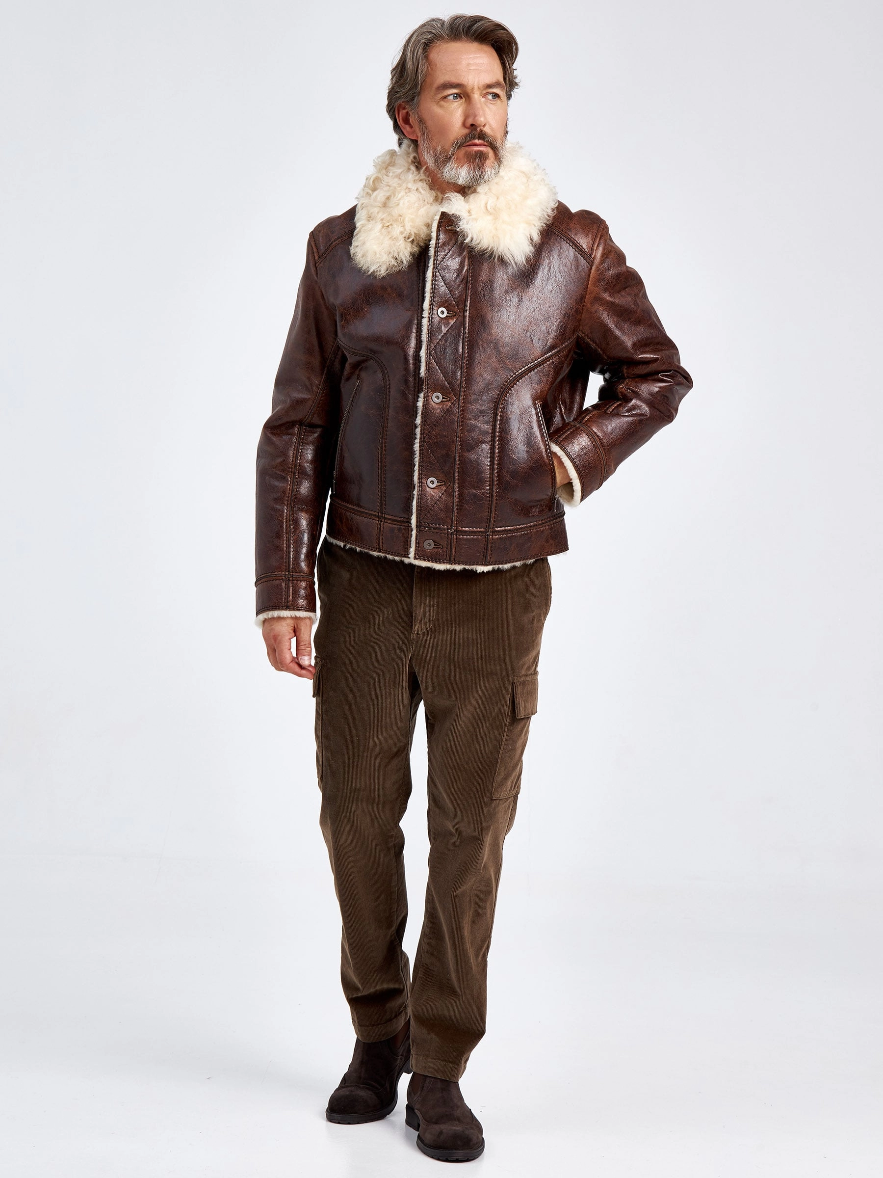 Кожаная дубленка мужская 151, с мехом тиградо, коричневая, размер 52, артикул 70960