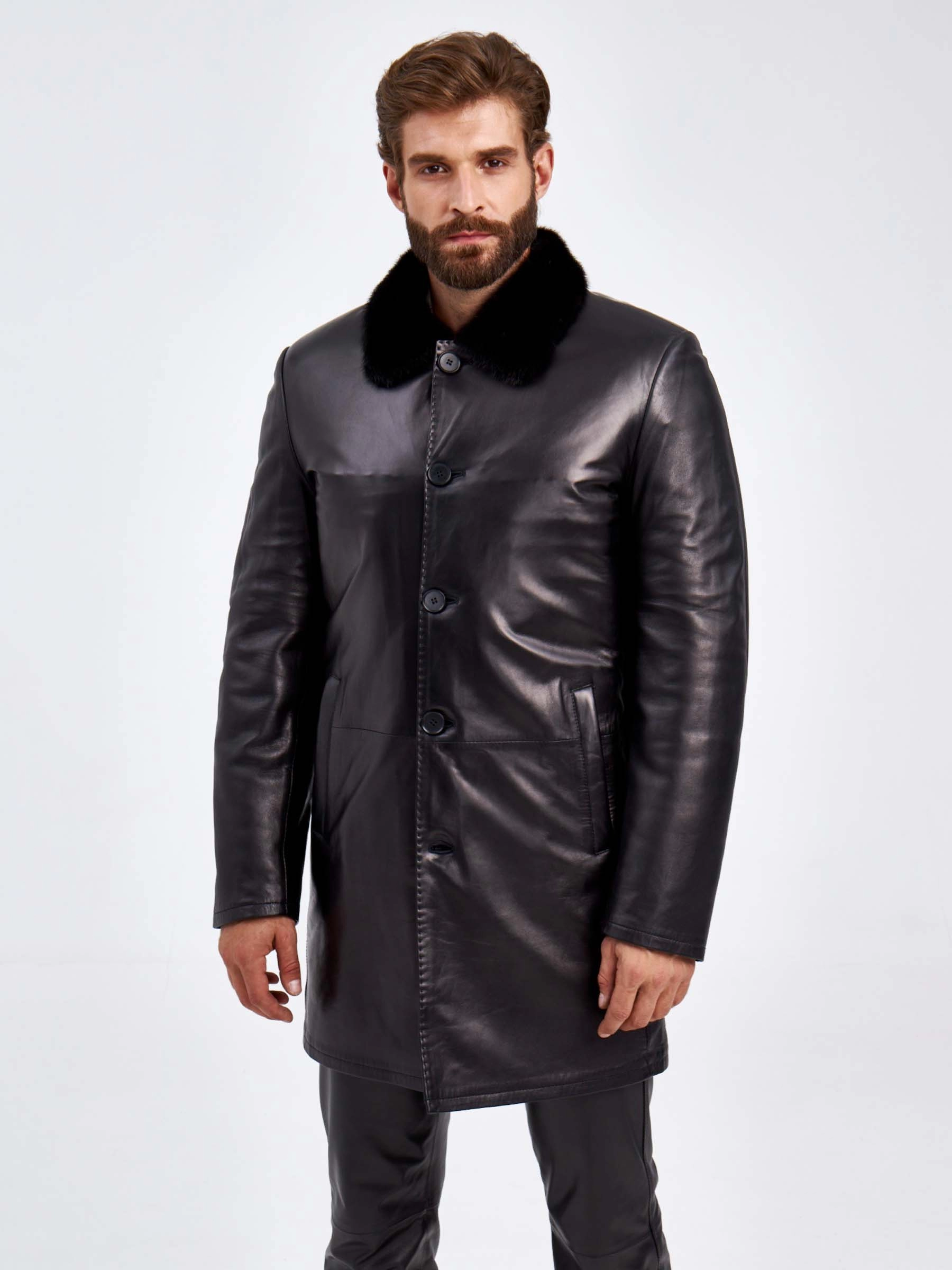 Товар кожаная дубленка с воротником из меха норки для мужчин 5365, черная, размер 46, артикул 70920 выполнен из натуральной кожи с застежкой пуговицы. Рассчитан на сезон: осень-зима. Длина изделия 91 см, силуэт прямой.