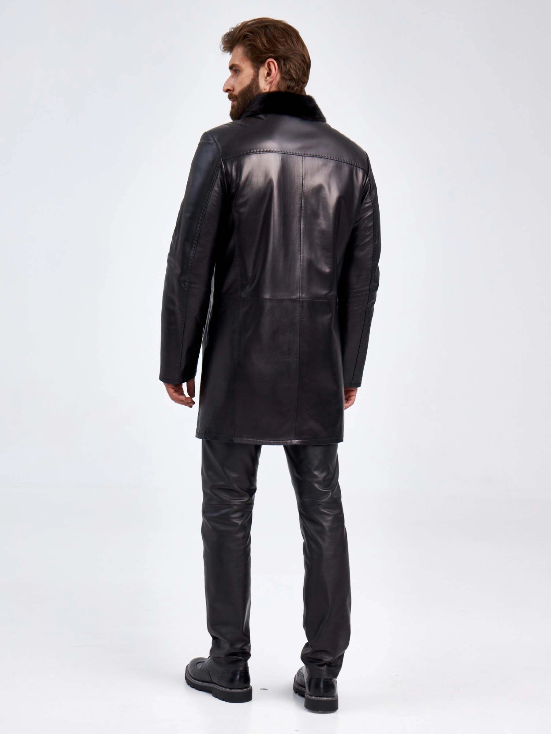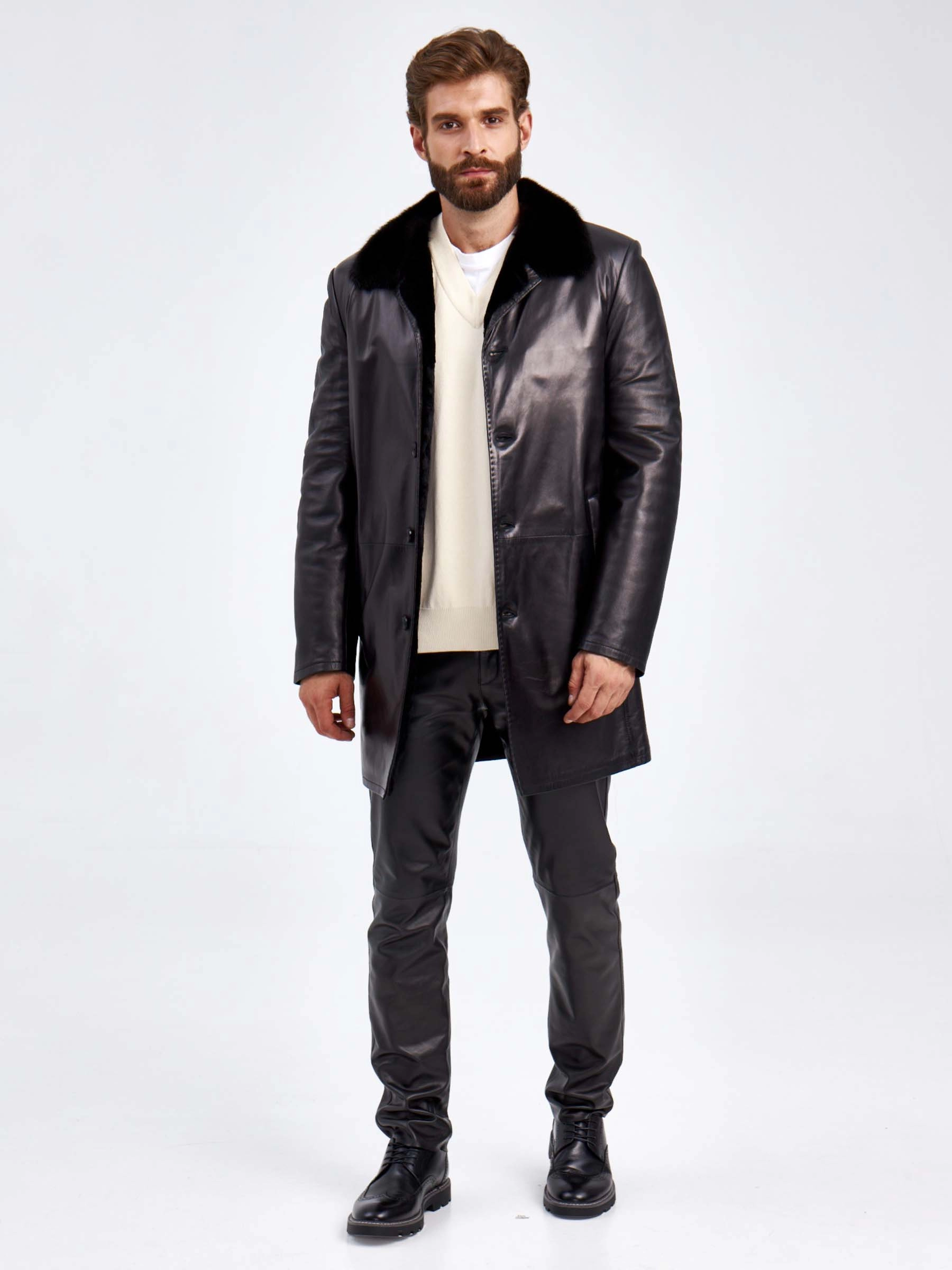 Кожаная дубленка с воротником из меха норки для мужчин 5365, черная, размер 46, артикул 70920