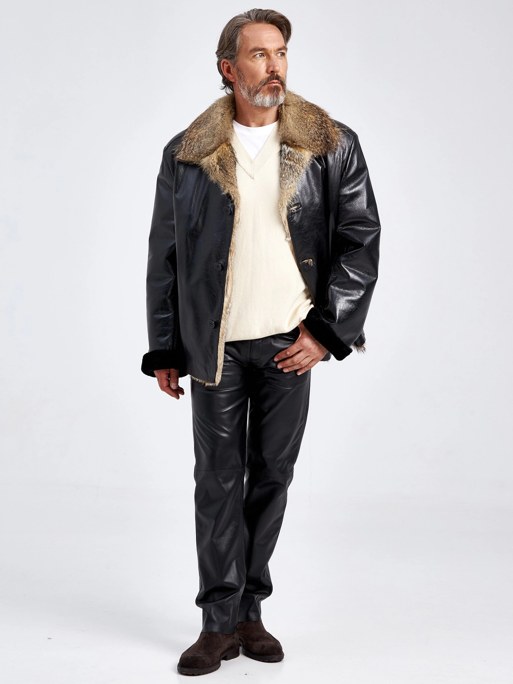 Эту дубленку мастера представили в двухстороннем исполнении. Лицевая сторона –выполнена из плотной, мягкой однотонной кожи, а изнаночная из меха аргентинской лисицы. Модель прямого кроя с отложным воротником и двумя боковыми карманами, идеально впишется в любой зимний гардероб.