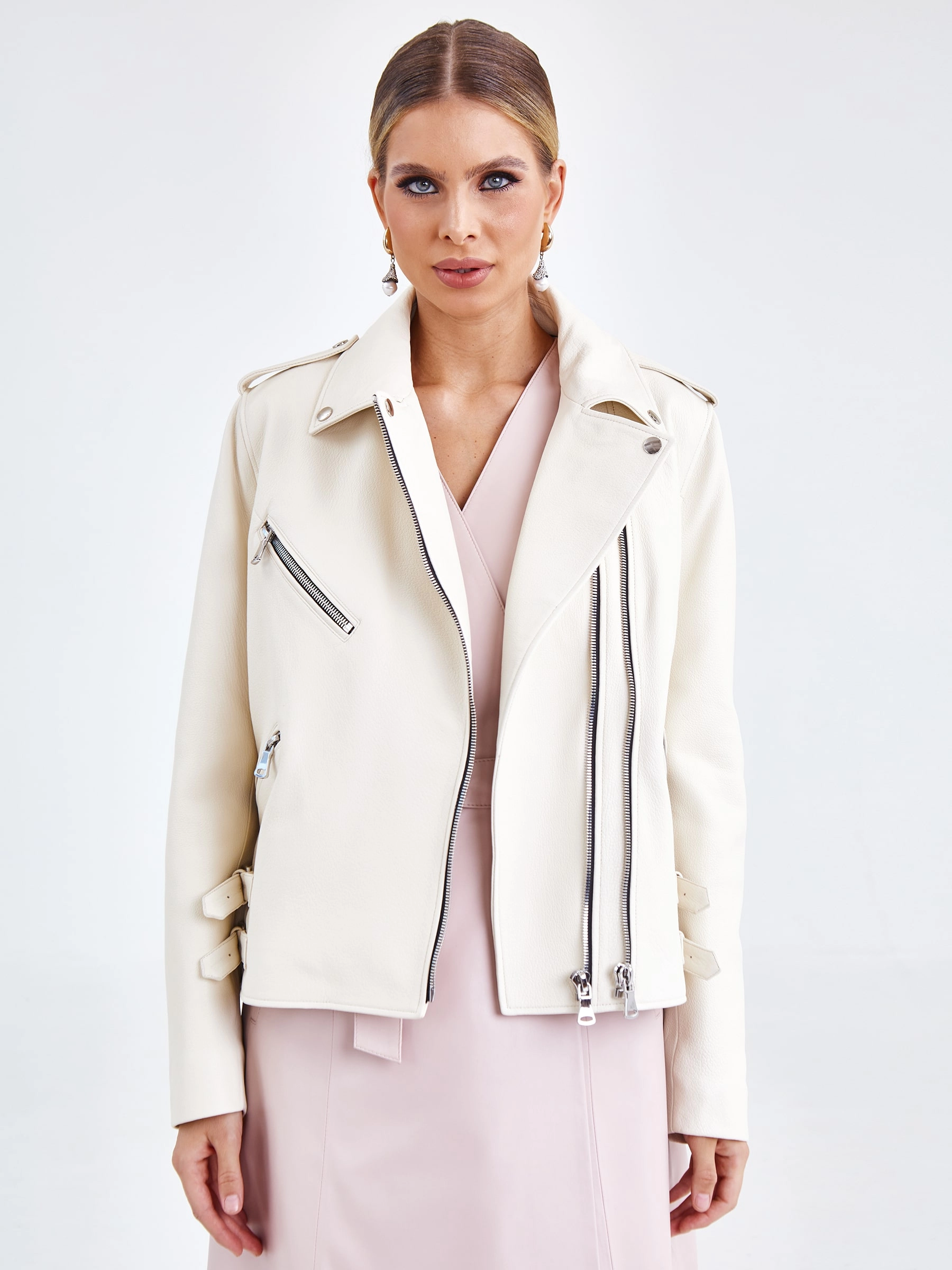 Товар кожаная женская куртка косуха премиум класса 3036, белая, размер 48, артикул 23171 выполнен из натуральной кожи с застежкой молния. Рассчитан на сезон: весна-лето. Длина изделия 65 см, силуэт свободный.