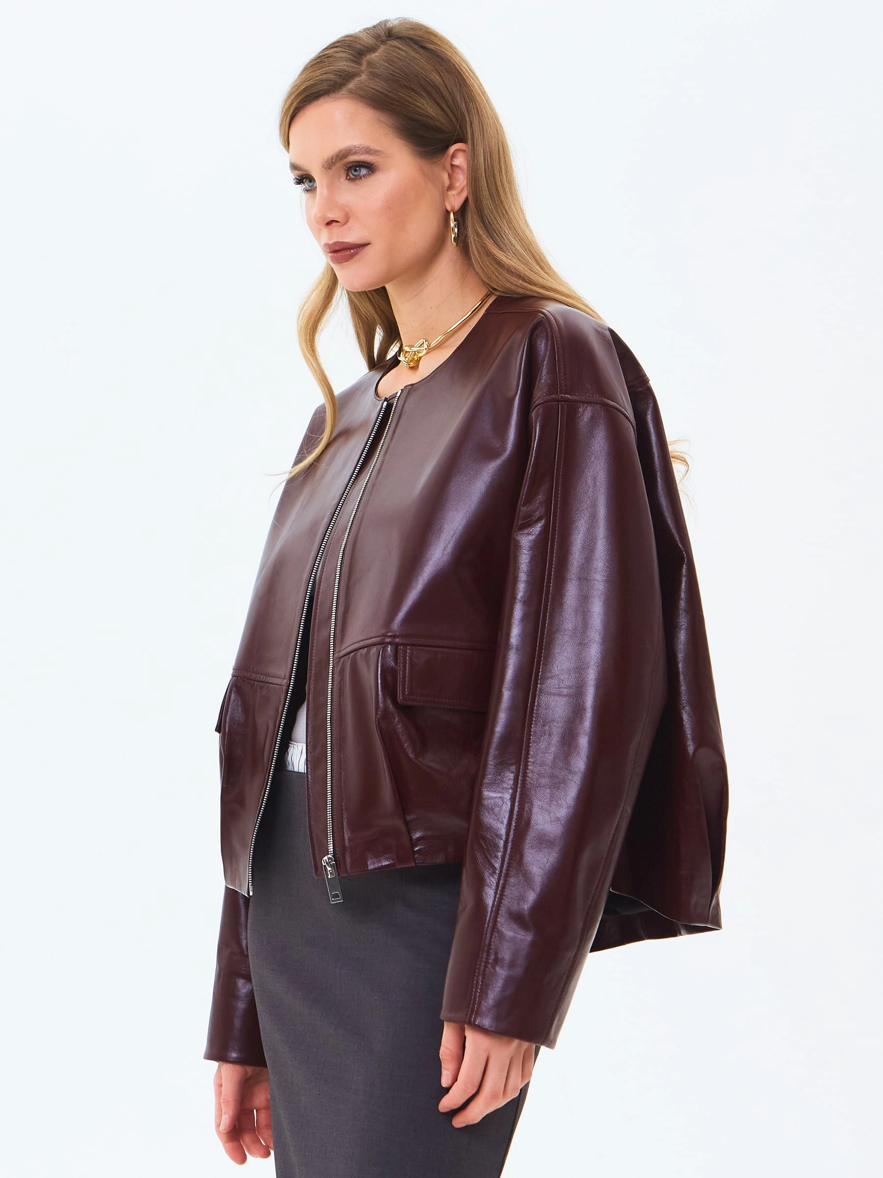 Короткую куртку бомбер с круглым воротом выполнили из тонкой гладкой кожи премиум класс. Модель свободного кроя и двумя накладными карманами с клапанами застегивается молнией.
