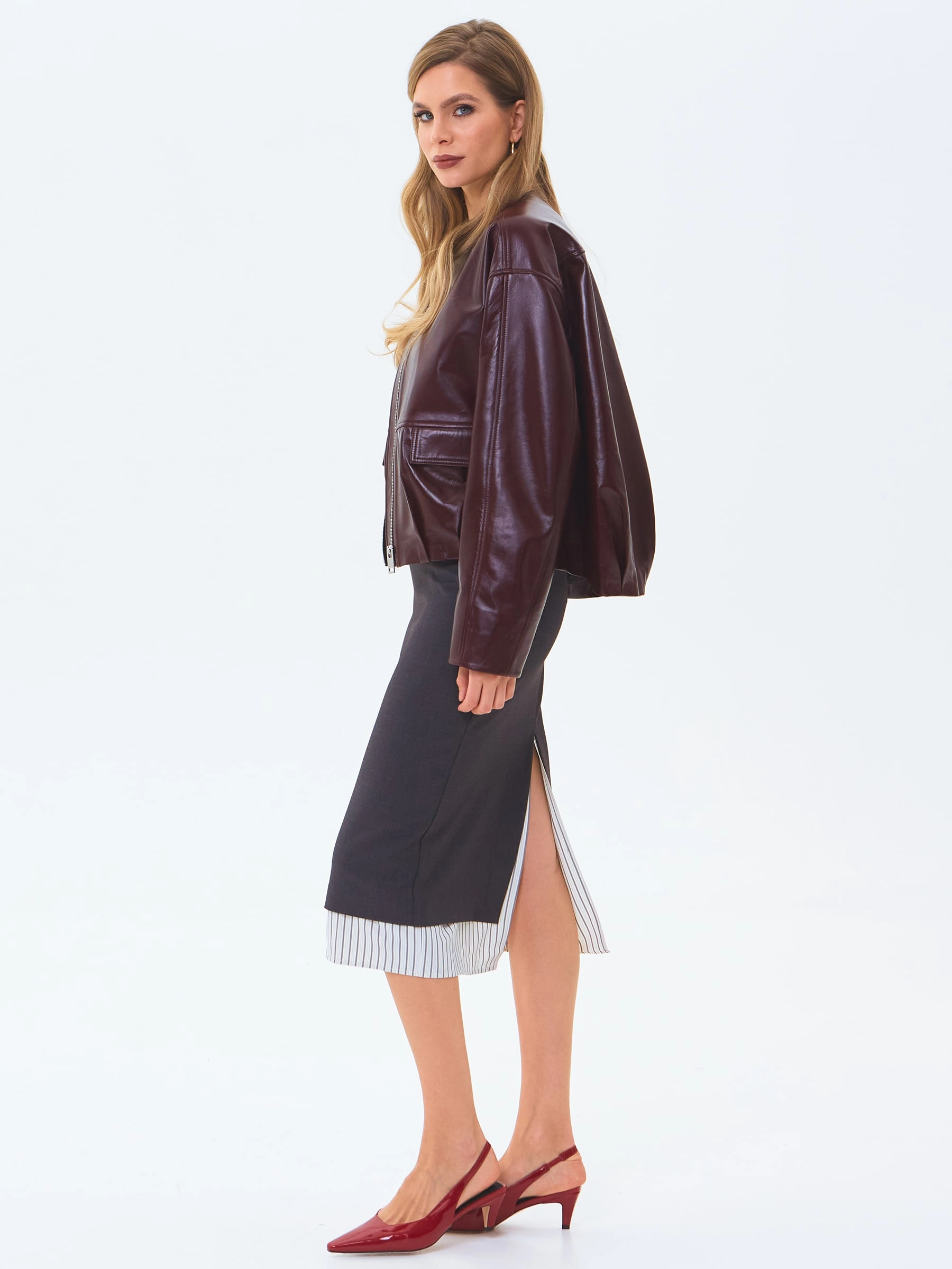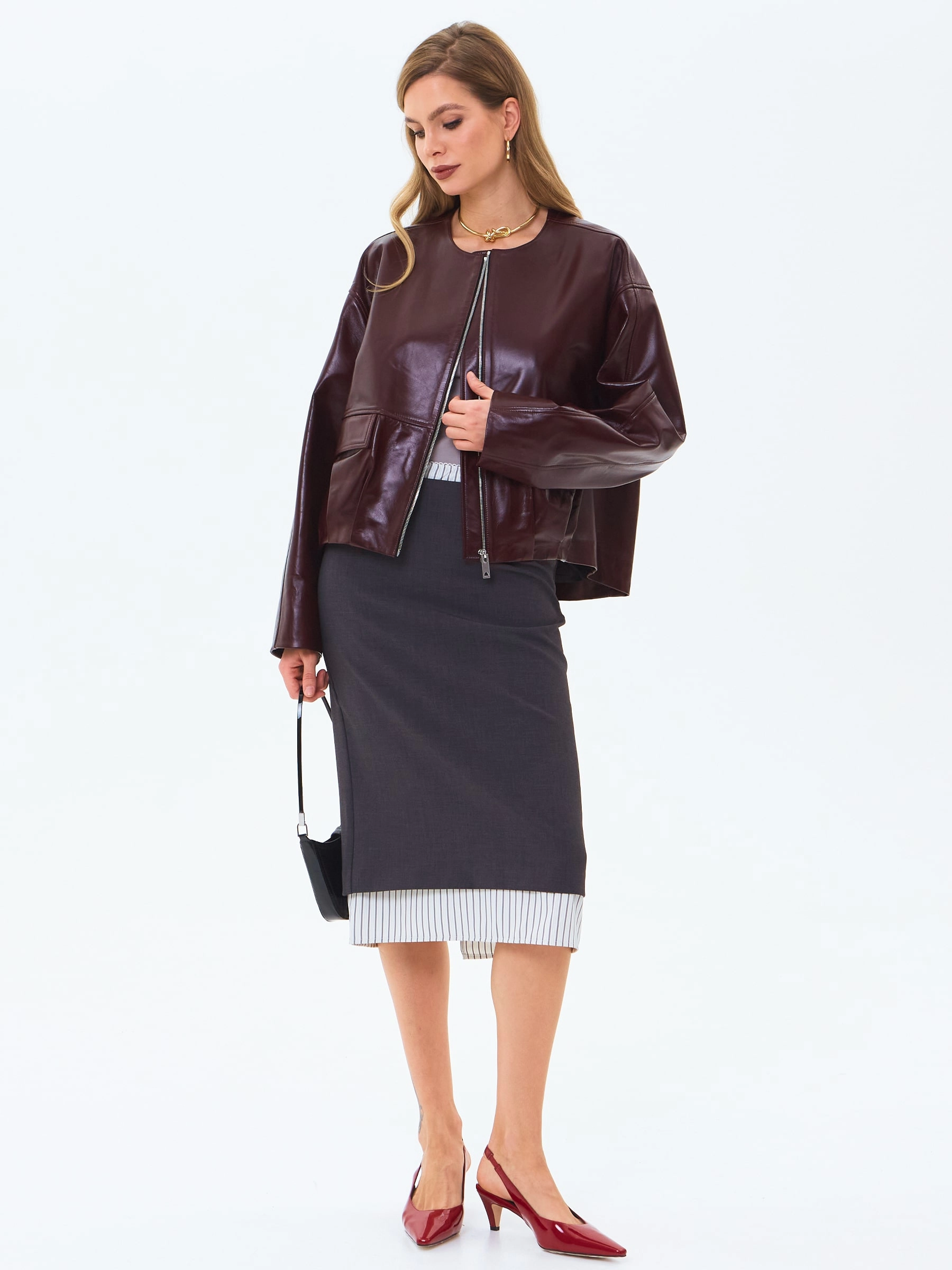 Товар кожаная куртка бомбер премиум класса для женщин 3094, бордовая, размер 50, артикул 24350 выполнен из натуральной кожи с застежкой молния. Рассчитан на сезон: весна-лето. Длина изделия 63 см, силуэт свободный.
