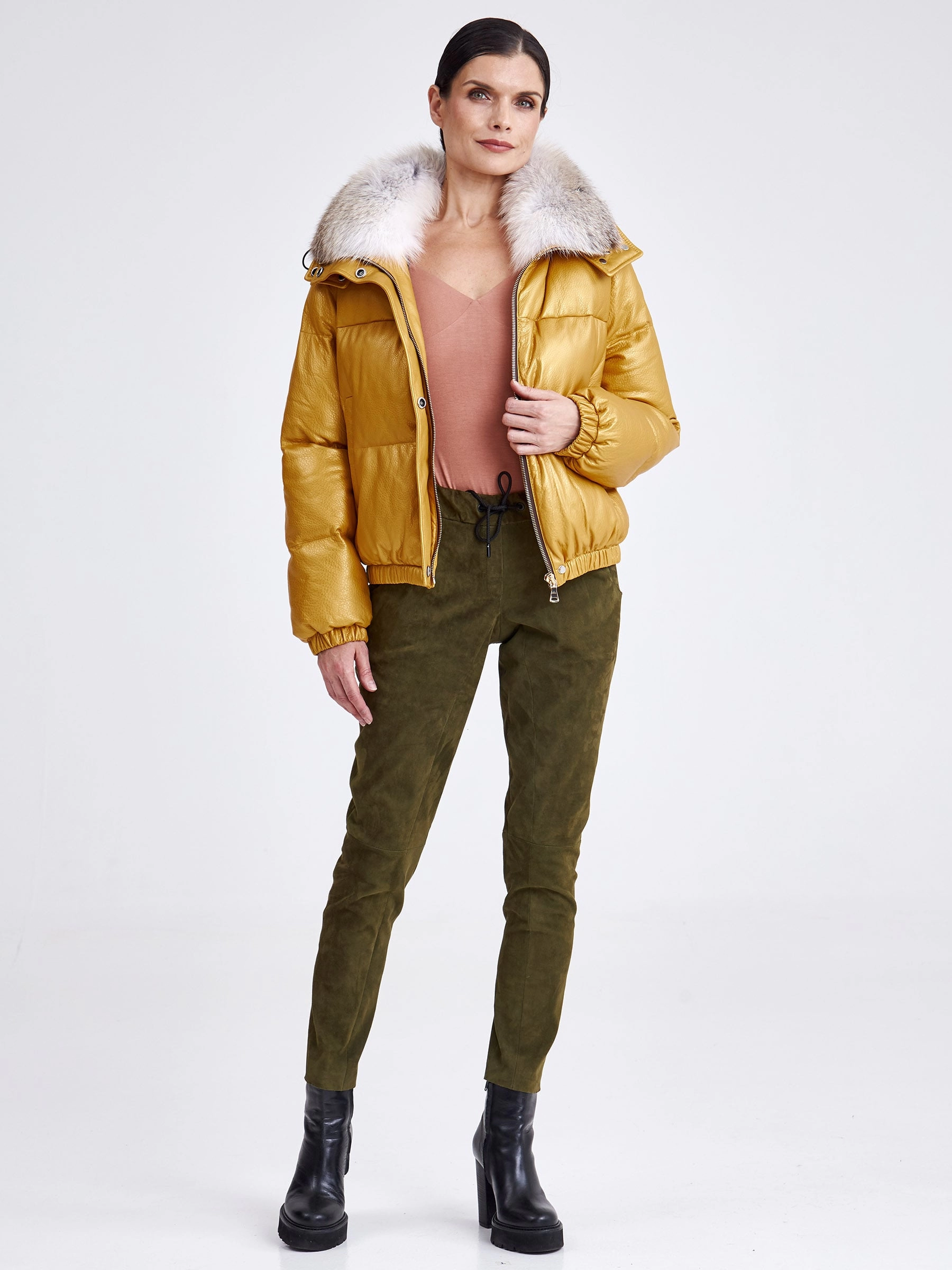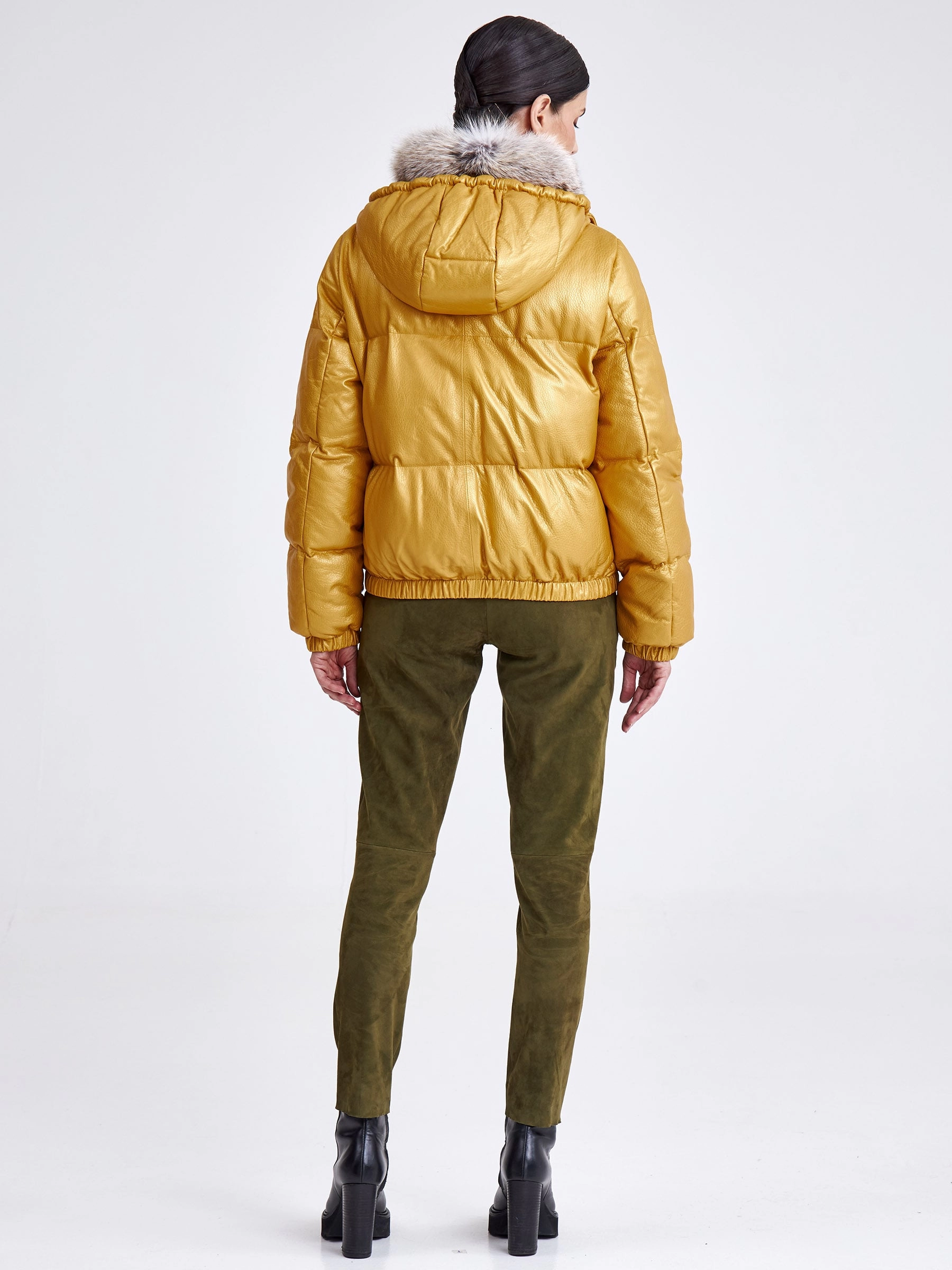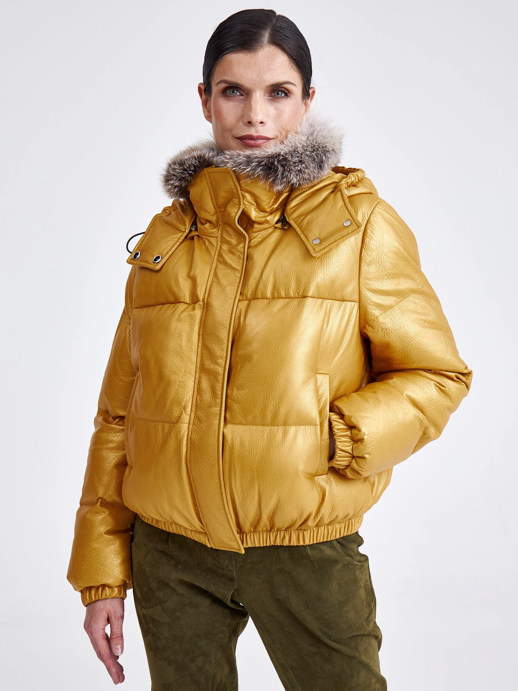 Товар женская кожаная куртка бомбер с меховым капюшоном премиум класса 3027, желтая, размер 44, артикул 25440 выполнен из натуральной кожи с застежкой молния. Рассчитан на сезон: осень-зима. Длина изделия 51-74 см, силуэт свободный.