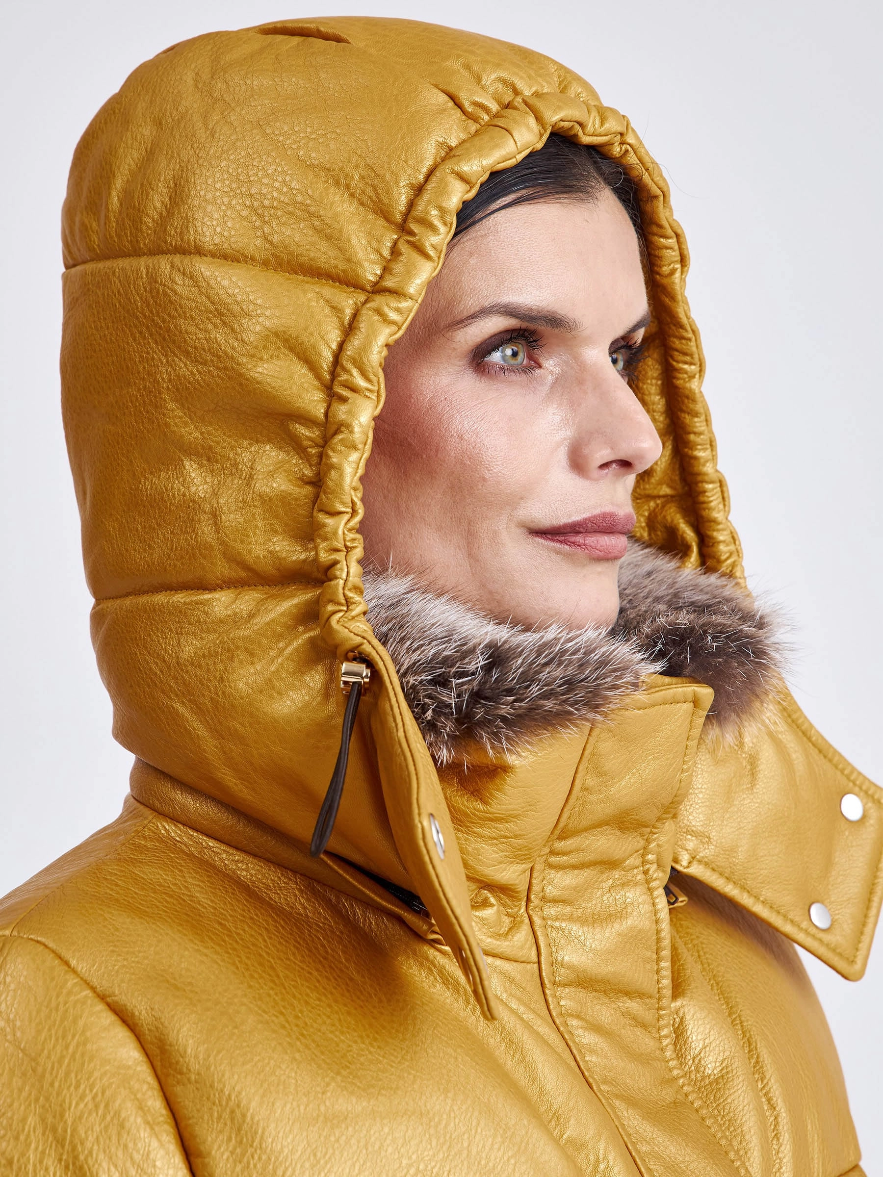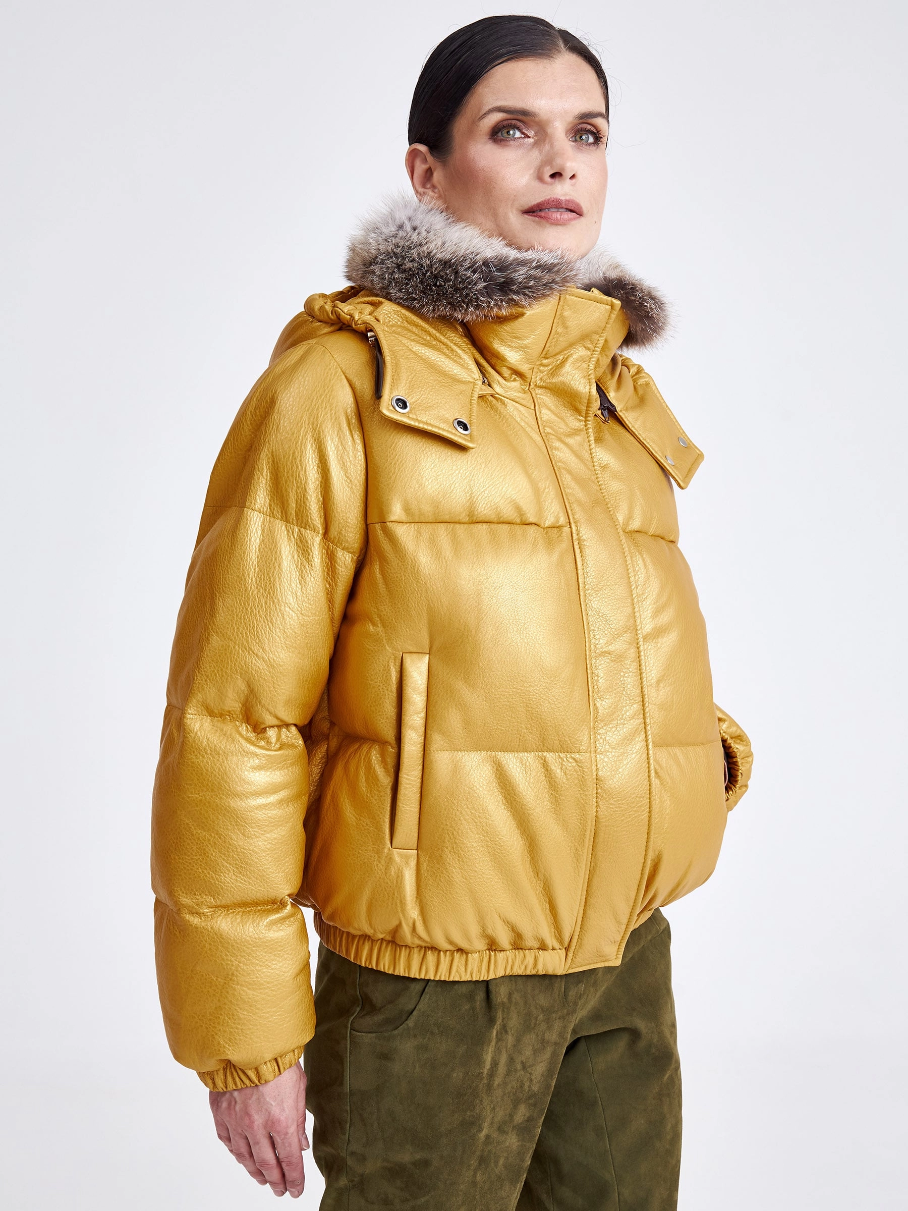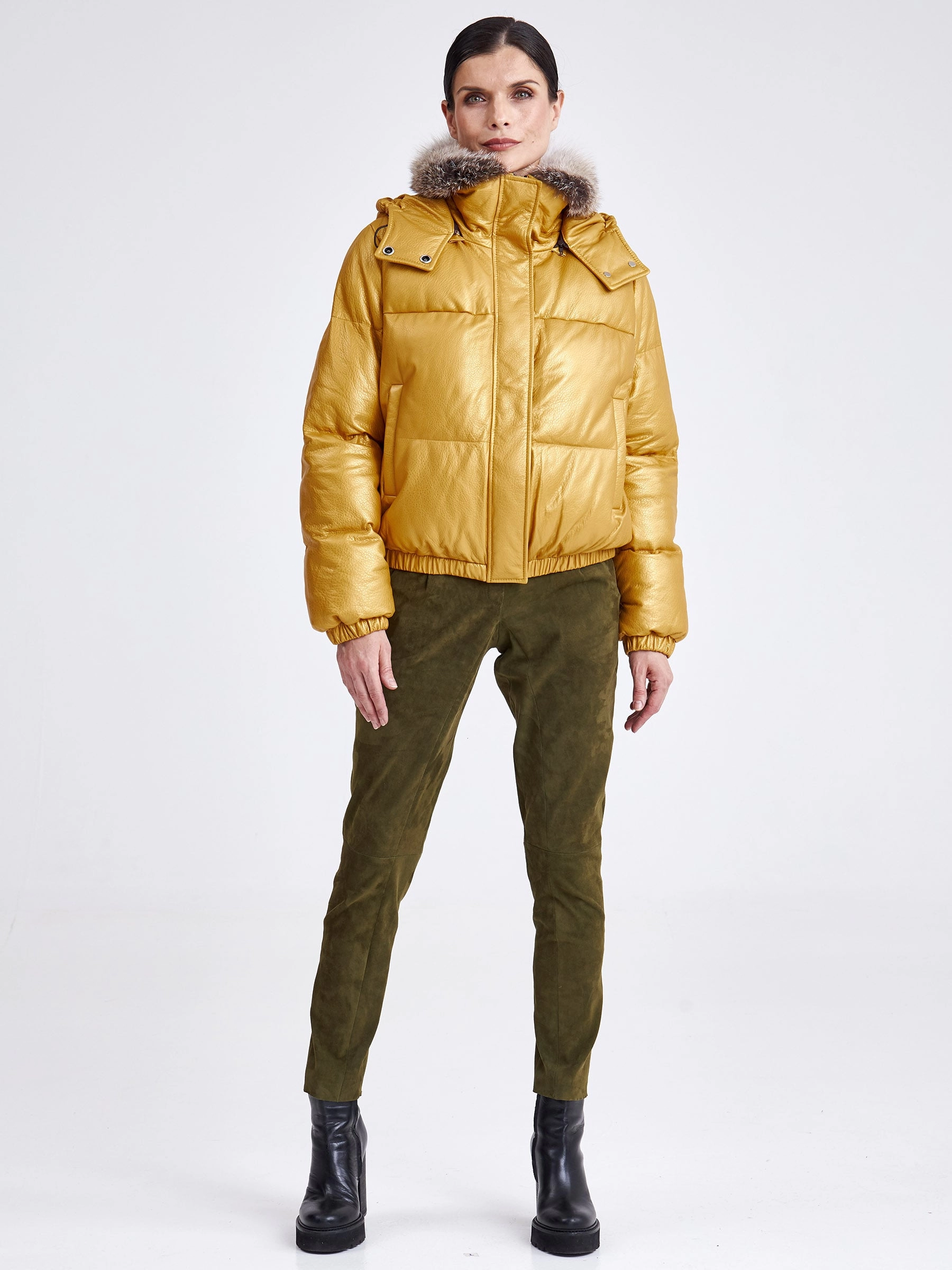 Товар женская кожаная куртка бомбер с меховым капюшоном премиум класса 3027, желтая, размер 44, артикул 25440 выполнен из натуральной кожи с застежкой молния. Рассчитан на сезон: осень-зима. Длина изделия 51-74 см, силуэт свободный.