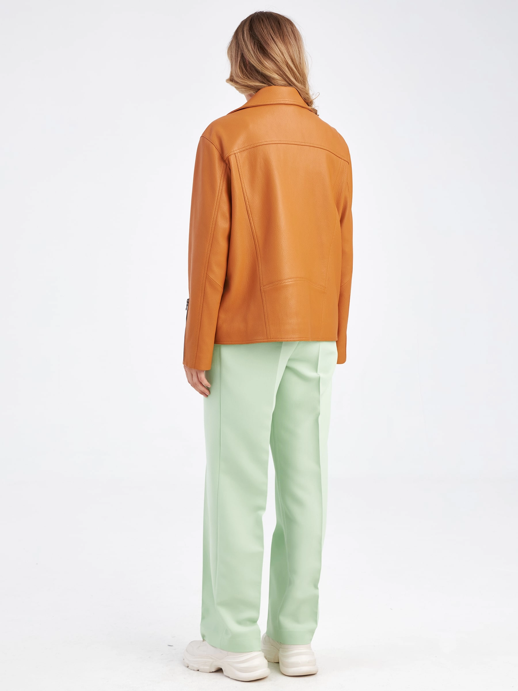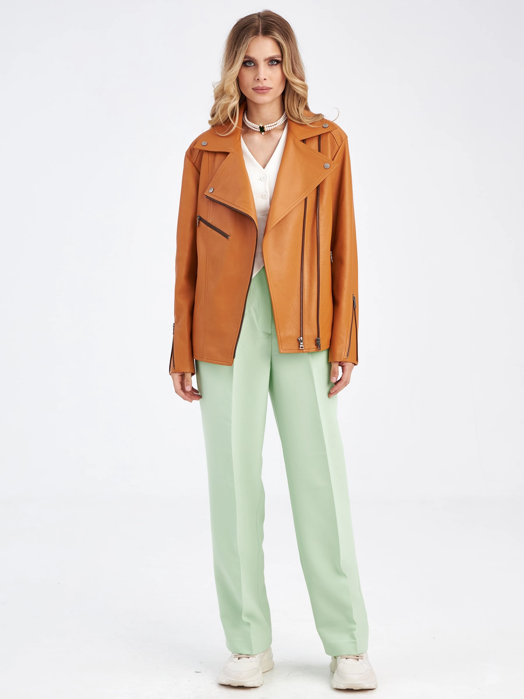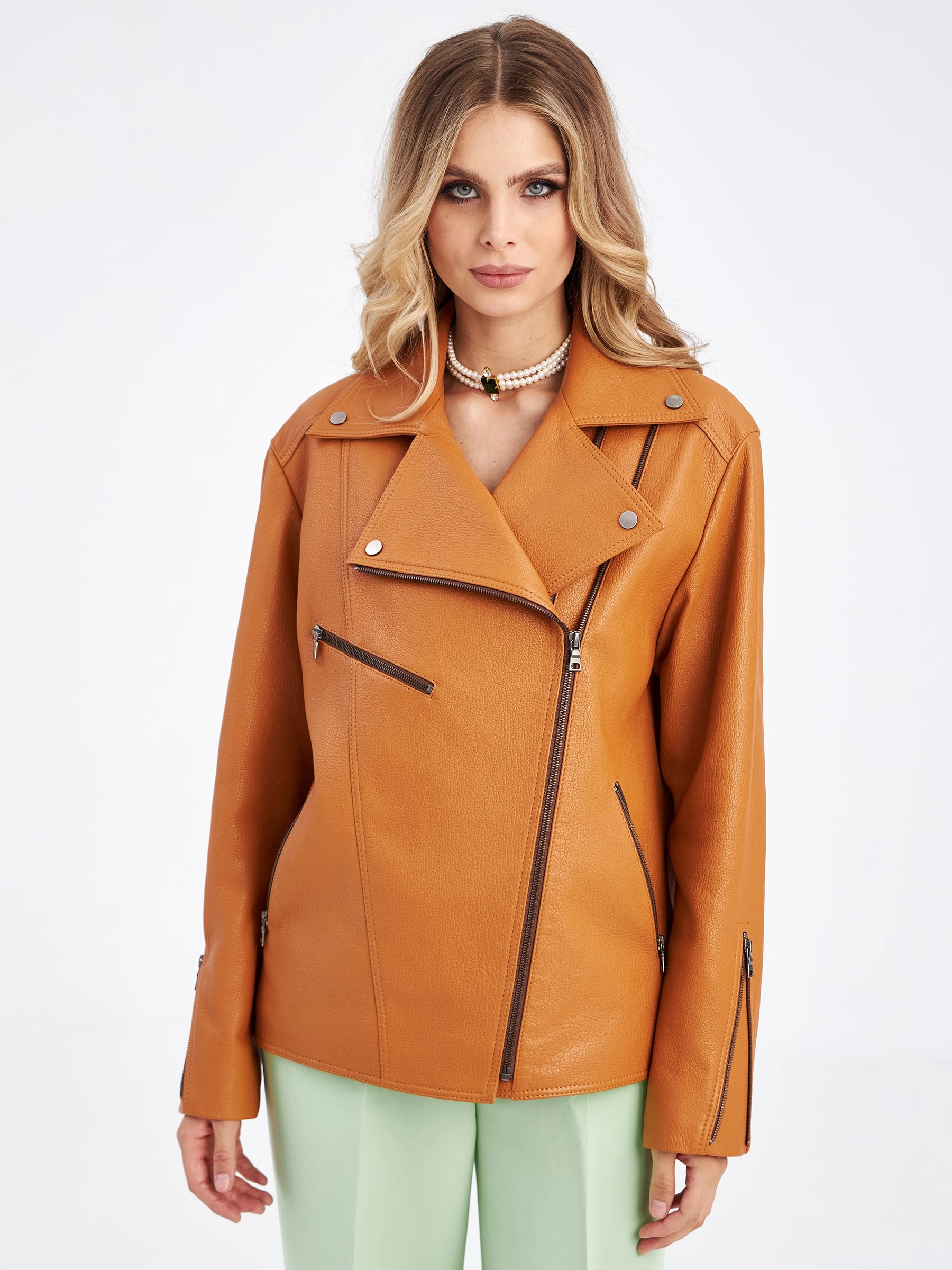 Товар женская кожаная куртка косуха премиум класса 3047, табачная, размер 48, артикул 23310 выполнен из натуральной кожи с застежкой молния. Рассчитан на сезон: весна-осень. Длина изделия 65 см, силуэт свободный.