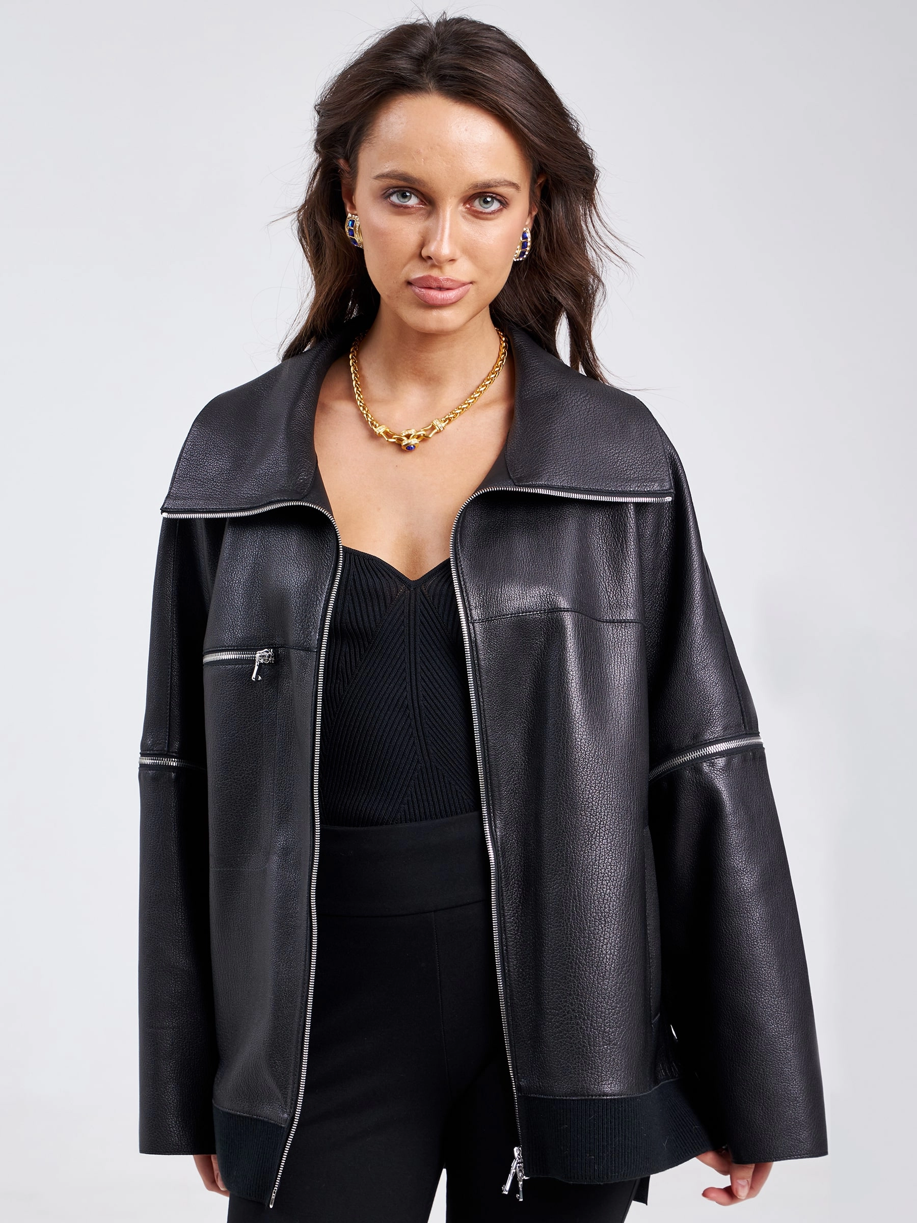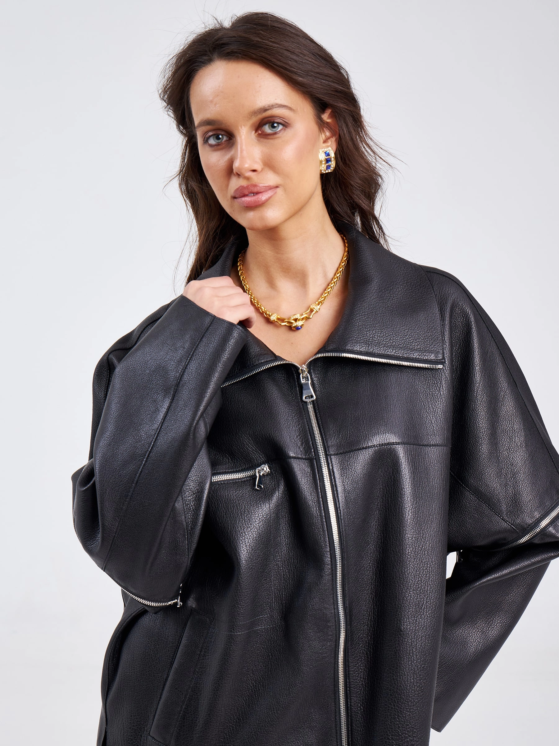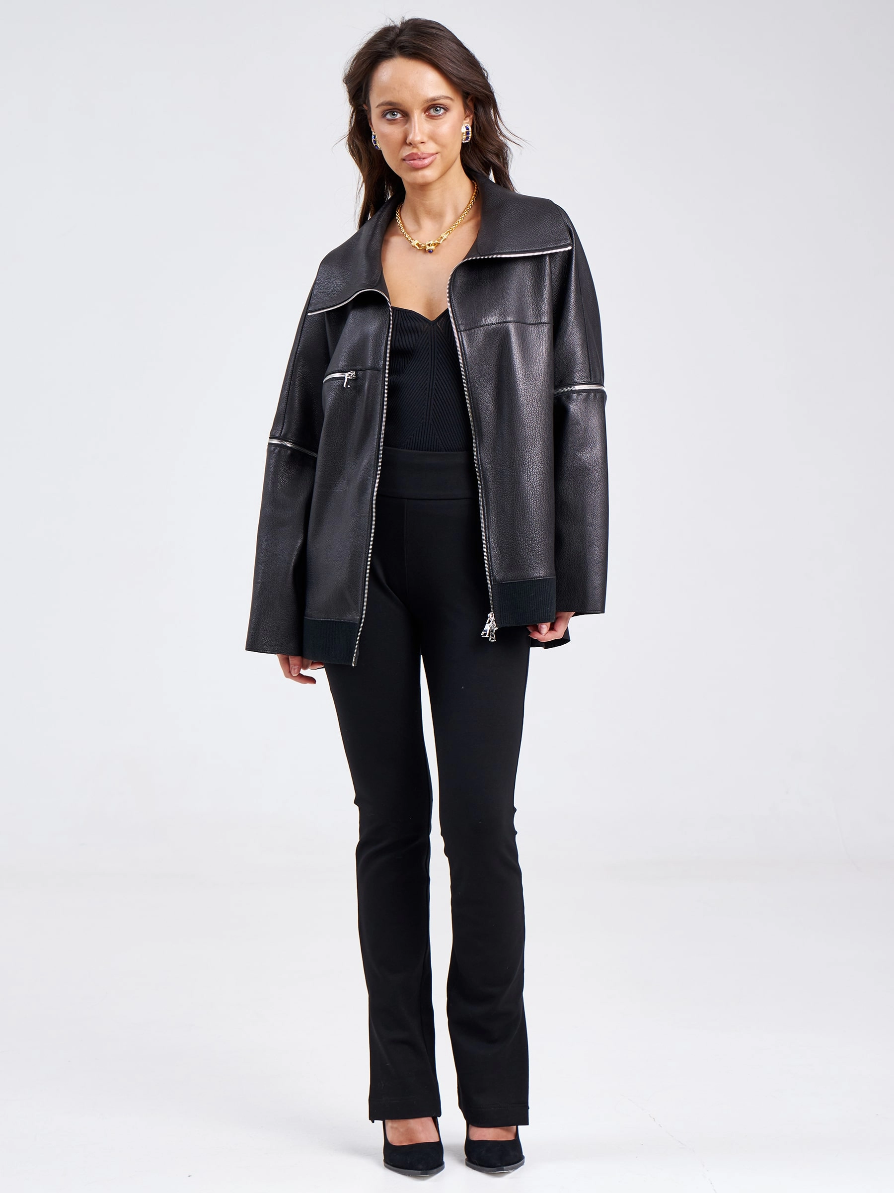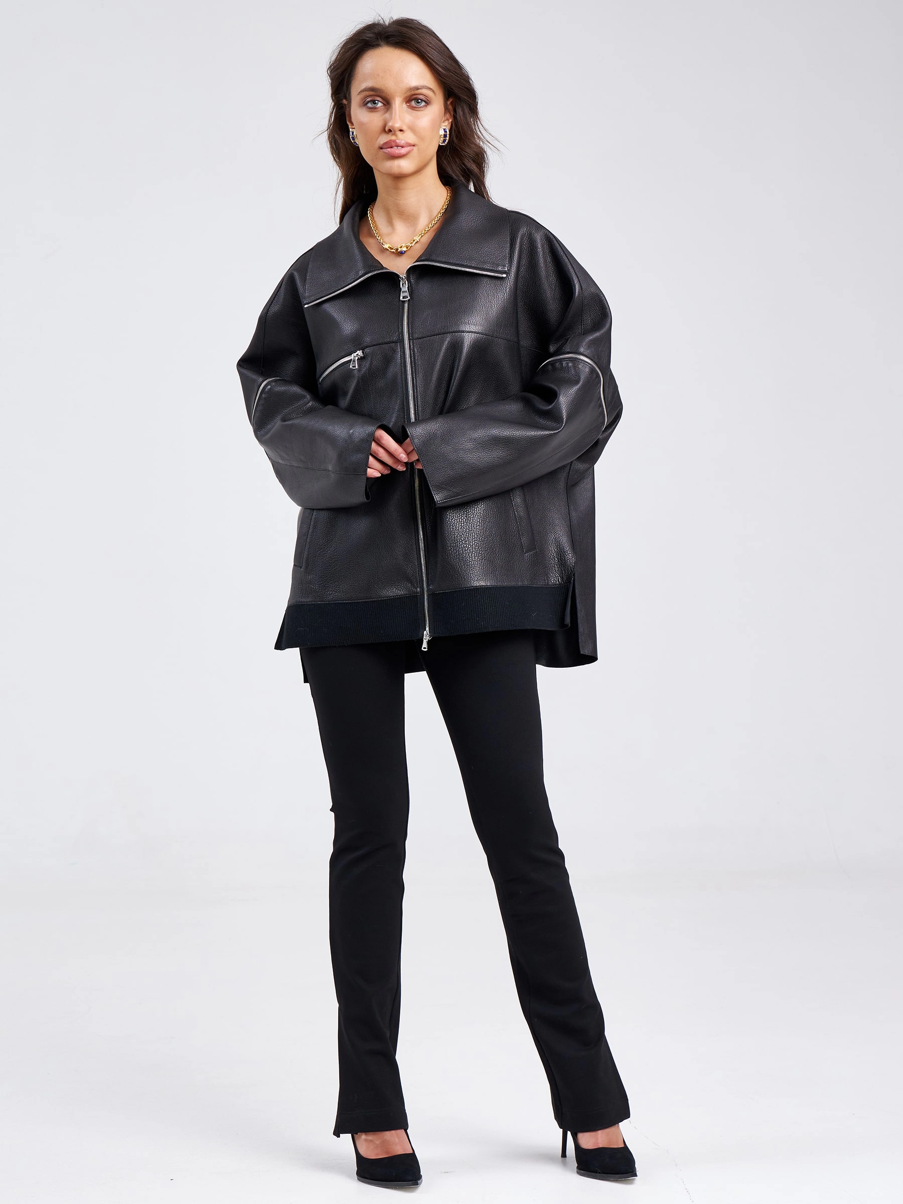 Товар кожаная женская куртка оверсайз на резинке премиум класса 3031, черная, размер 50, артикул 23210 выполнен из натуральной кожи с застежкой молния. Рассчитан на сезон: весна-лето. Длина изделия 76 см, силуэт свободный.