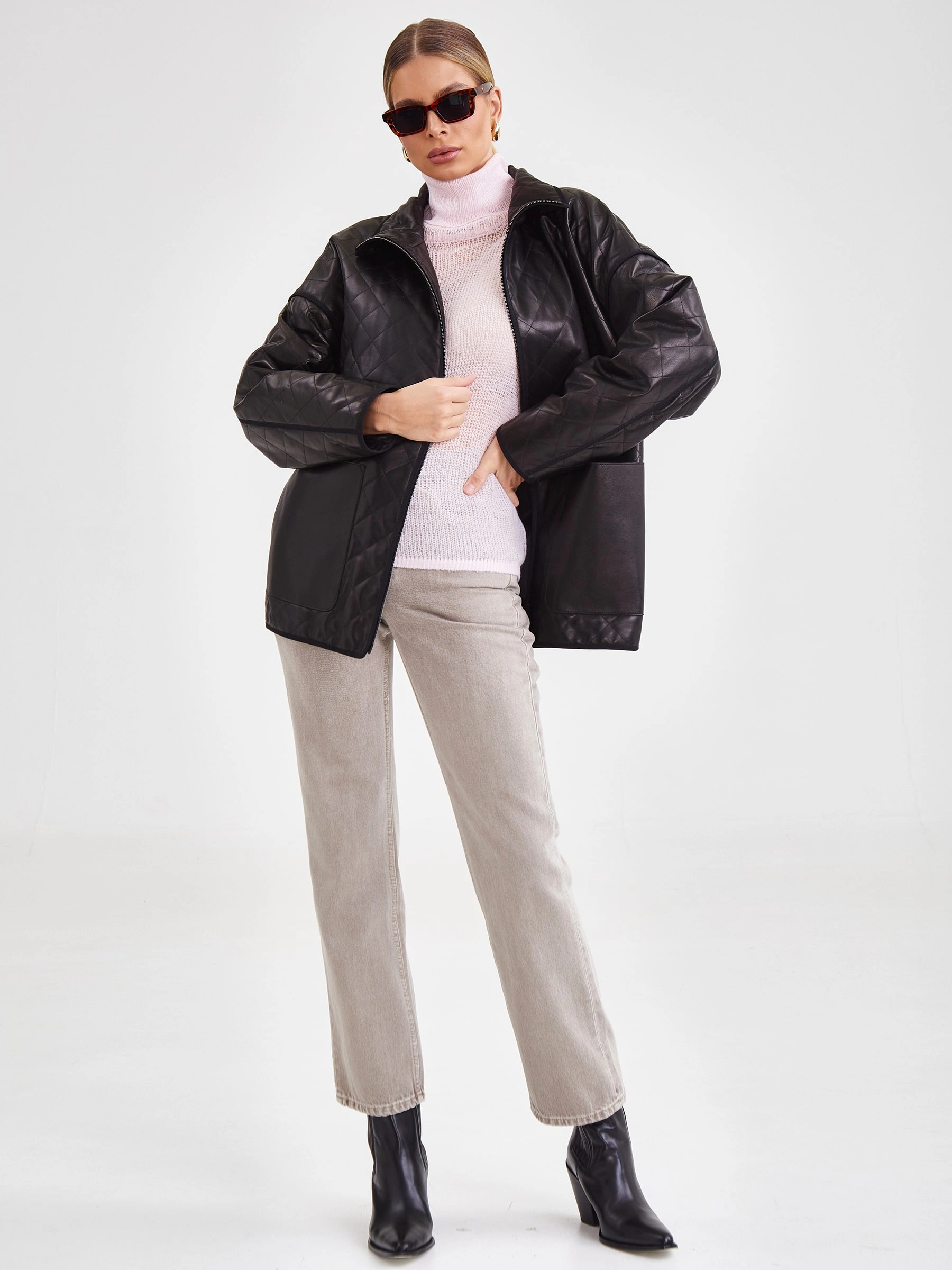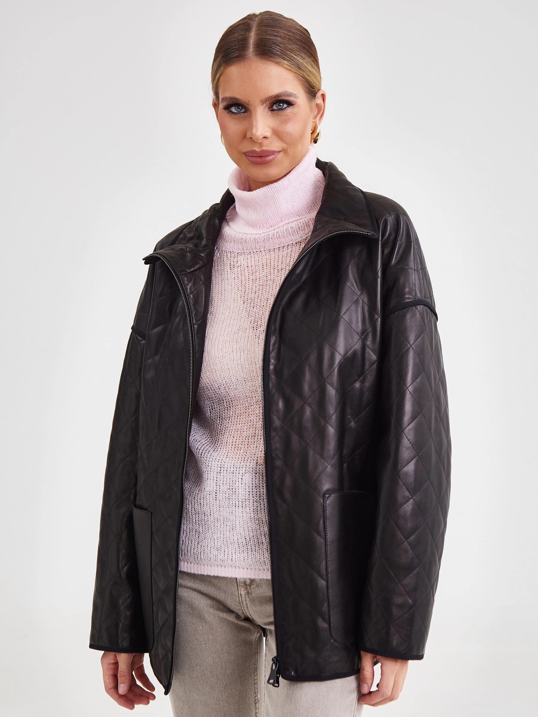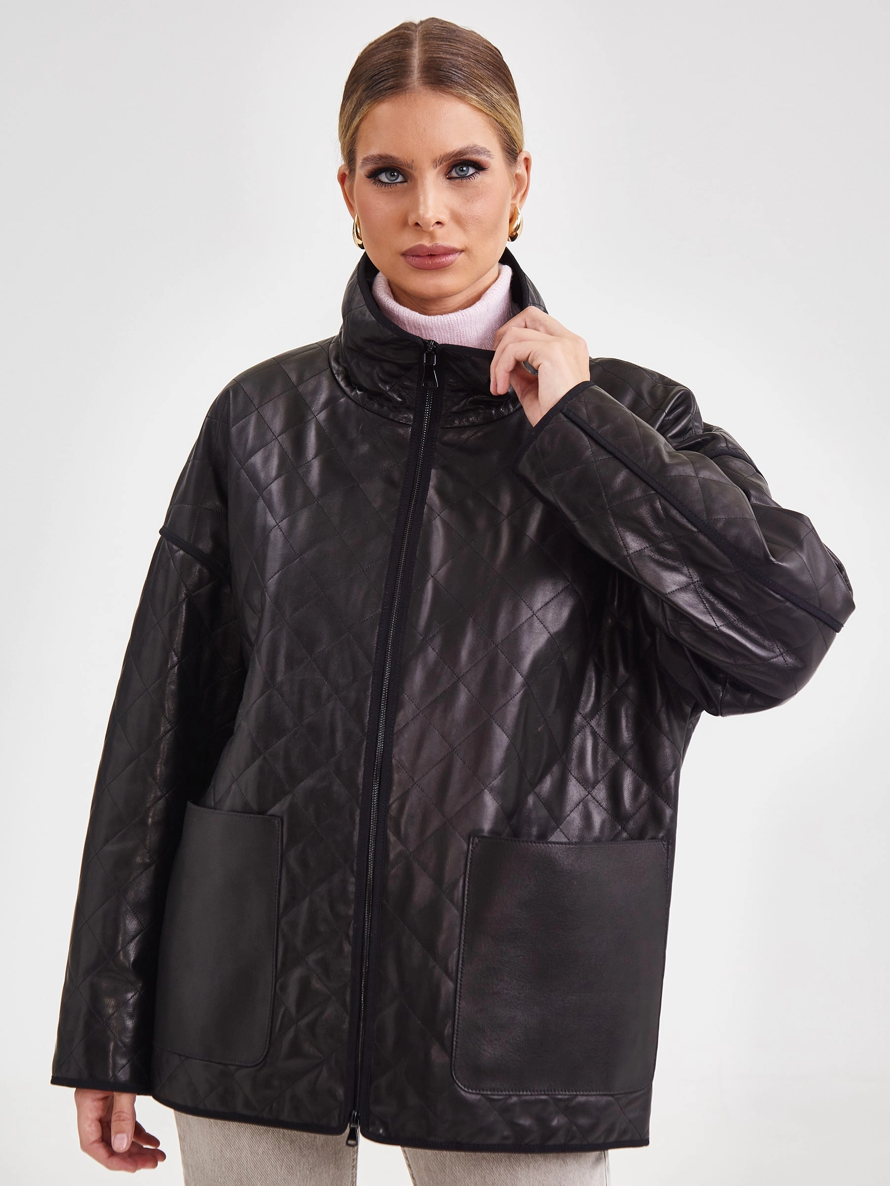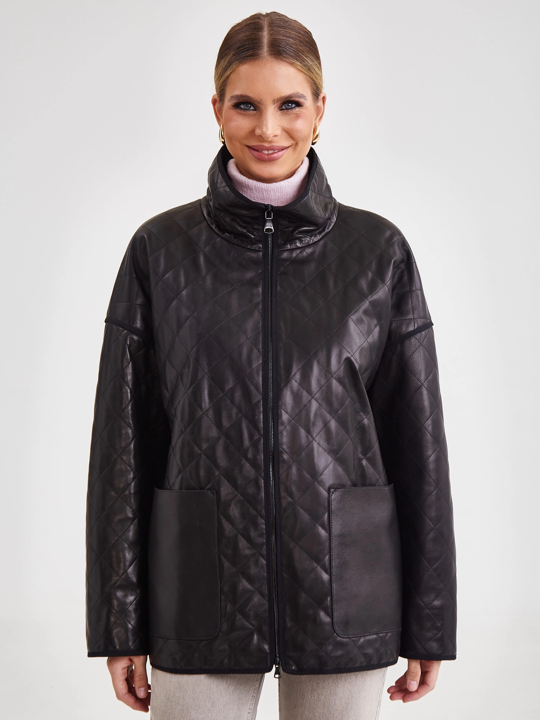Товар кожаная женская стеганая куртка премиум класса 3043, черная, размер 52, артикул 23261 выполнен из натуральной кожи с застежкой молния. Рассчитан на сезон: весна-лето. Длина изделия 70 см, силуэт прямой.