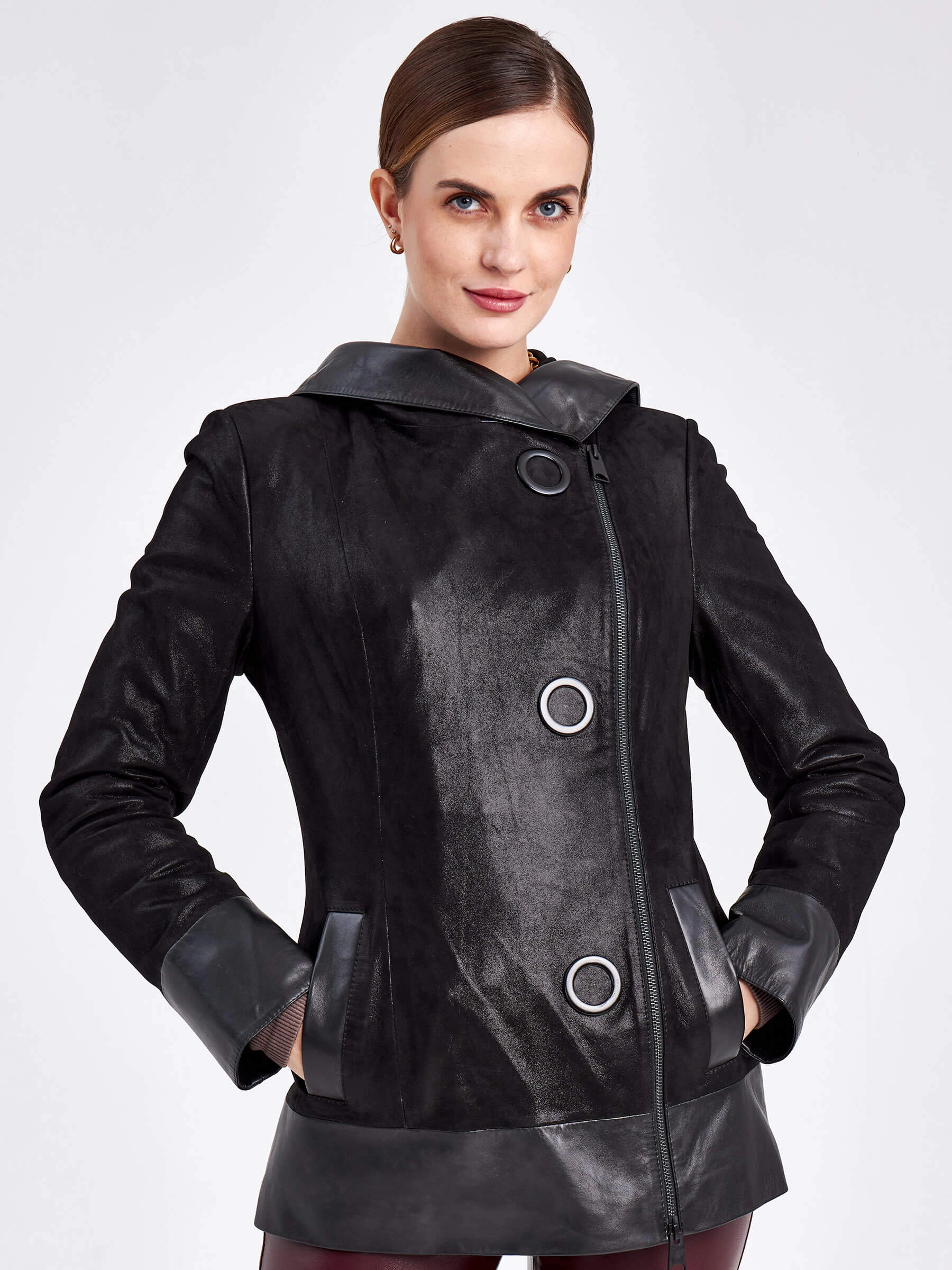 Товар женская кожаная куртка с капюшоном 333н, черная, размер 46, артикул 23050 выполнен из натуральной кожи с застежкой молния. Рассчитан на сезон: весна-осень. Длина изделия 68 см, силуэт полуприлегающий.