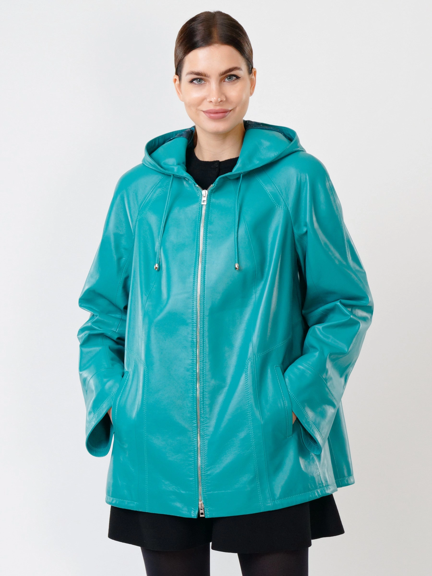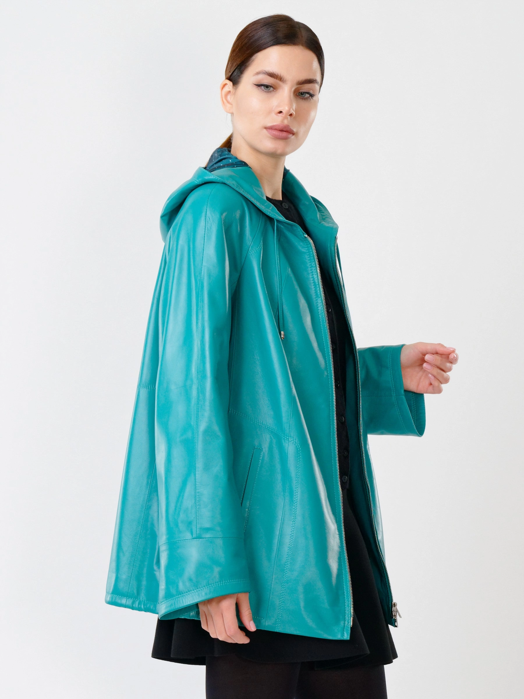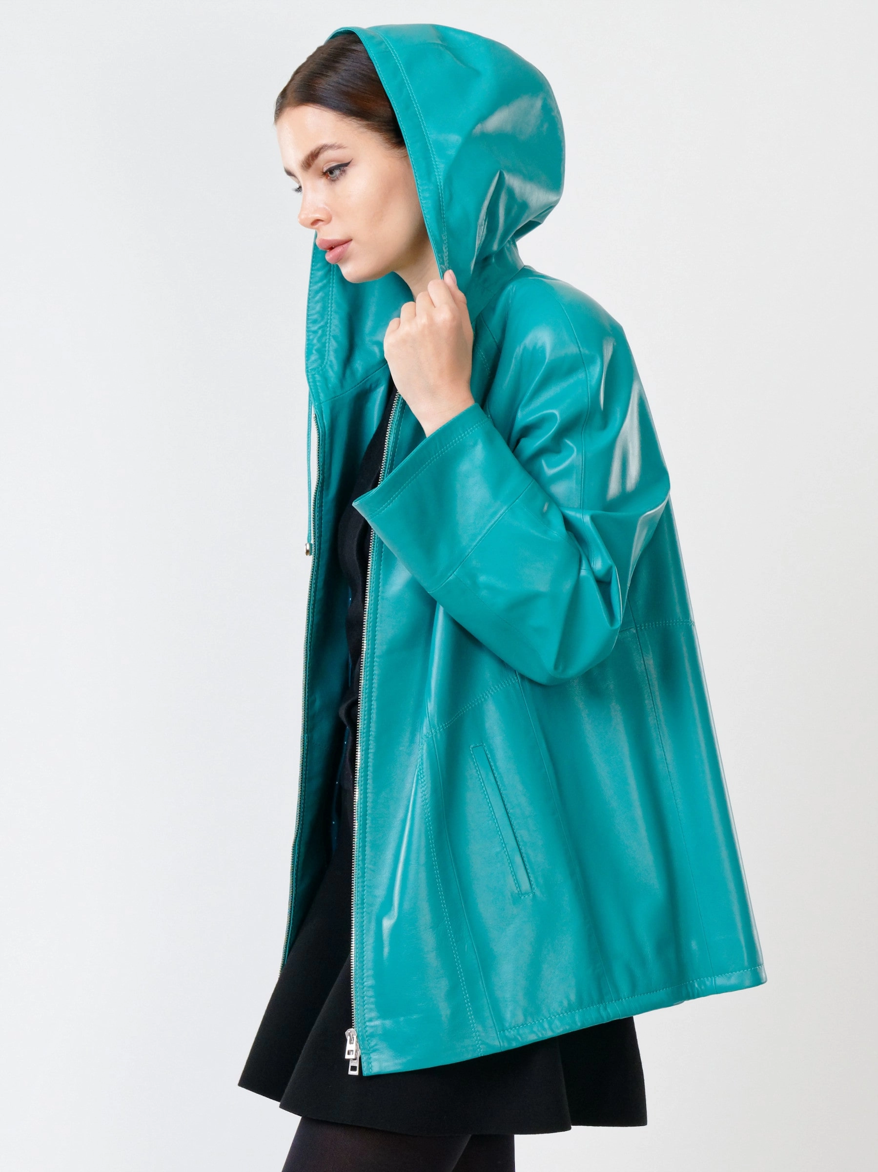 Куртка с капюшоном из натуральной кожи бирюзового цвета на молнии длиной 74 см в модном трапециевидном силуэте оверсайз. Объемный несъёмный капюшон и низ регулируются кулисками, рукава реглан дополнены манжетами-отворотами. Оснащена практичными карманами на молниях. Легко сочетается с худи, свитшотами, свободными брюками и кроссовками, создавая уверенный городской образ с акцентом на комфорт. Качество кожи — премиальное!