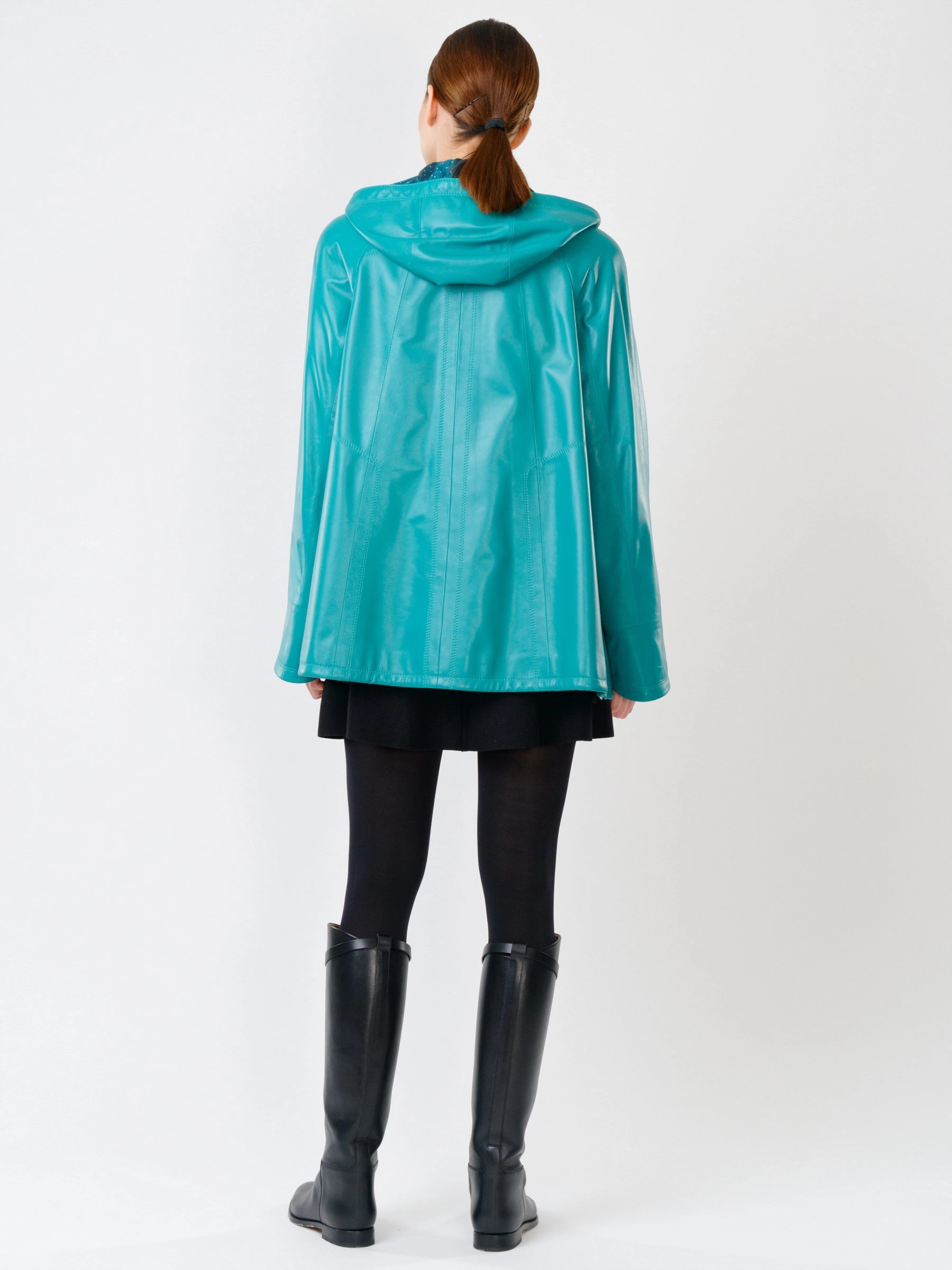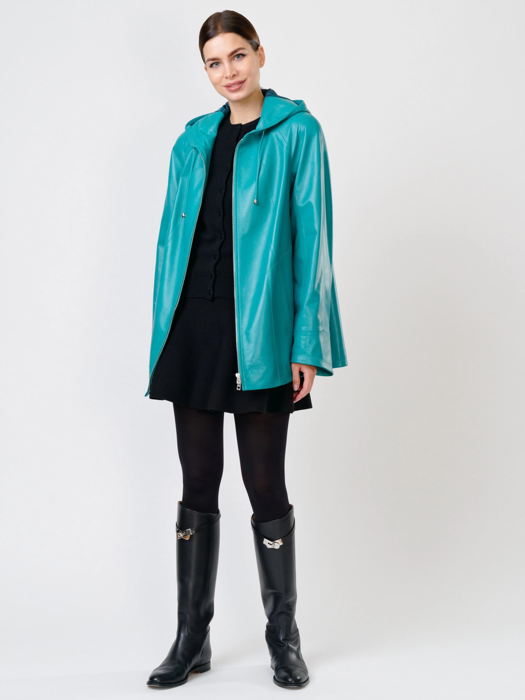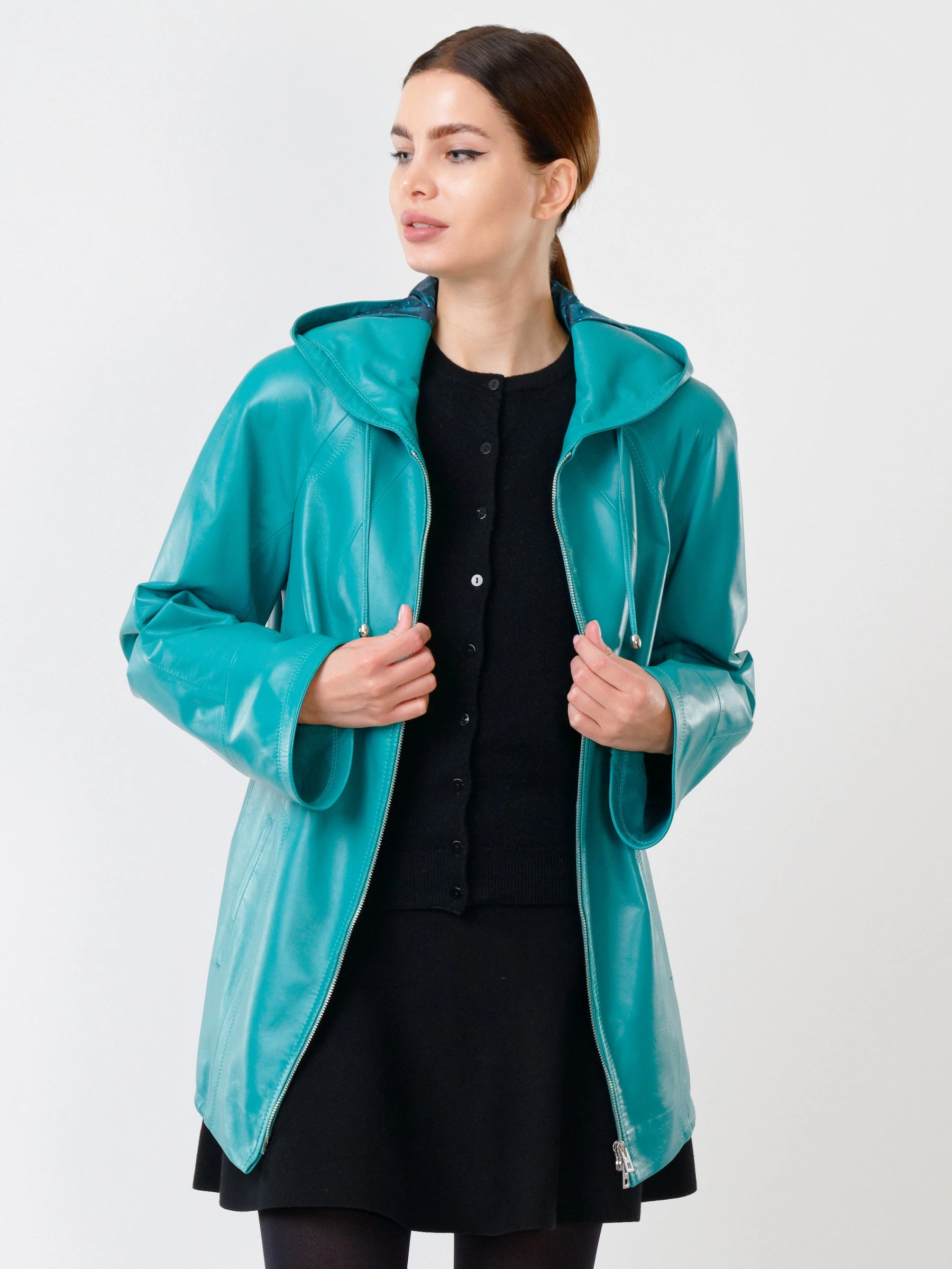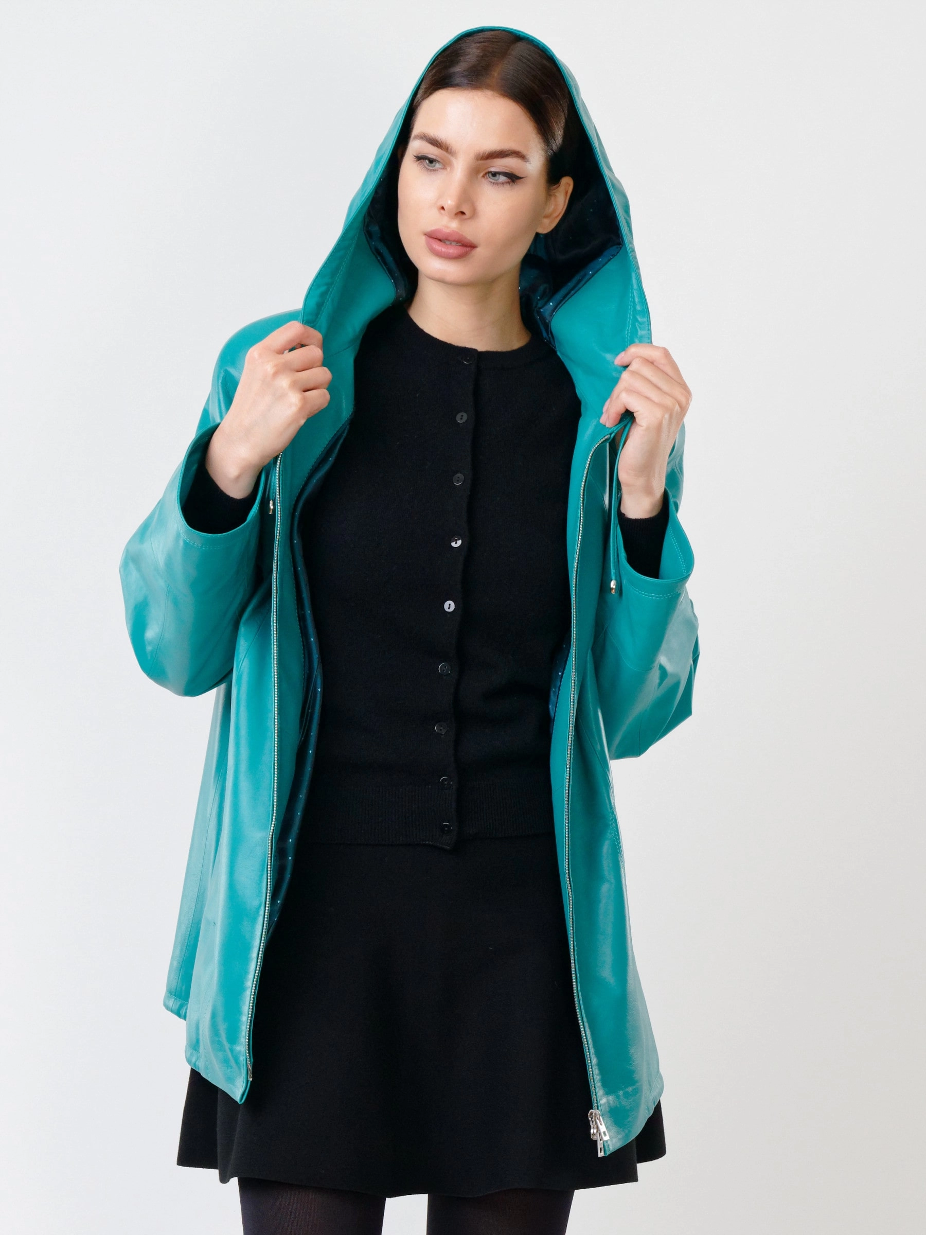 Куртка с капюшоном из натуральной кожи бирюзового цвета на молнии длиной 74 см в модном трапециевидном силуэте оверсайз. Объемный несъёмный капюшон и низ регулируются кулисками, рукава реглан дополнены манжетами-отворотами. Оснащена практичными карманами на молниях. Легко сочетается с худи, свитшотами, свободными брюками и кроссовками, создавая уверенный городской образ с акцентом на комфорт. Качество кожи — премиальное!