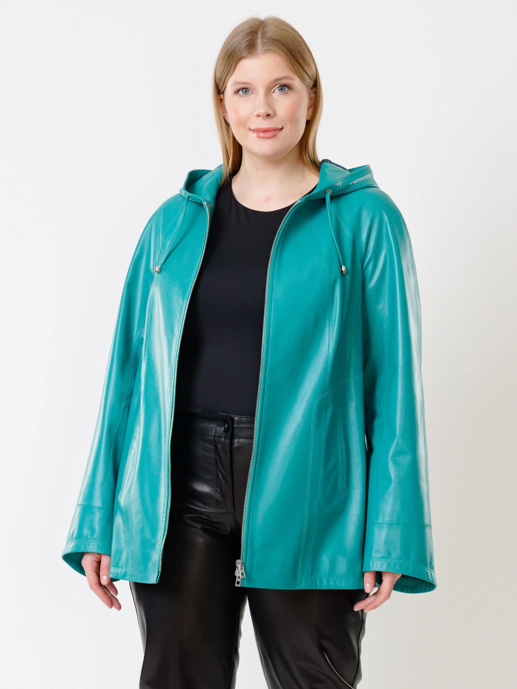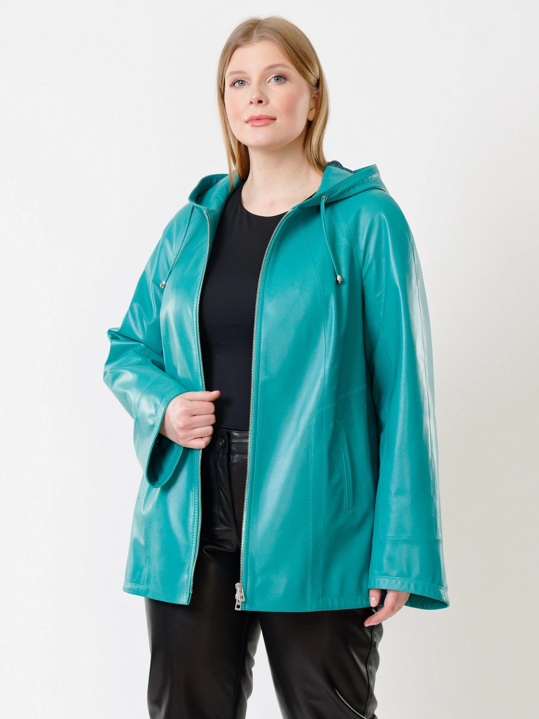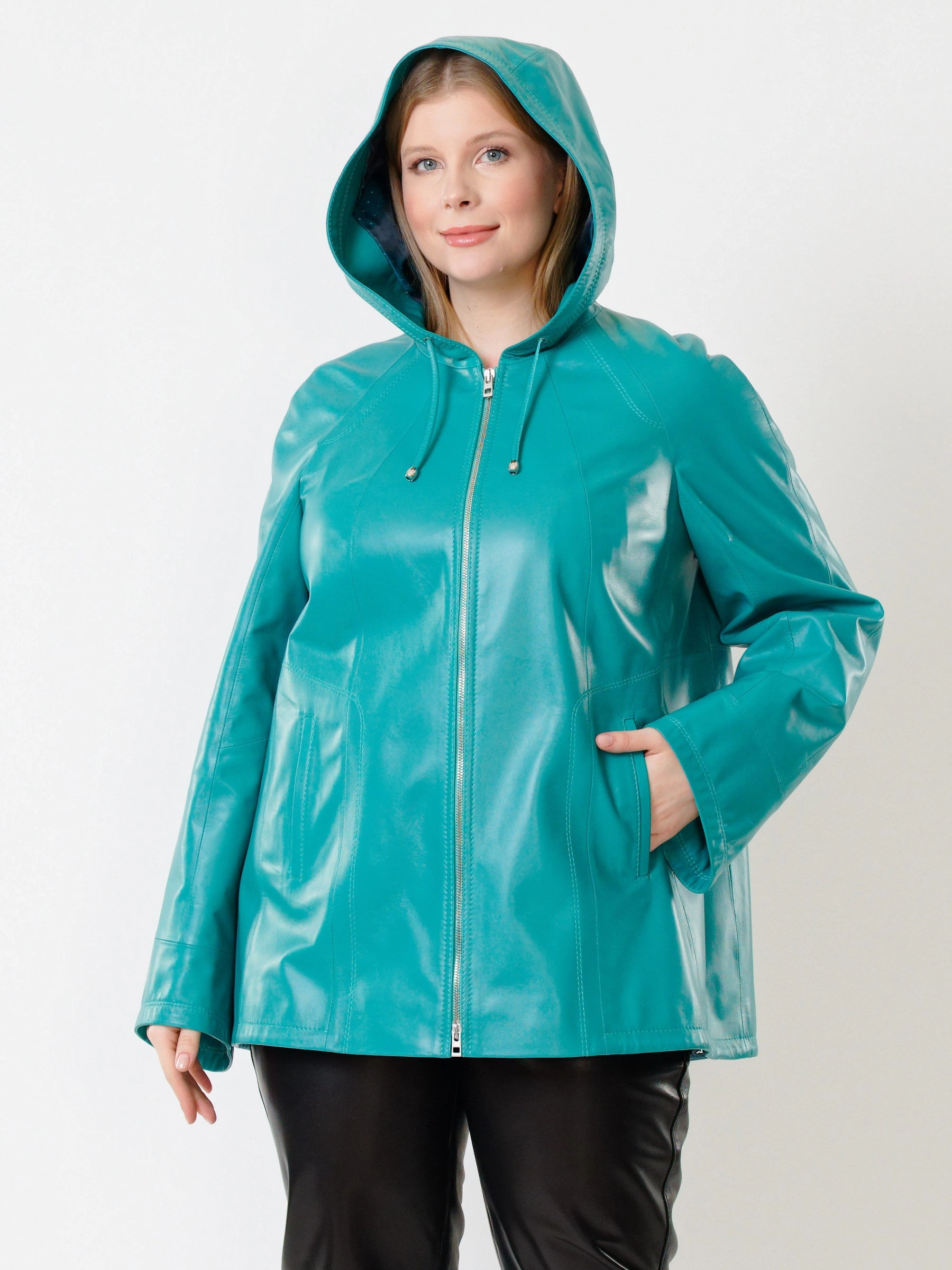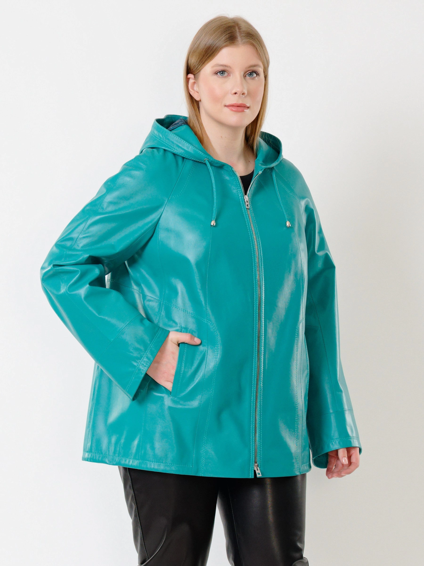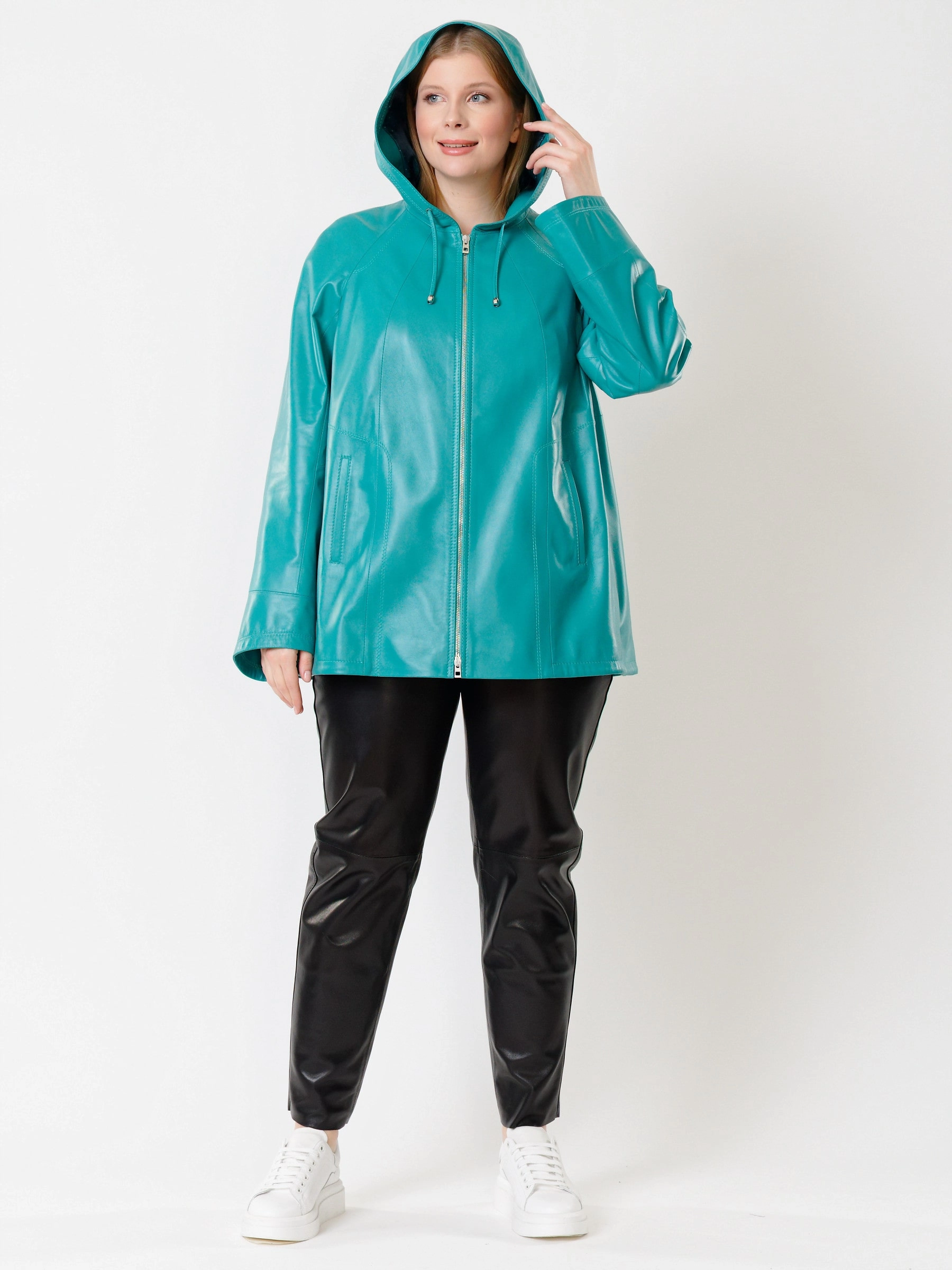Куртка с капюшоном из натуральной кожи бирюзового цвета на молнии длиной 74 см в модном трапециевидном силуэте оверсайз. Объемный несъёмный капюшон и низ регулируются кулисками, рукава реглан дополнены манжетами-отворотами. Оснащена практичными карманами на молниях. Легко сочетается с худи, свитшотами, свободными брюками и кроссовками, создавая уверенный городской образ с акцентом на комфорт. Качество кожи — премиальное!