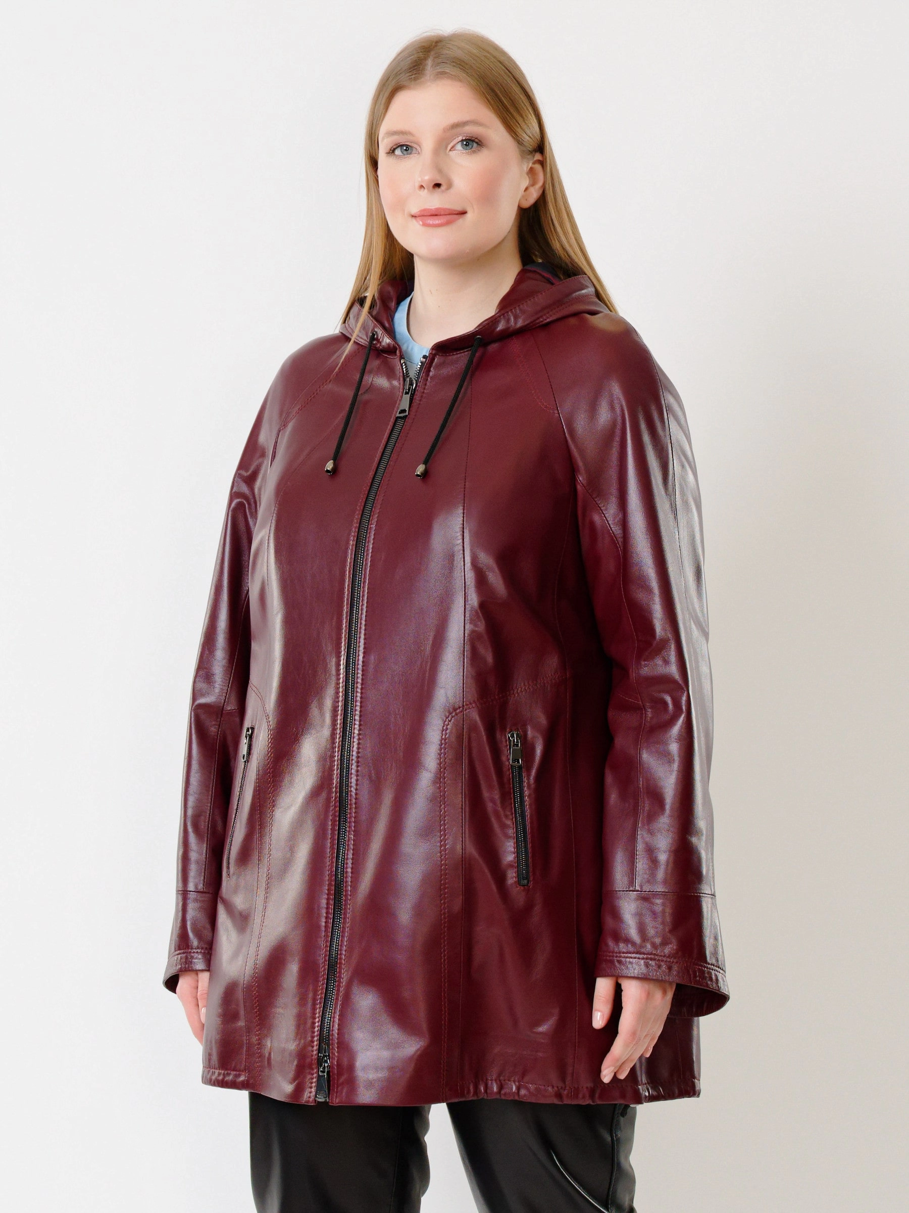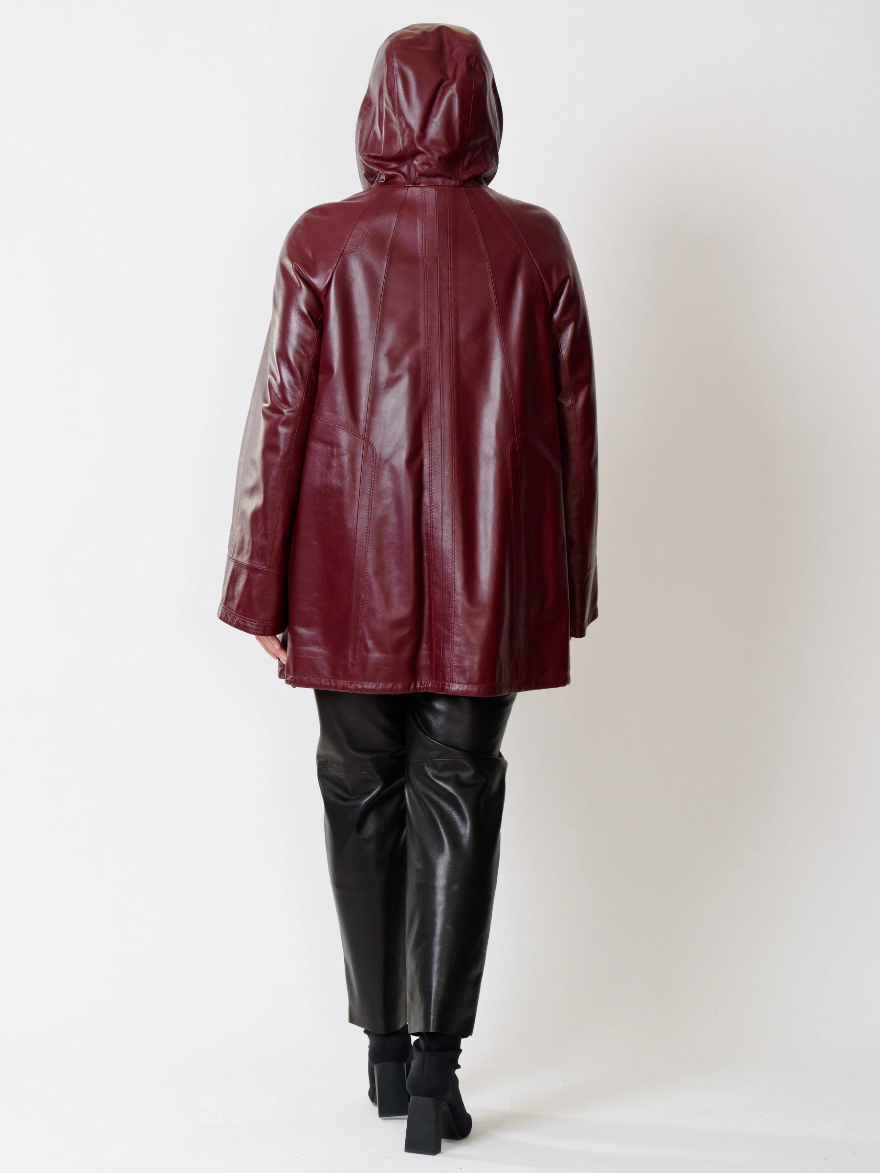 Кожаная женская куртка оверсайз с капюшоном 383, бордовая, размер 52, артикул 91301