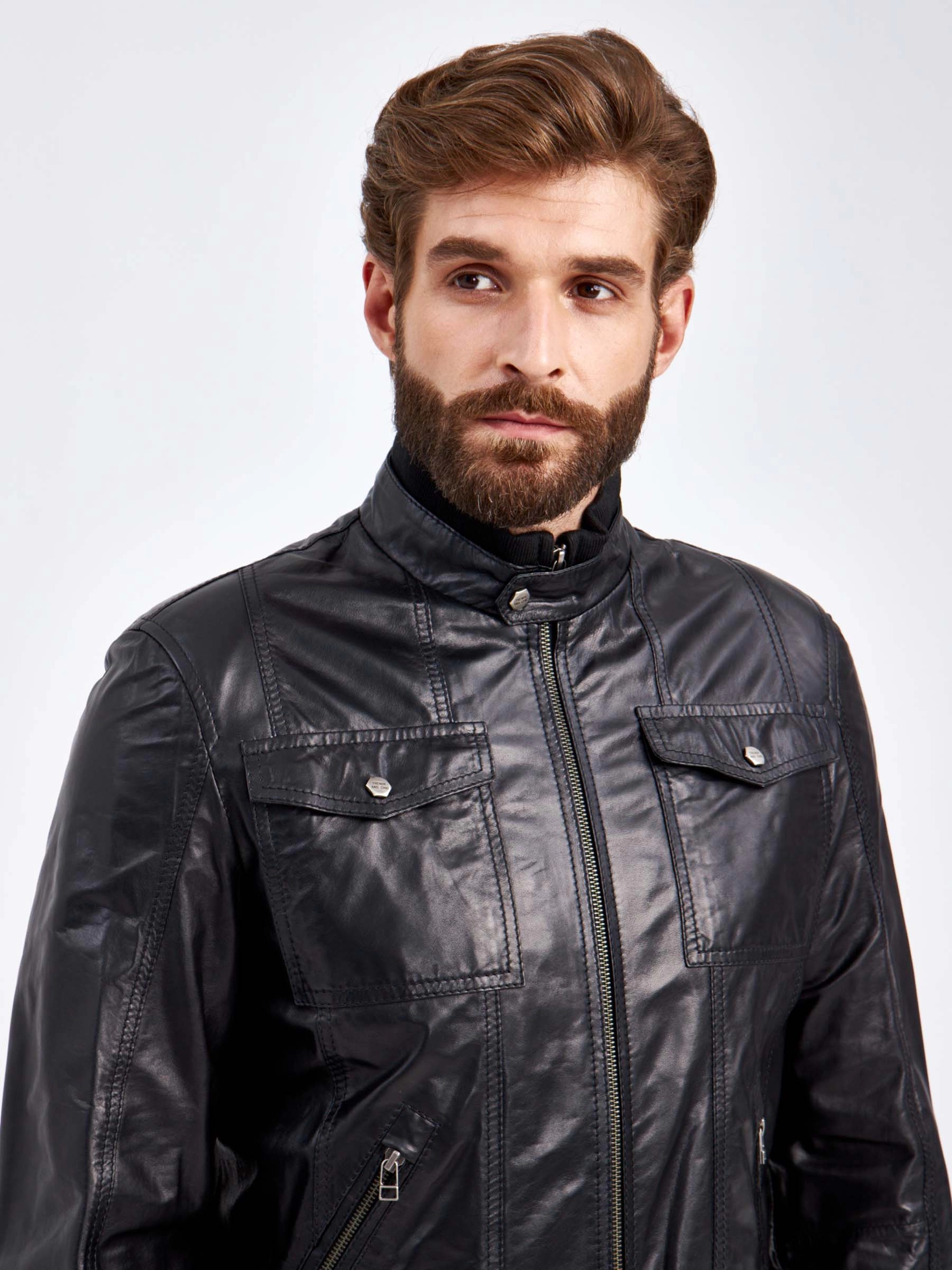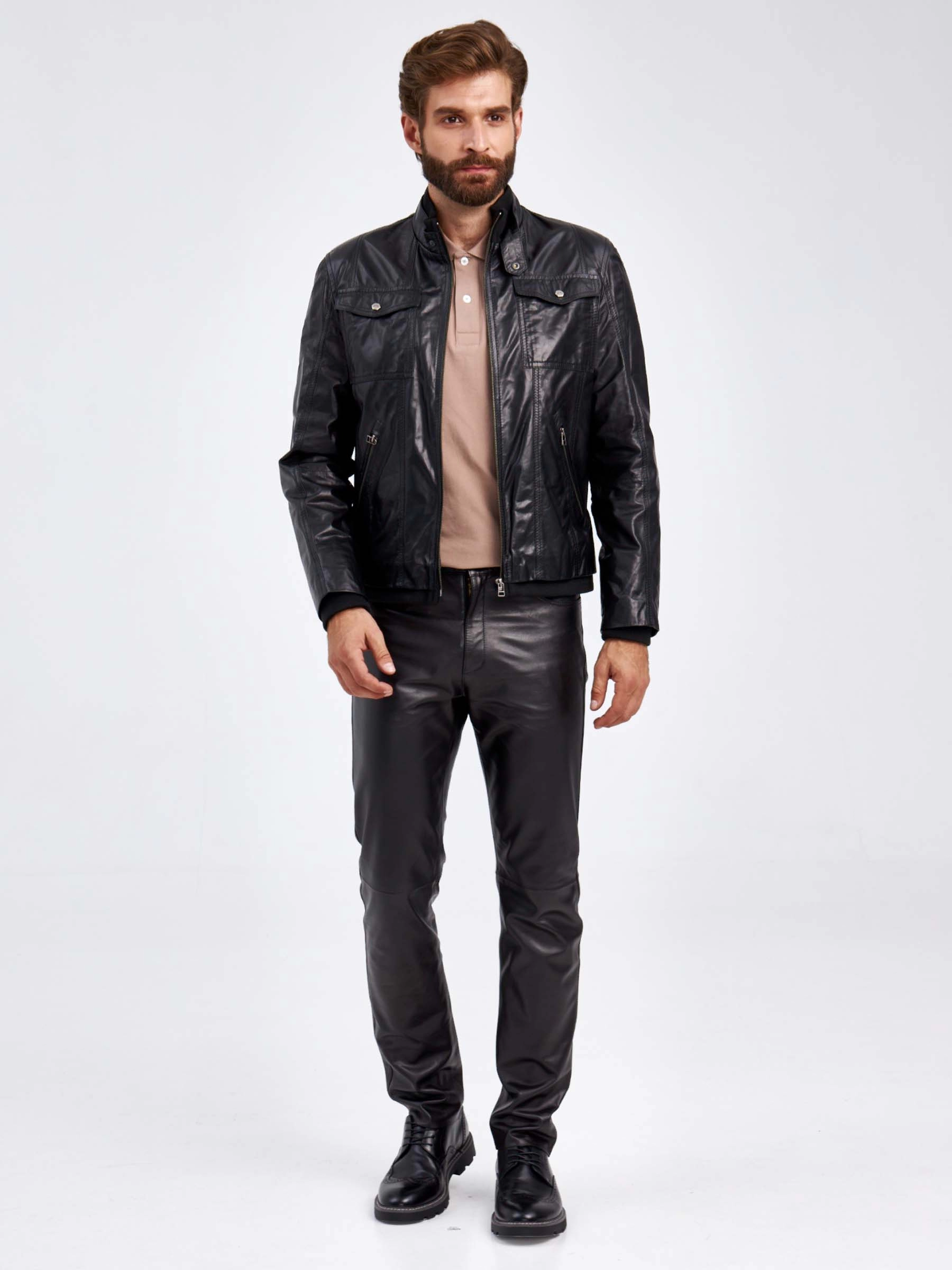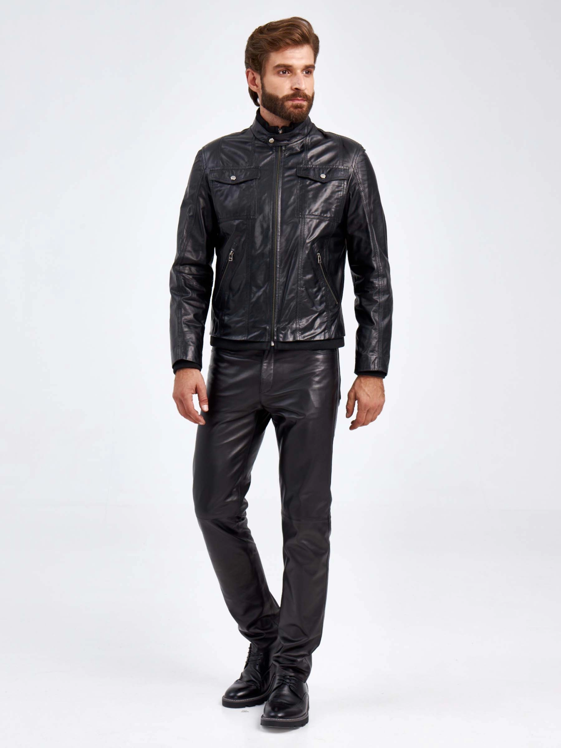 Мужская куртка в великолепной мягкой кожи-пуллап черного цвета застегивающаяся на молнию. Полуприлегающего силуэта. Двойной воротник стойка: трикотаж в тандеме с кожей. Нагрудные накладные карманы с клапанами застегивающиеся кнопками. Боковые на молниях. Пояс и манжеты модели дополнены плотной трикотажной резинкой. Идеальная посадка по фигуре.